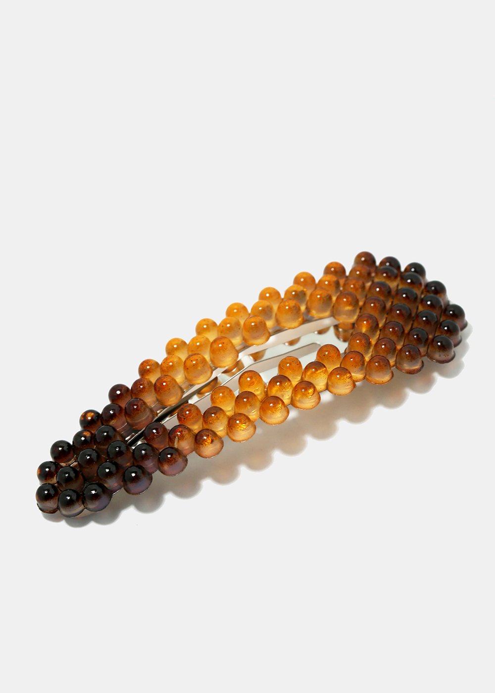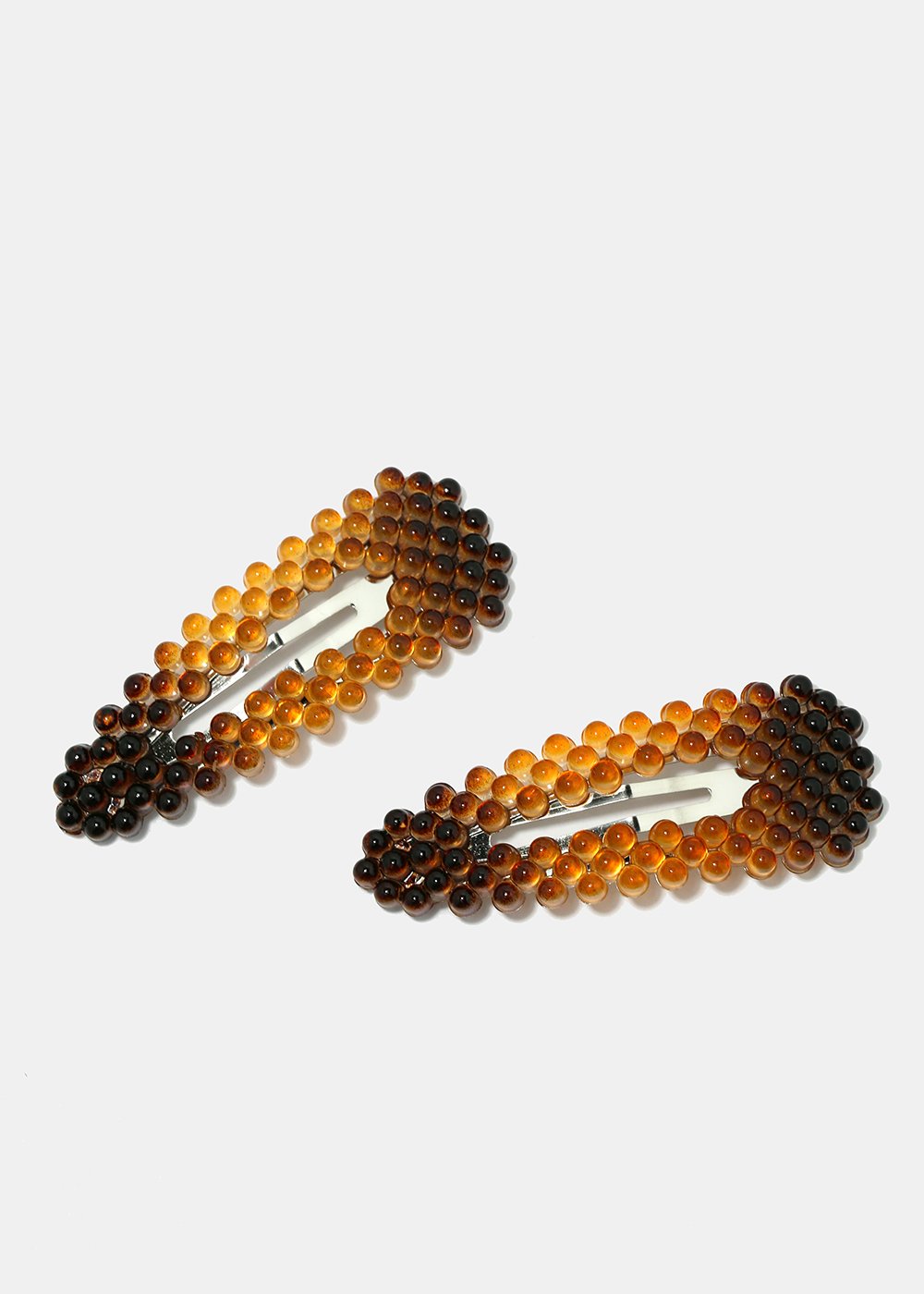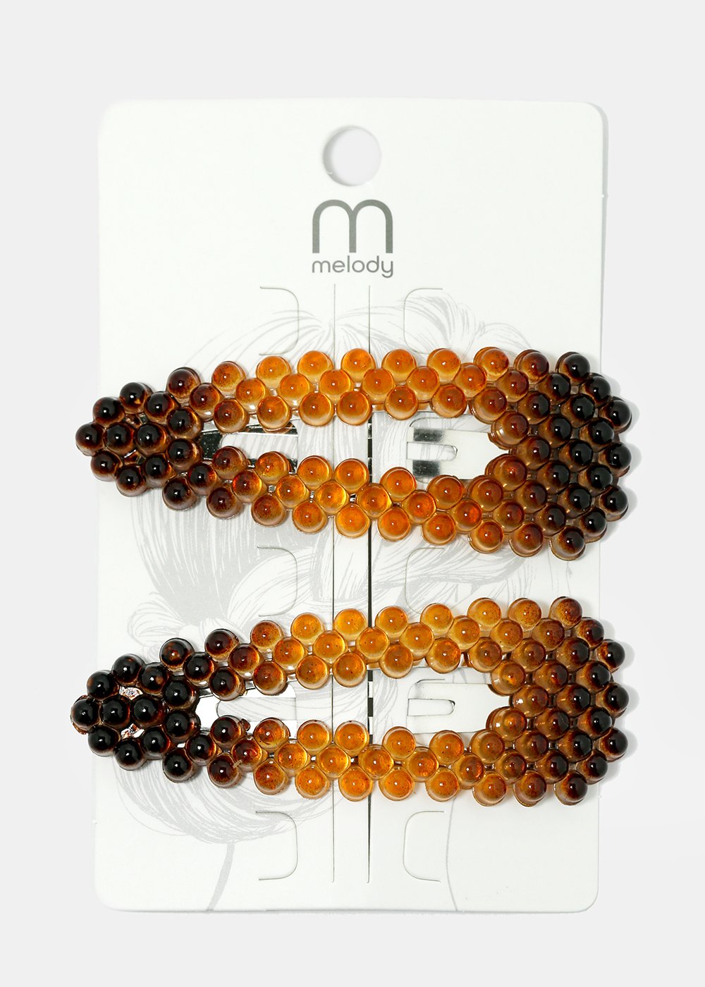 Neutral toned large dotted snaps clips in a 2-piece set. These popular snap clips are easily paired with any look from casual to glam. Keep your hair in place and give your hair a nice finishing touch. You cannot go wrong with these!