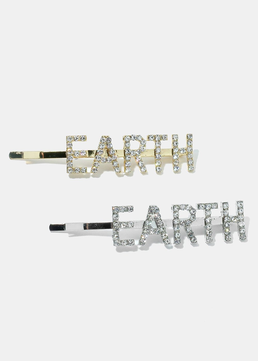 Rhinestone studded "EARTH" hair pins. Make a fashion statement everywhere you go. A unique stylish addition to your ensemble.