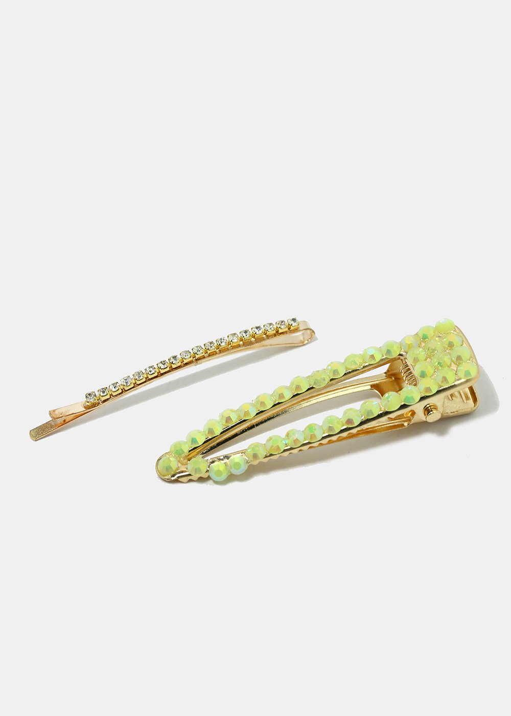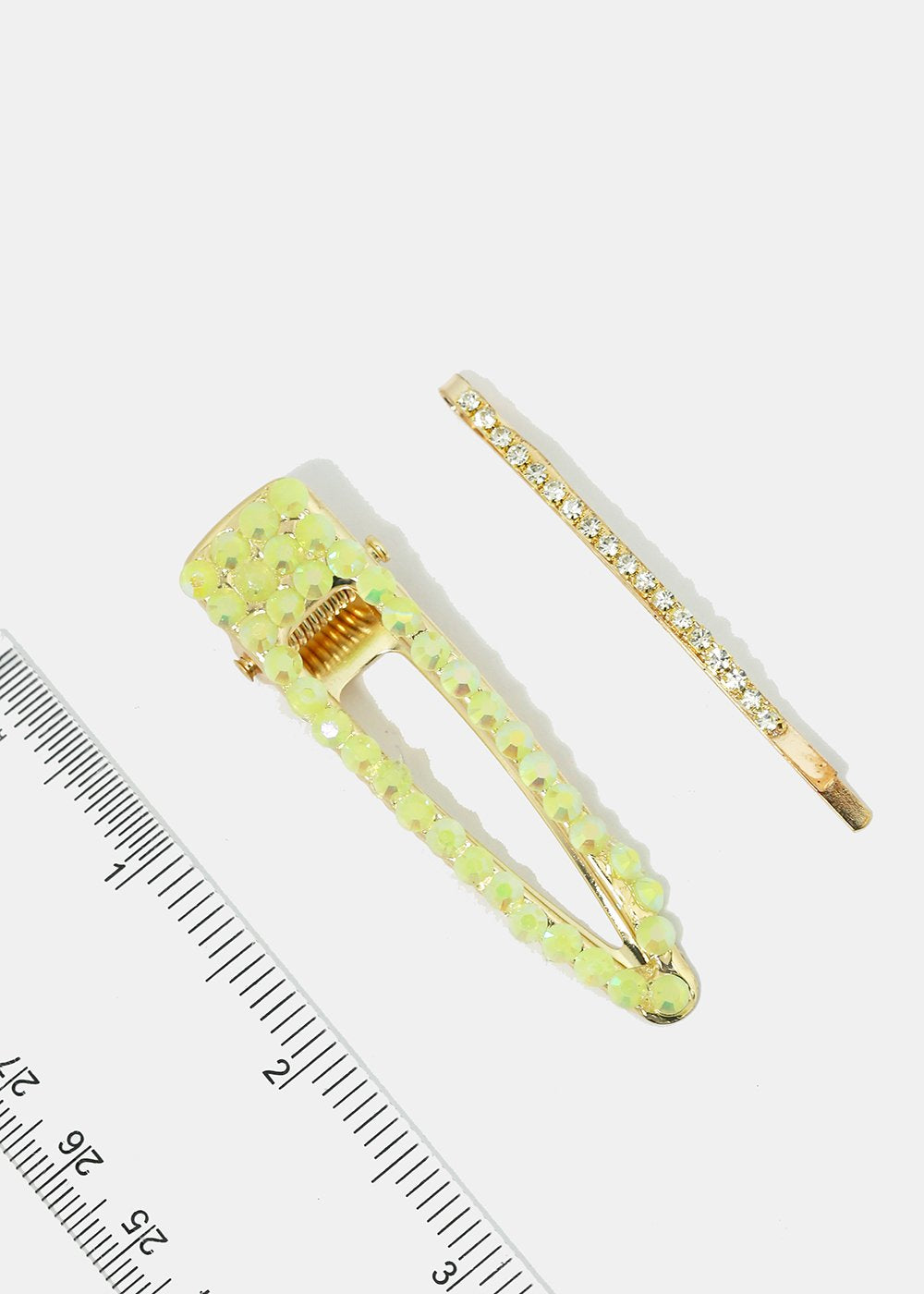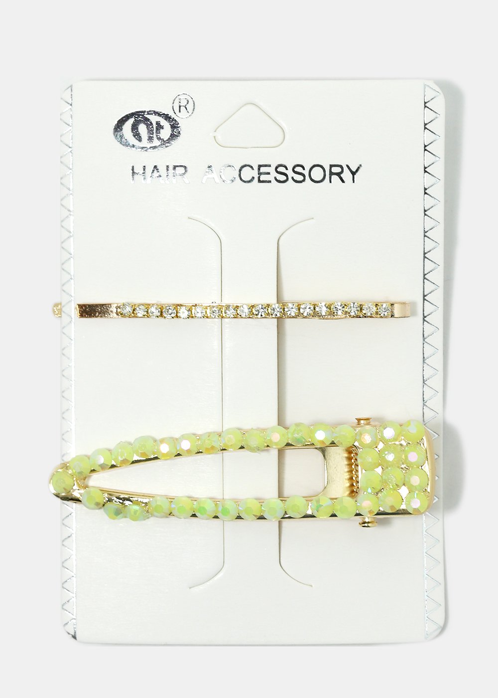 Gorgeous 2-piece gemstone hair pins including a large gleaming gemstone studded pin and a bobby pin covered in sparkly rhinestones! An essential for this years fashion trends!