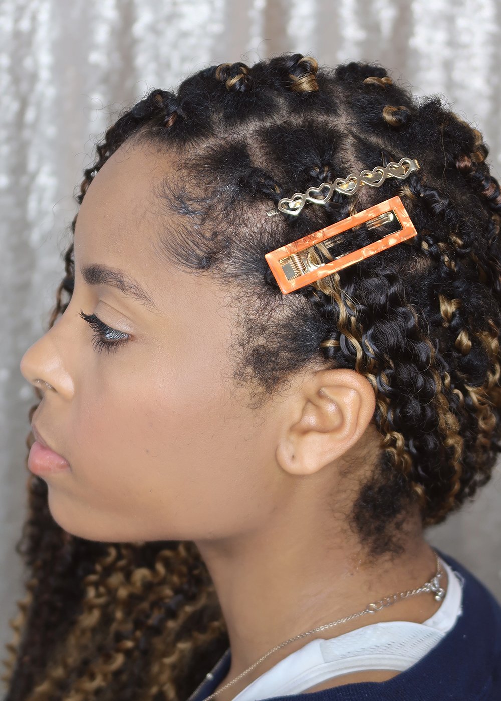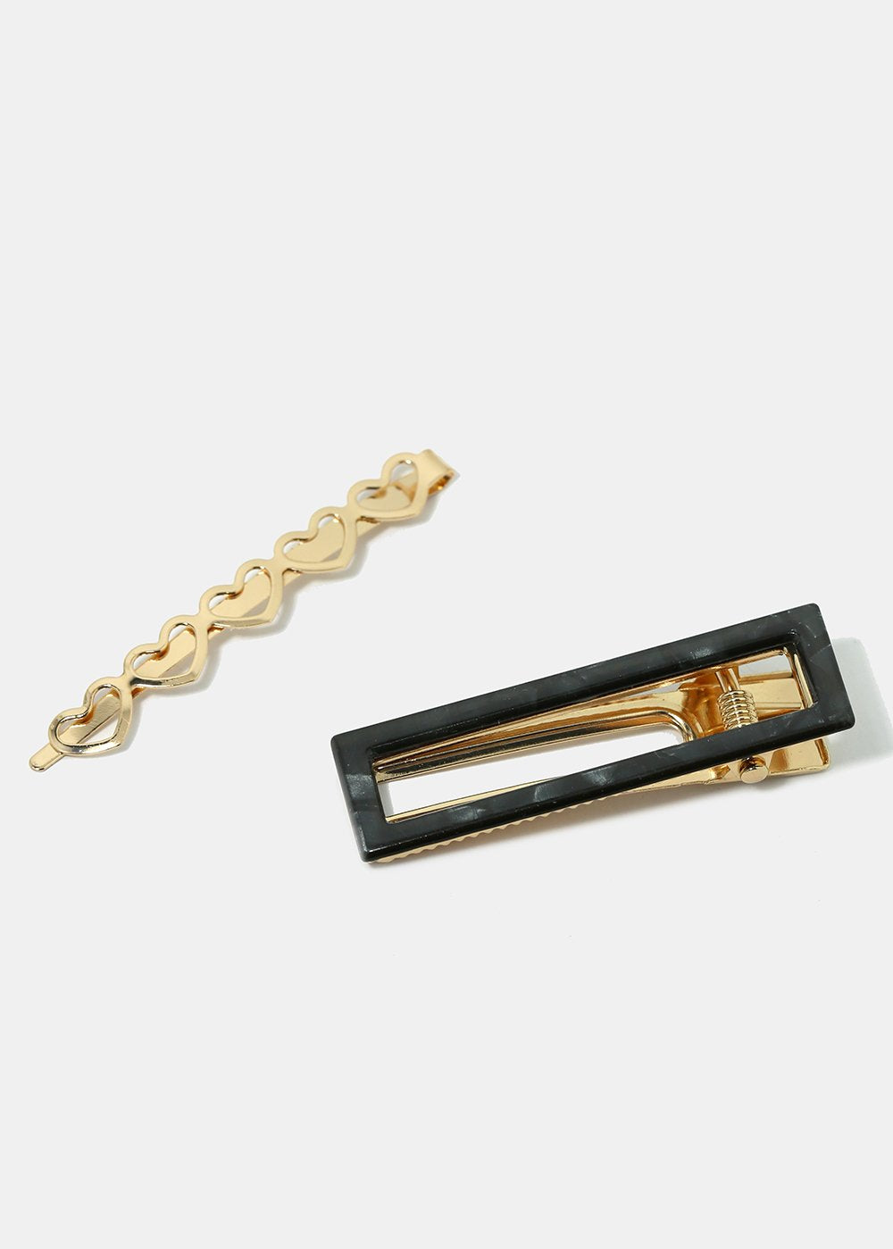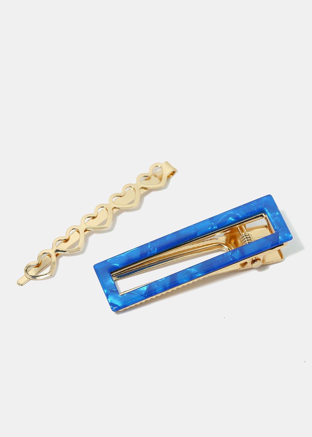 Popular hair clips in a 2-piece set featuring a heart design bobby pin and a rectangular enamel hair clip. Adds a unique pretty touch to your outfit. Get creative and style them together or separately. An essential addition to your collection!
