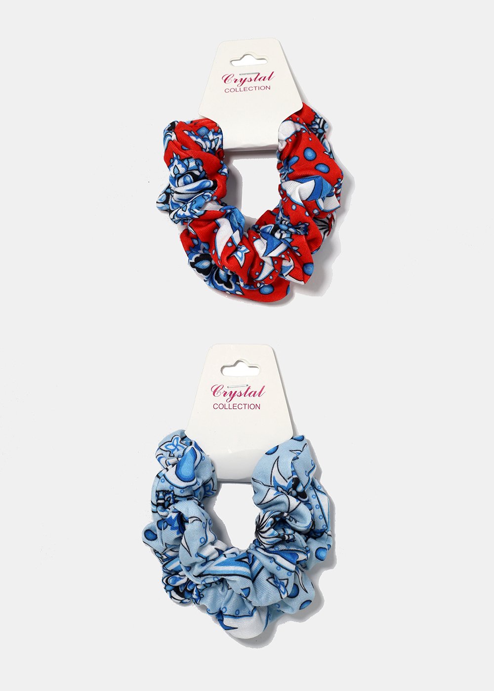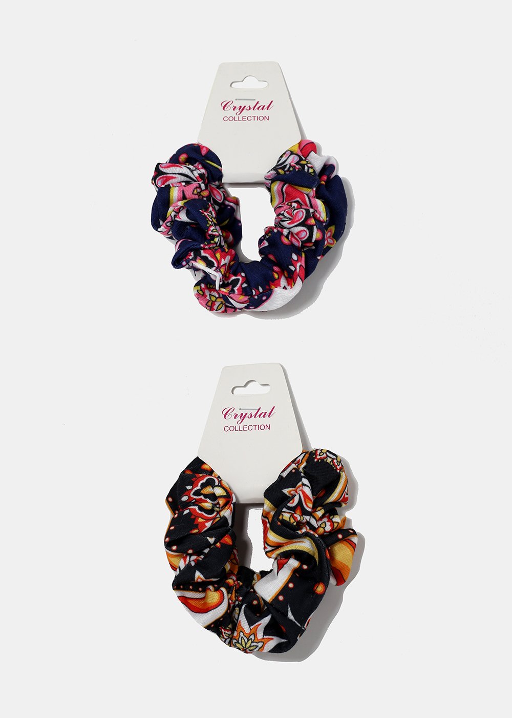 Two-piece set of soft scrunchies featuring multi-color paisley floral print. A cute addition to a ponytail or topknot!