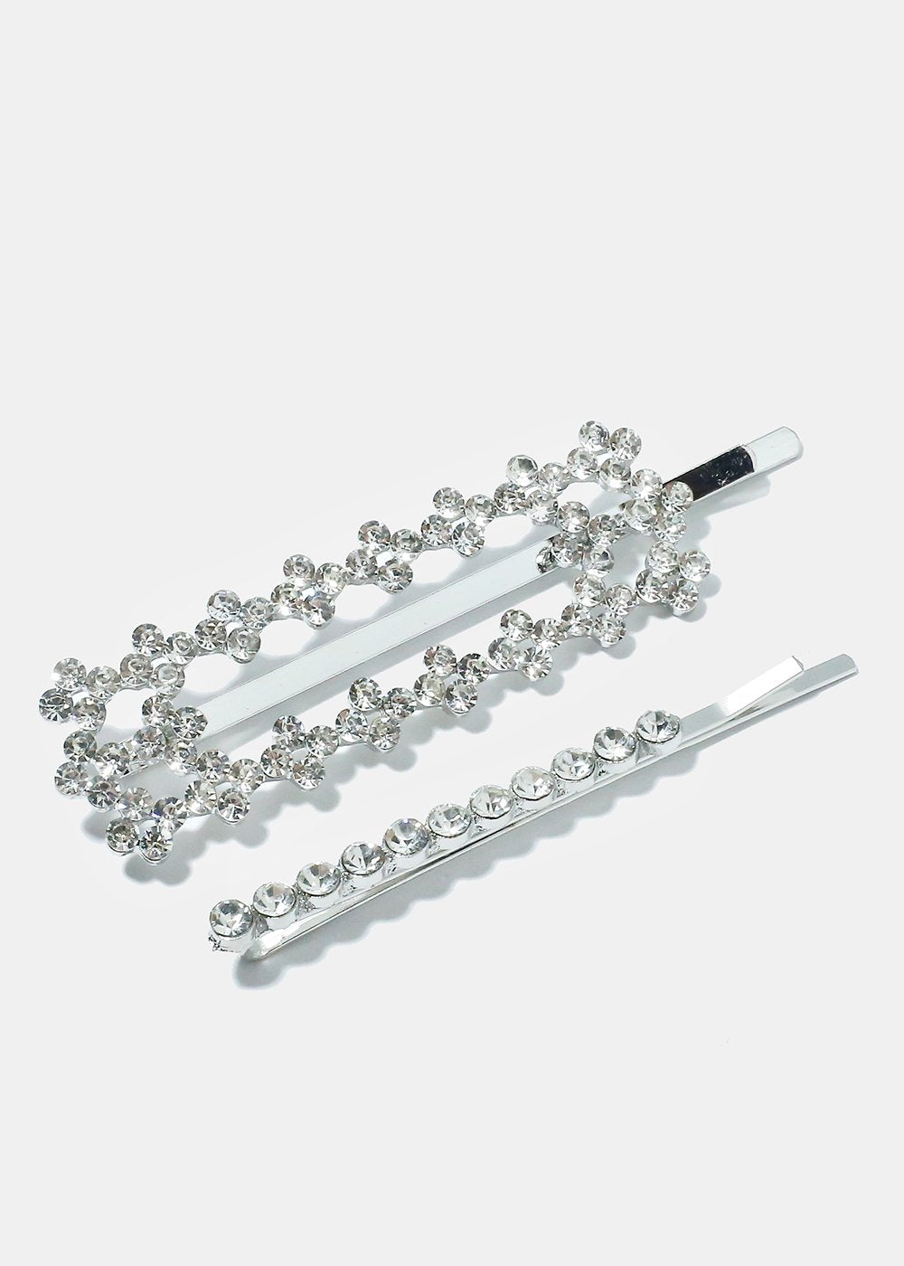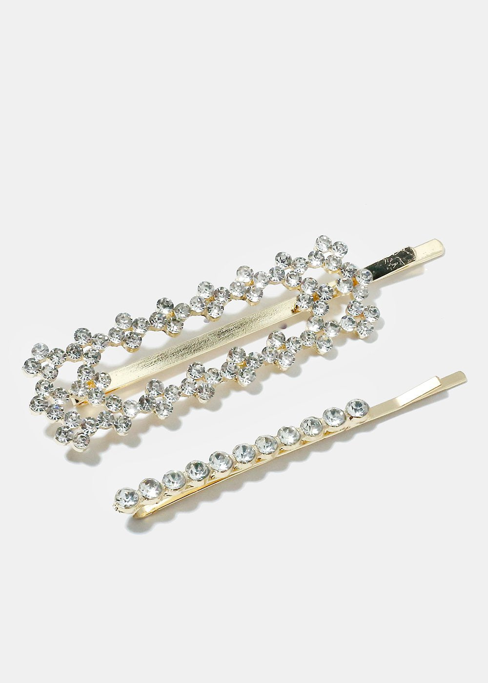 Add a sparkly touch to your ensemble with this set featuring rhinestone studded hair pins! A sweet sparkly touch to your hair-do that will instantly flatter any look!