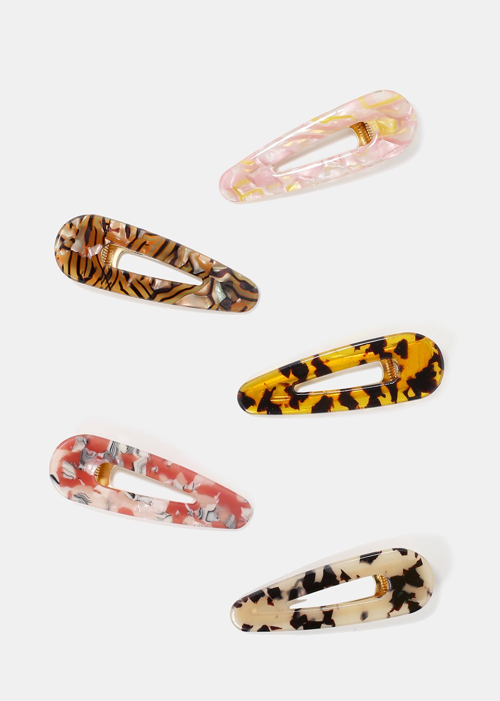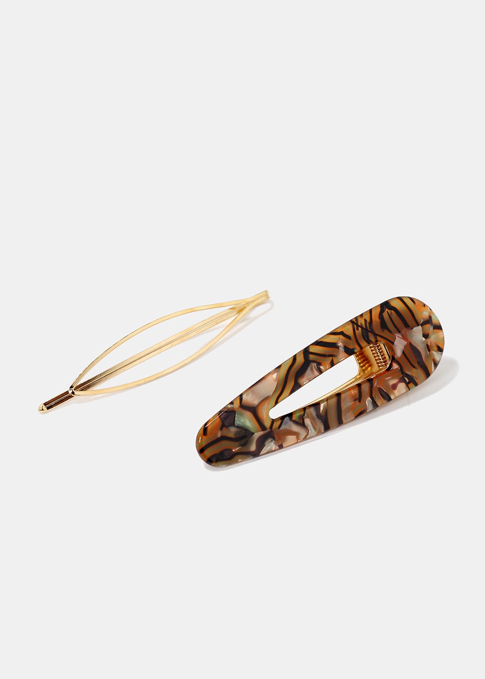 Two-piece set including metal hair pin and marbled resin alligator jaw hair clip. A chic addition to both day and night looks!
