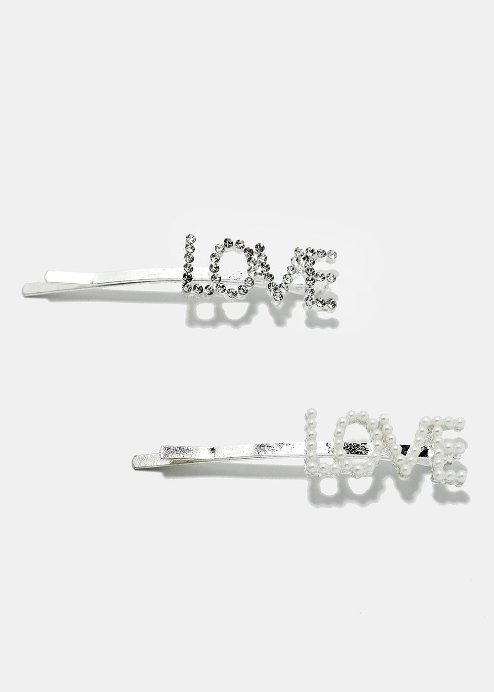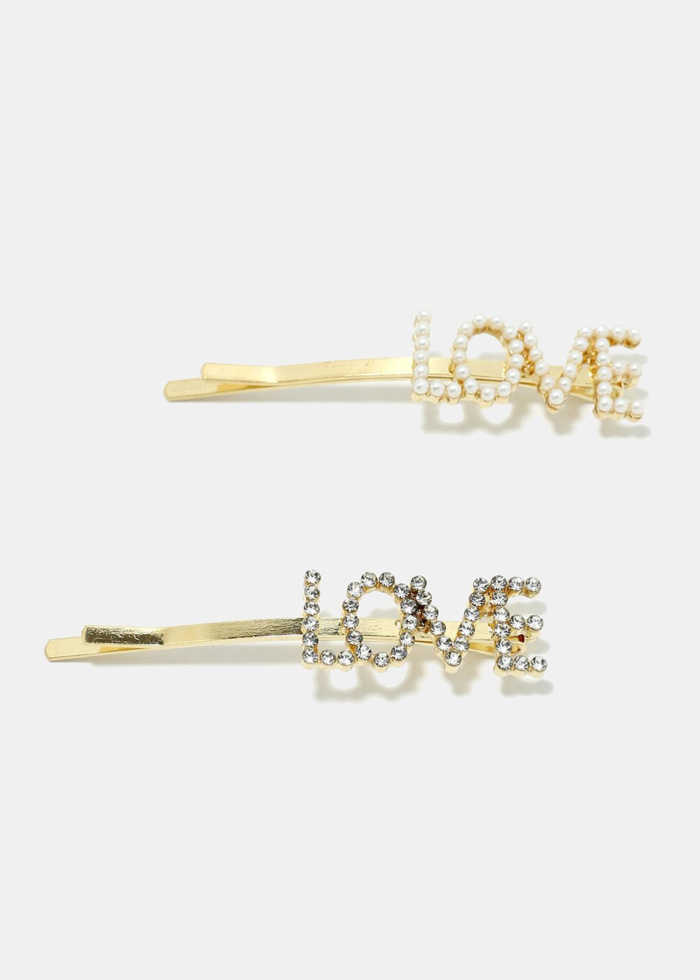 Elegant set featuring 2 piece "LOVE" hair pins in a rhinestone and pearl design. A beautiful addition to your collection that will enhance your hair-do by adding a sweet and sparkly touch.