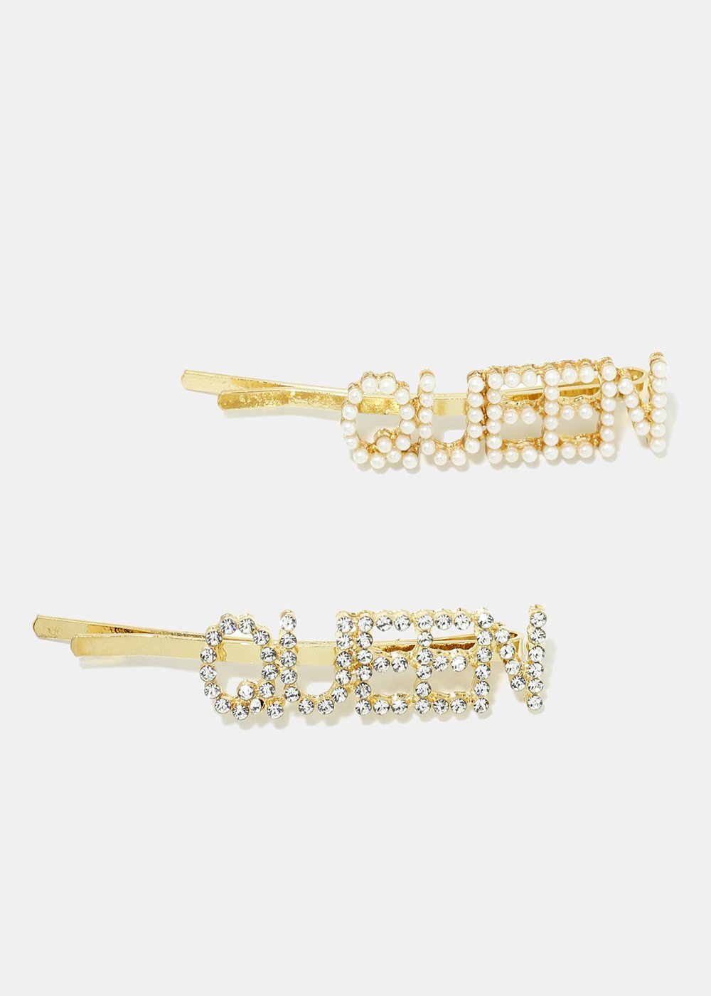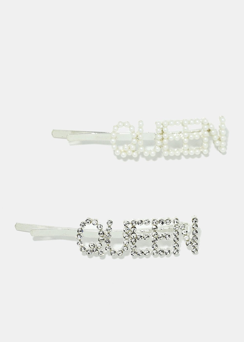 Stunning set featuring a 2-piece set of "QUEEN" hair pins in a rhinestone and pearl studded option! An elegant piece to add to your hair-do that adds a sassy yet fancy addition!