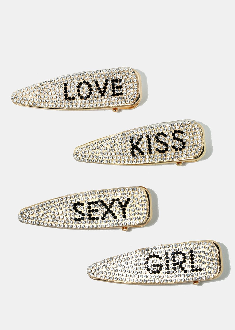 Make a fashion statement with these gleaming rhinestone studded hair pins with different words on them such as "SEXY, KISS, LOVE, and GIRL", perfect for a girls night out look!