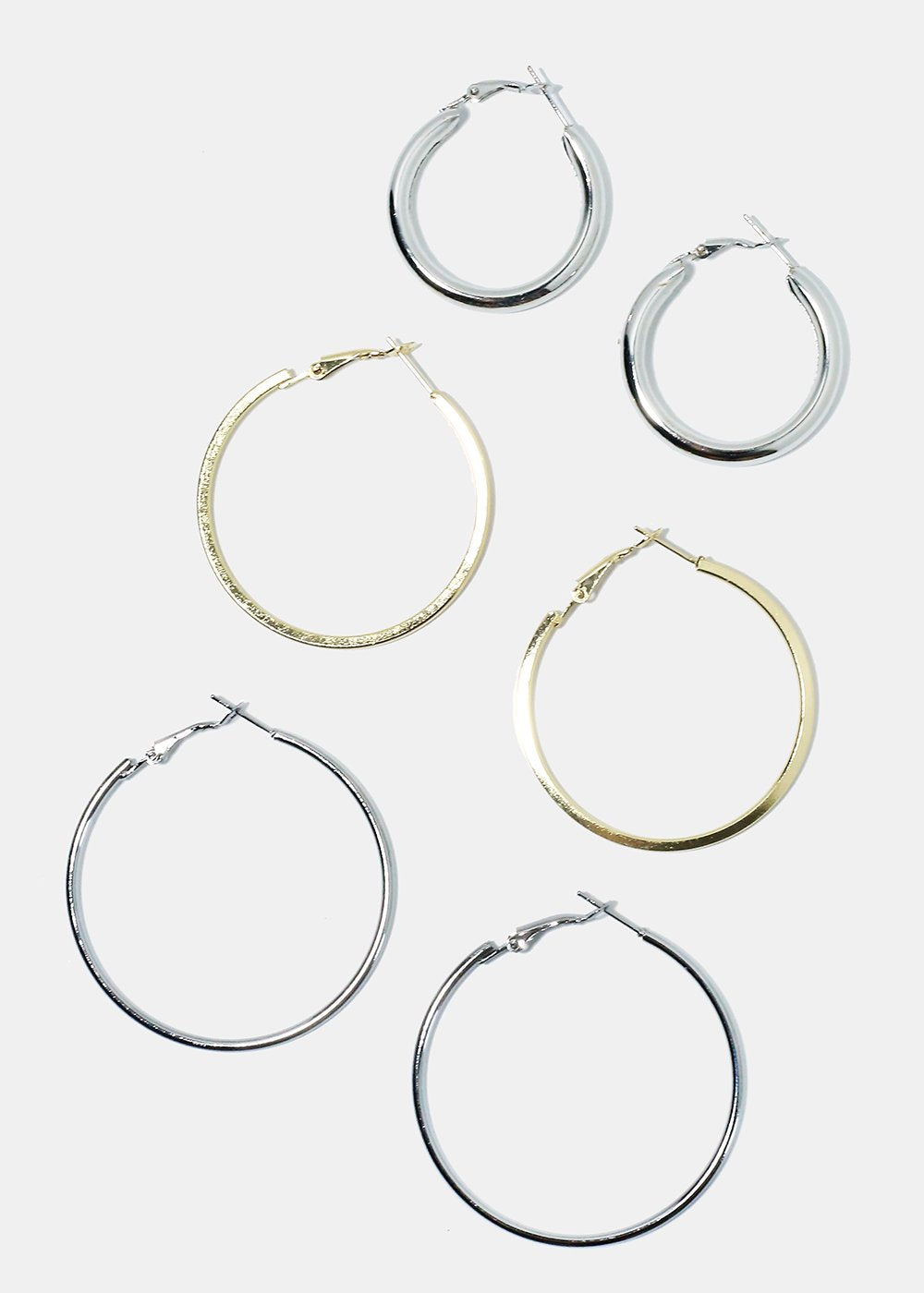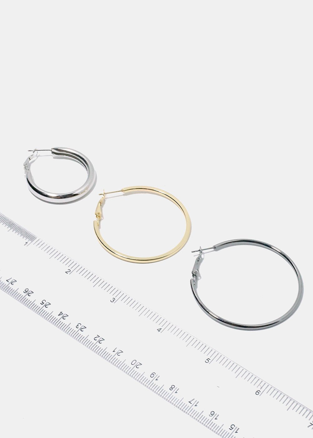 Classic set featuring 3-pairs of multi sized and multi colored hoop earrings. Perfect set to add to your collection that has all your basic essential needs that can be paired with casual to going out looks!