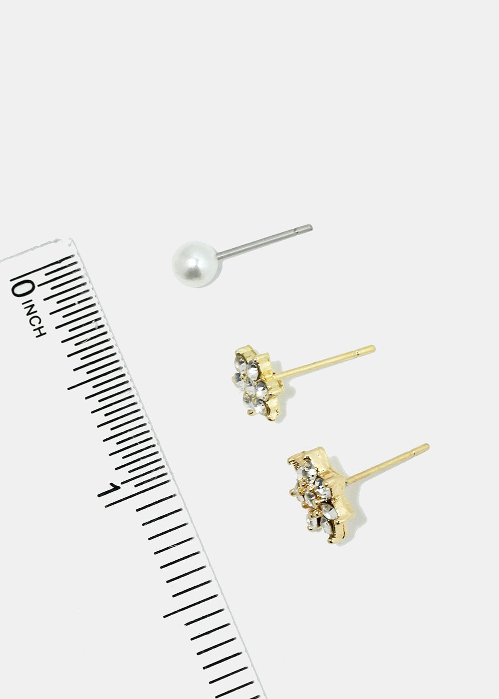 Fabulous 3-pair set of rhinestone studded flower design earrings and pearl studs. Perfect for your everyday wear to add a hint of sparkle to your looks! Simple yet stunning for your earring collection!