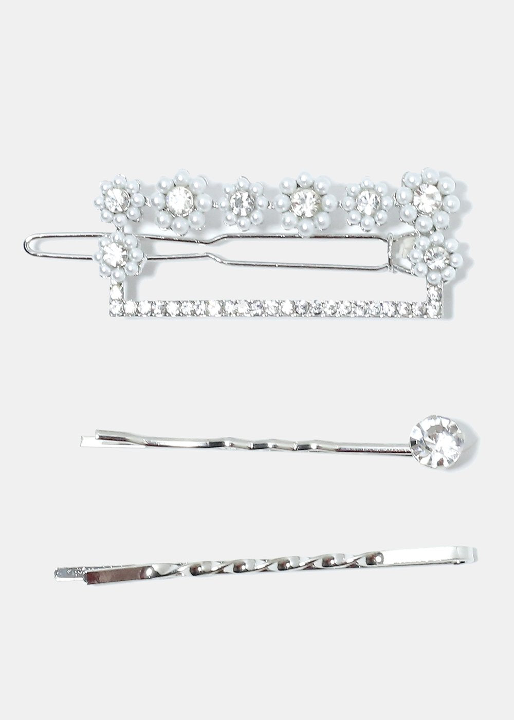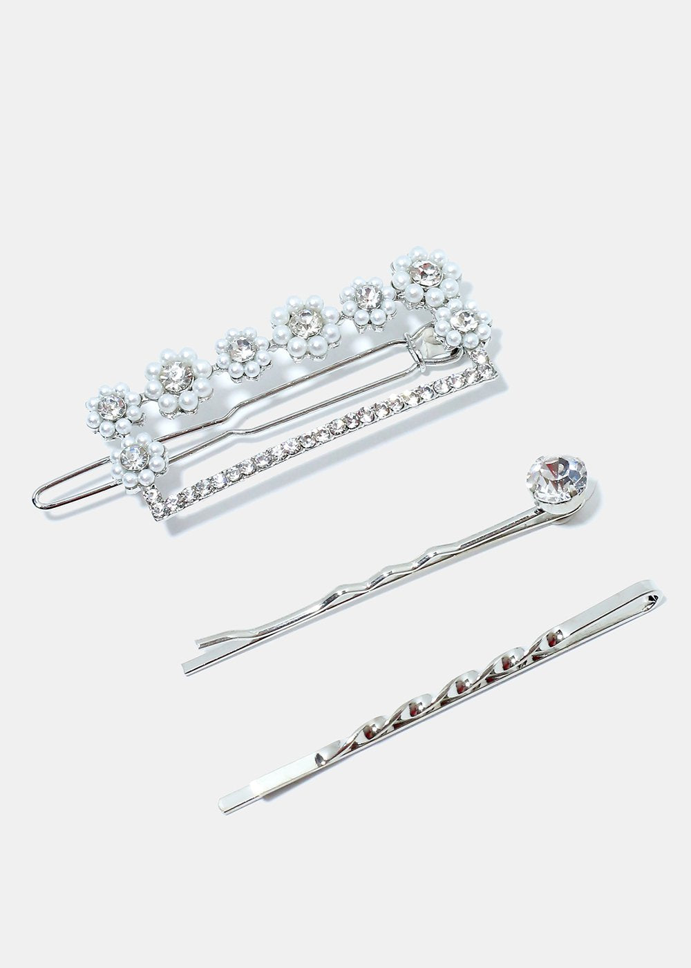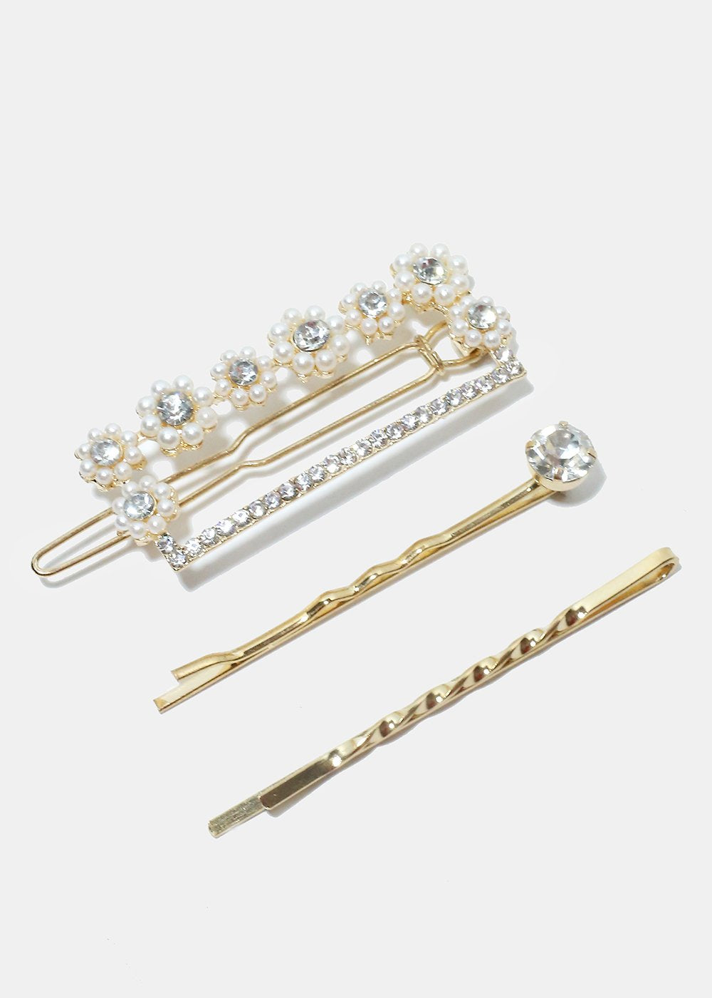 Chic 3-piece flower, pearl, and rhinestone hair pins! A girly stylish touch to your hair-do that will add a pretty sparkly touch to your whole ensemble!