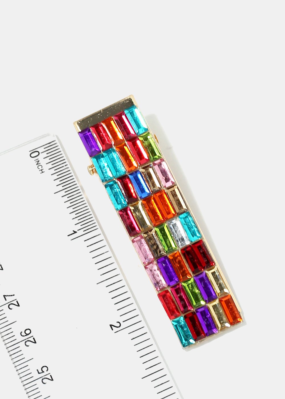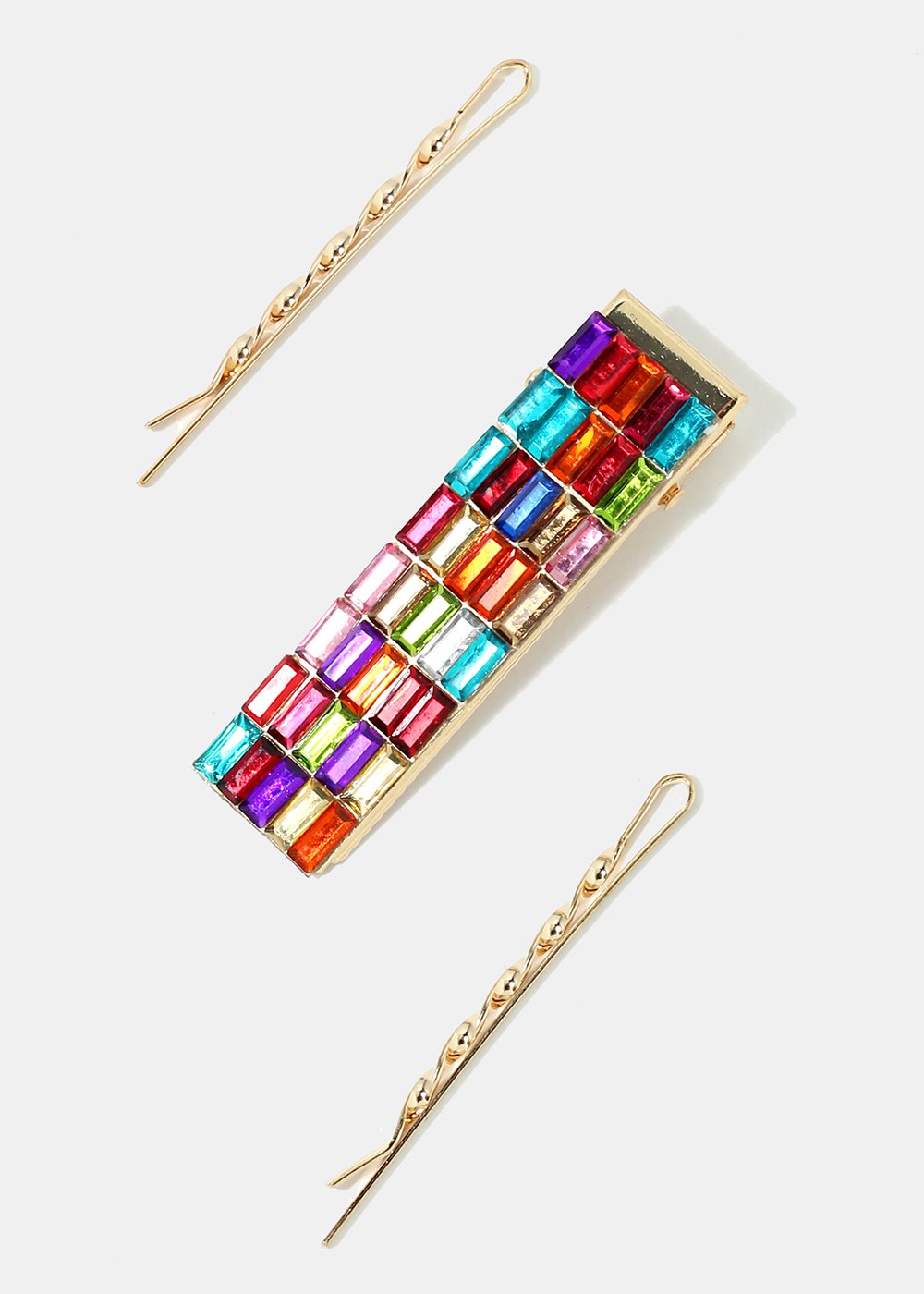 Dare to sparkle with this multicolored gemstone studded rectangular hair pin and 2 gold metal bobby pins with a twisted design. A bright and beautiful colorful addition to your ensemble. Pair them together all at once or separately!