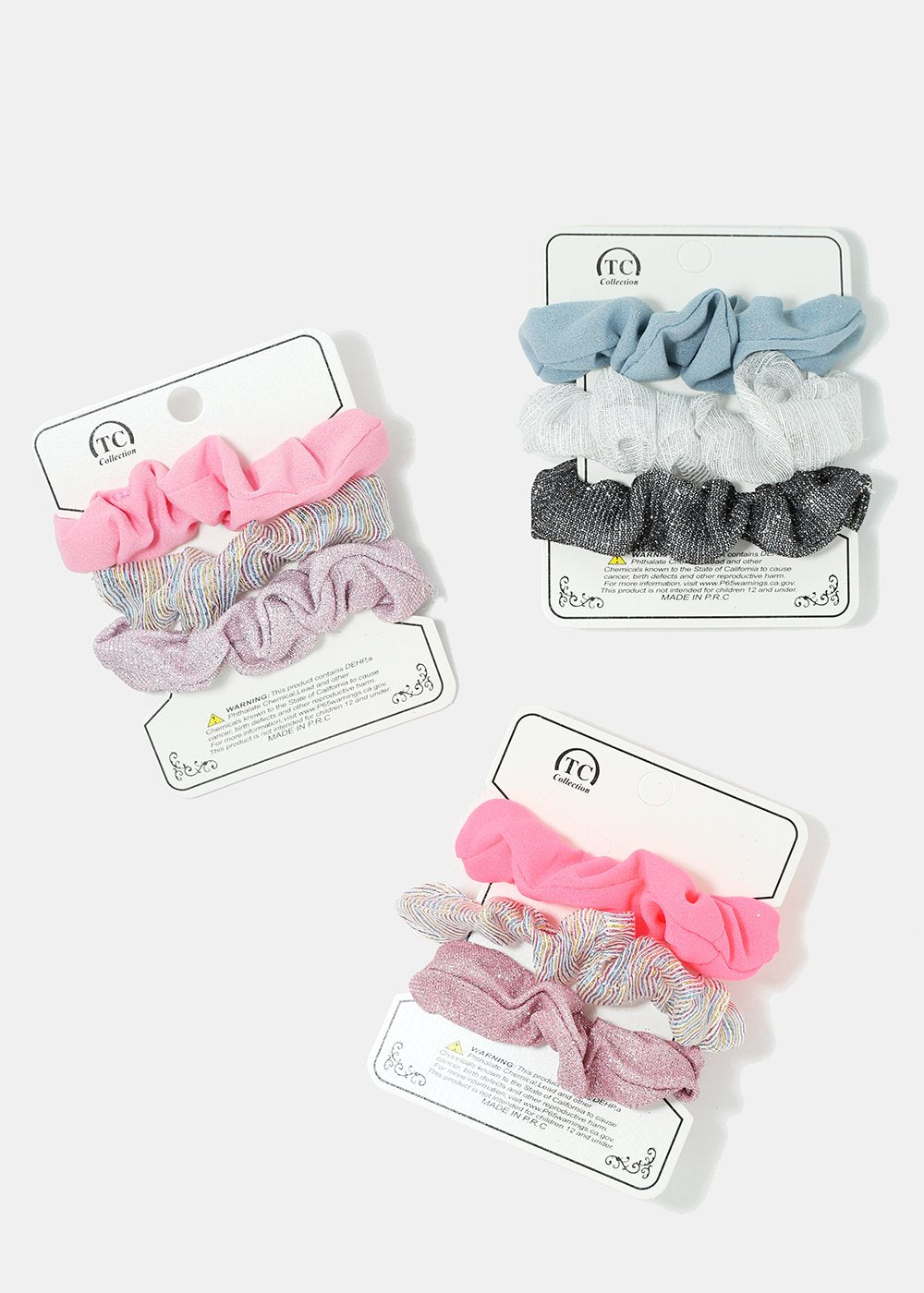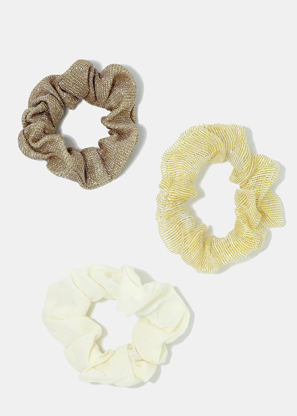 3-pair of multi color and multi designed scrunchies. A great way to stock up on your ponytail collection that adds a pretty pop of color to your hair-dos!