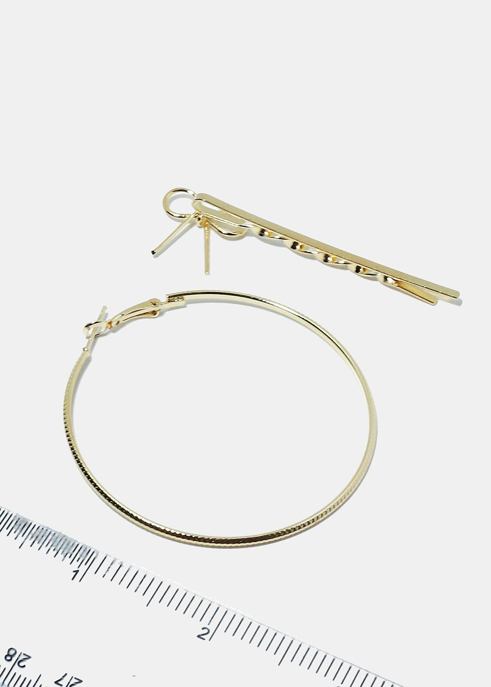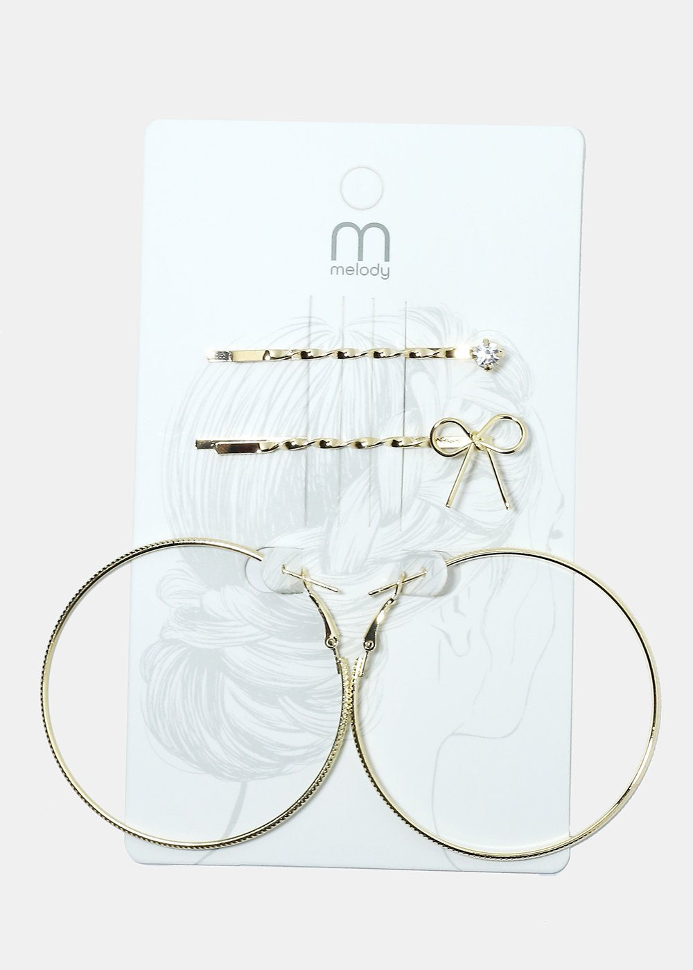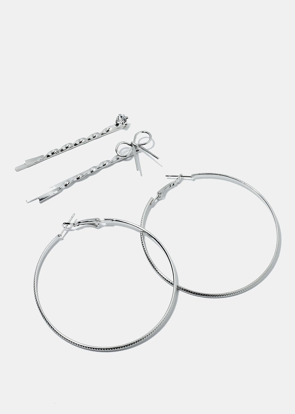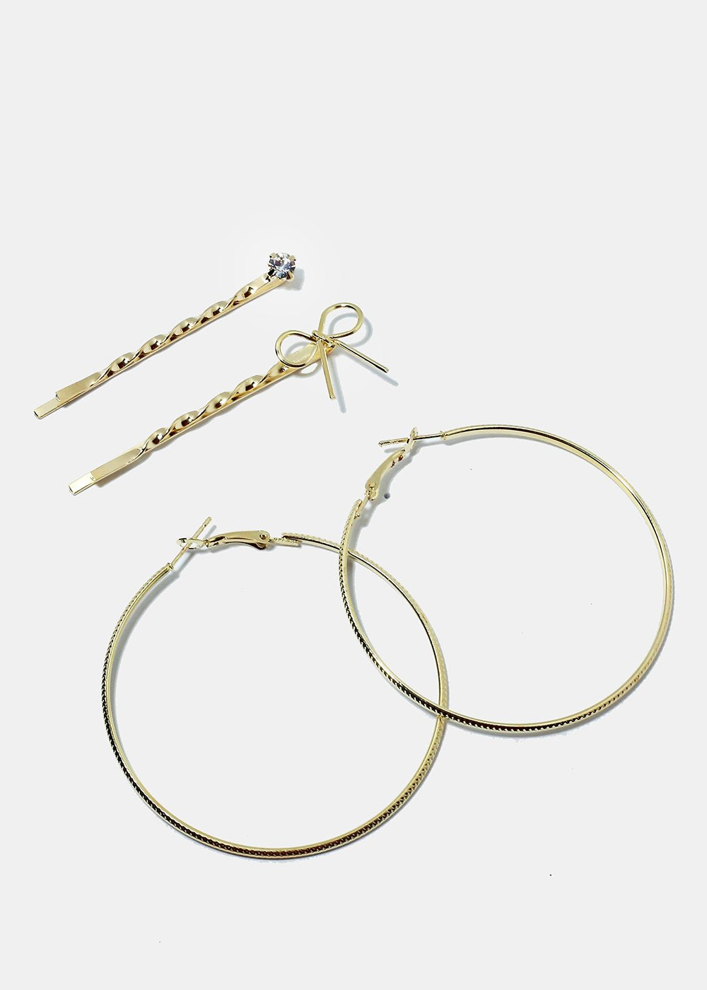Cute set featuring hoop earrings and two textured bobby pins with rhinestones and a bow design. A set that can be worn perfectly with casual to night out looks!