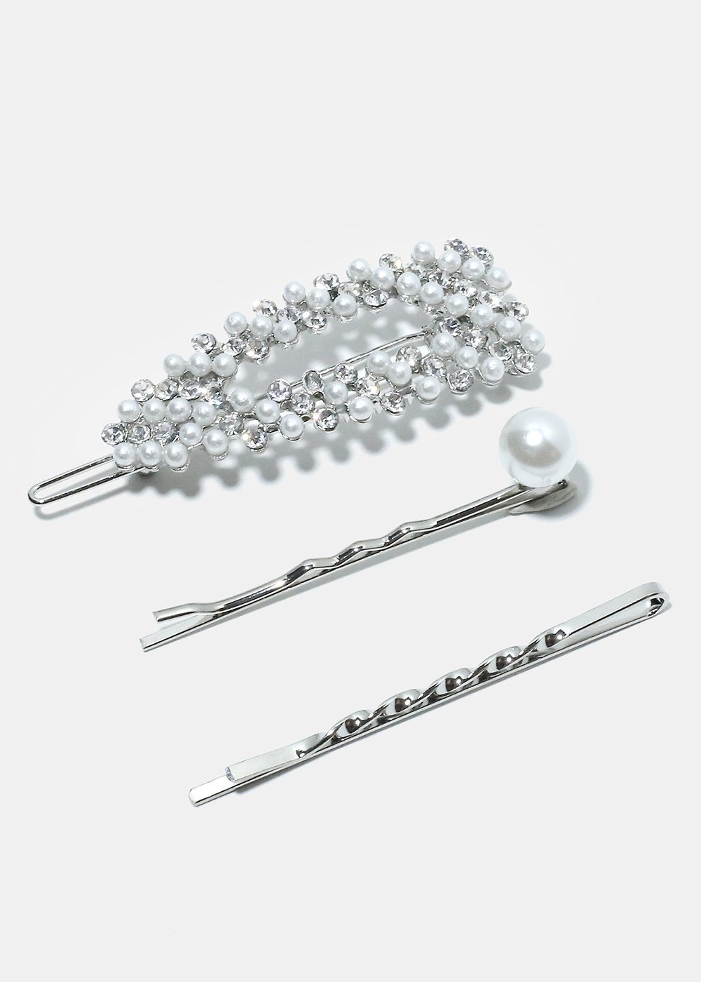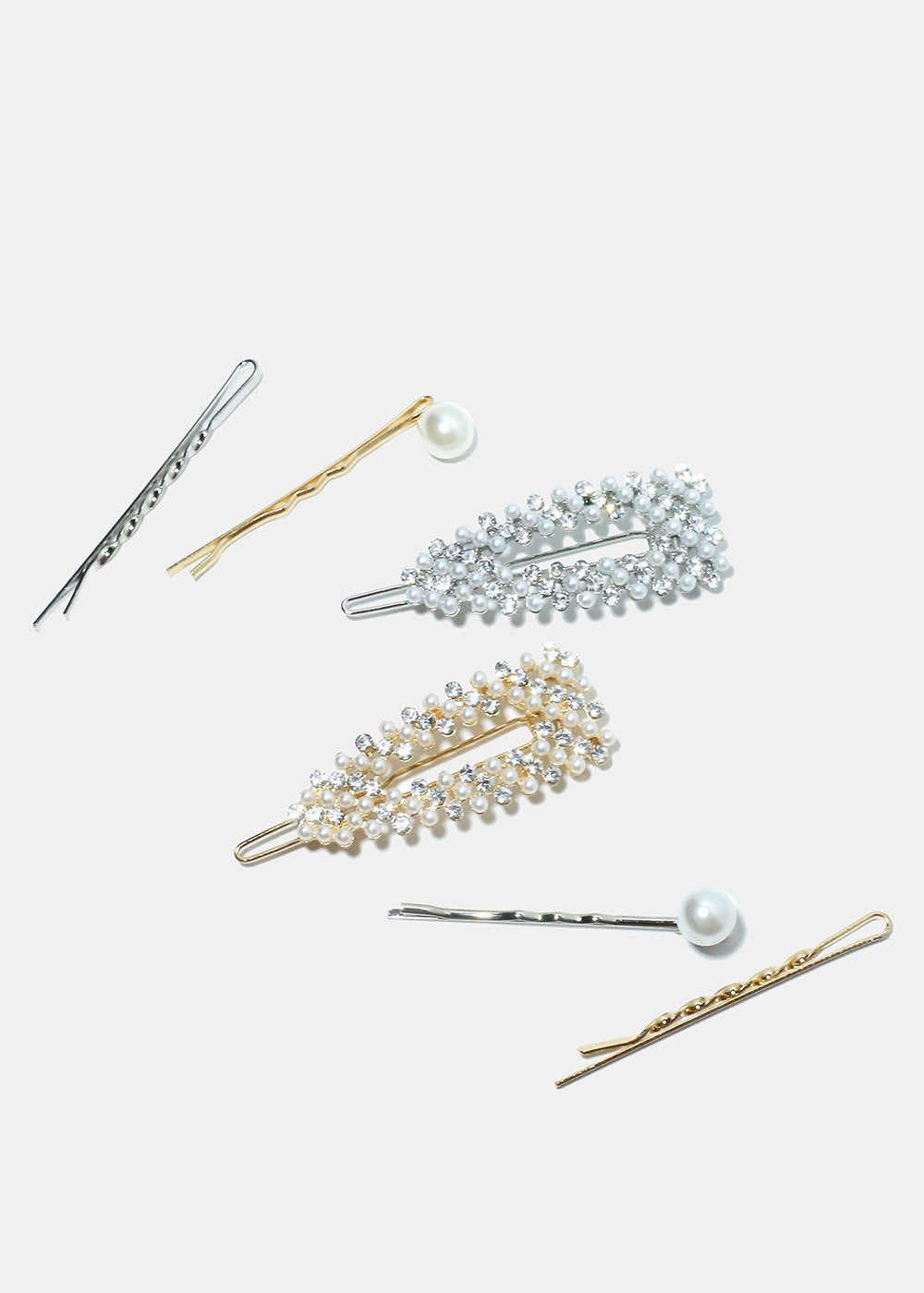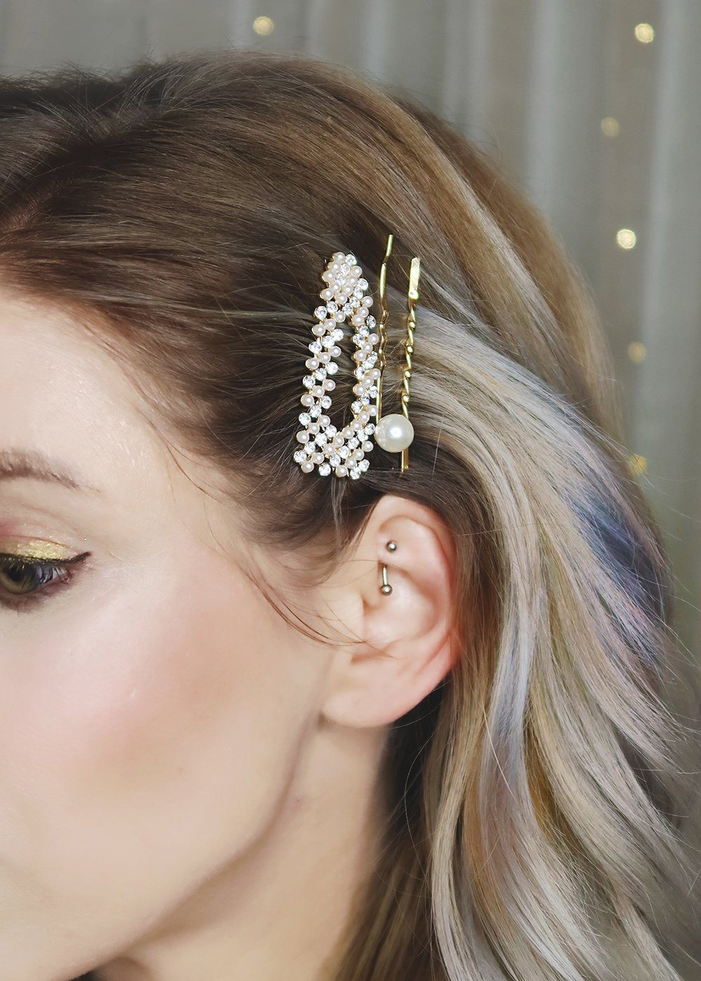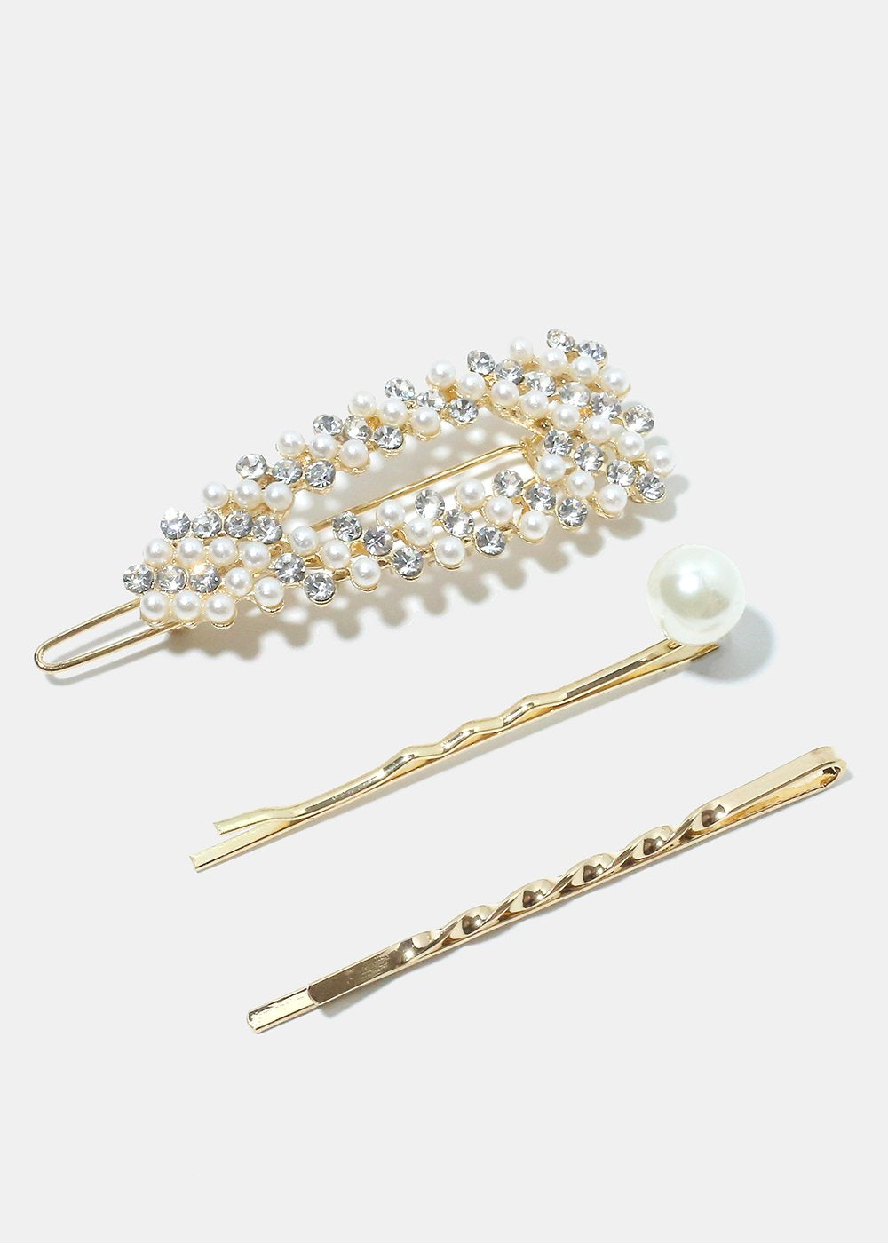 Elegant pearl and rhinestone hair pin set featuring a larger hair pin and 2 bobby pins! Pair them all together or separately to best go with your look! A must-have in your hair pin collection.