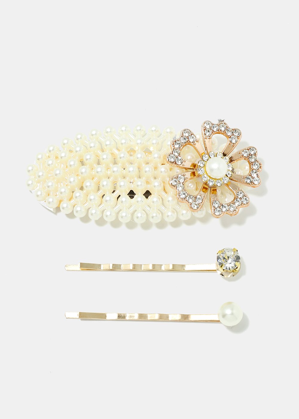 Stunning set featuring a 3-piece hair pins set. Including a large teardrop pearl studded hair pin and 2 bobby pins. Elevate your whole look by simply adding these to your hair-do!