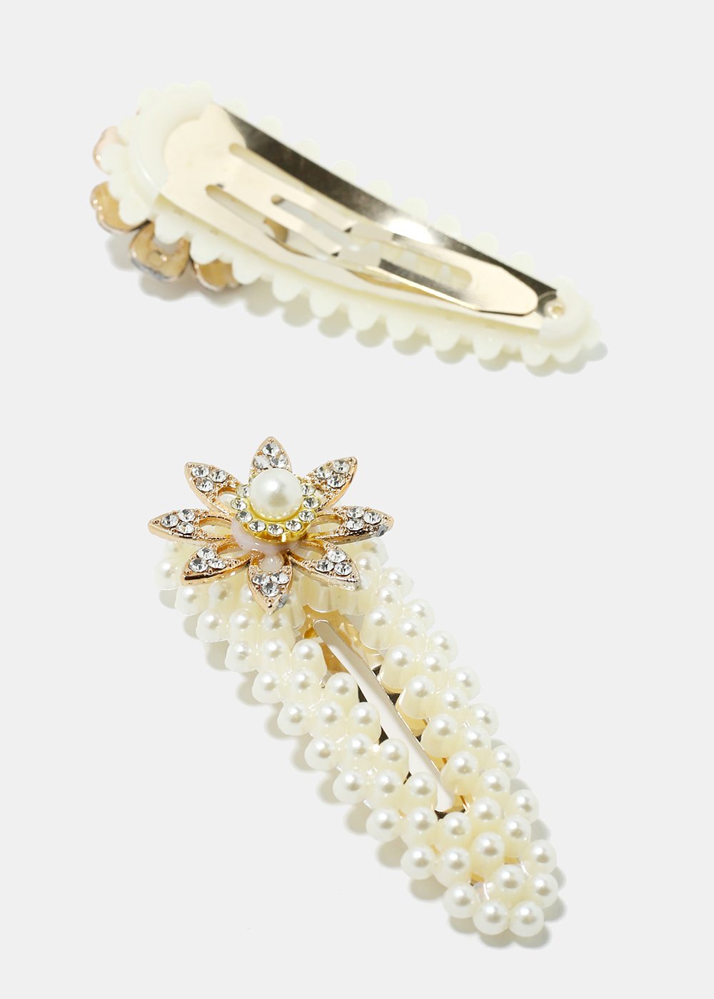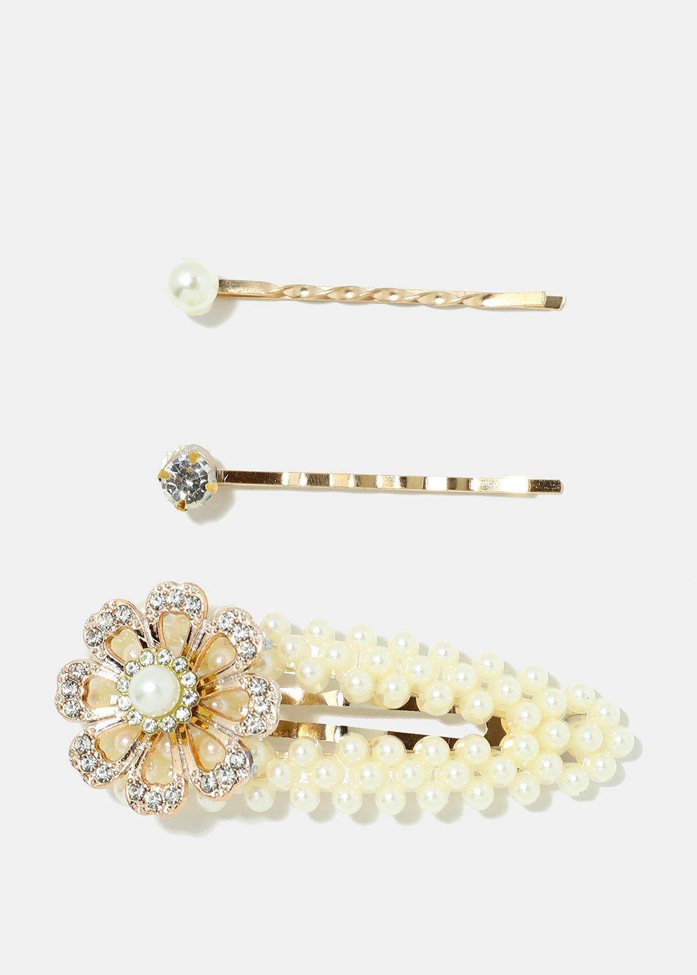 Classy 3-piece hair pin set including 2 bobby pins with a pearl and rhinestone accent and a large pearl studded hair pin with a rhinestone flower accent. Looks beautiful on and adds an elegant final touch to your hair-do!