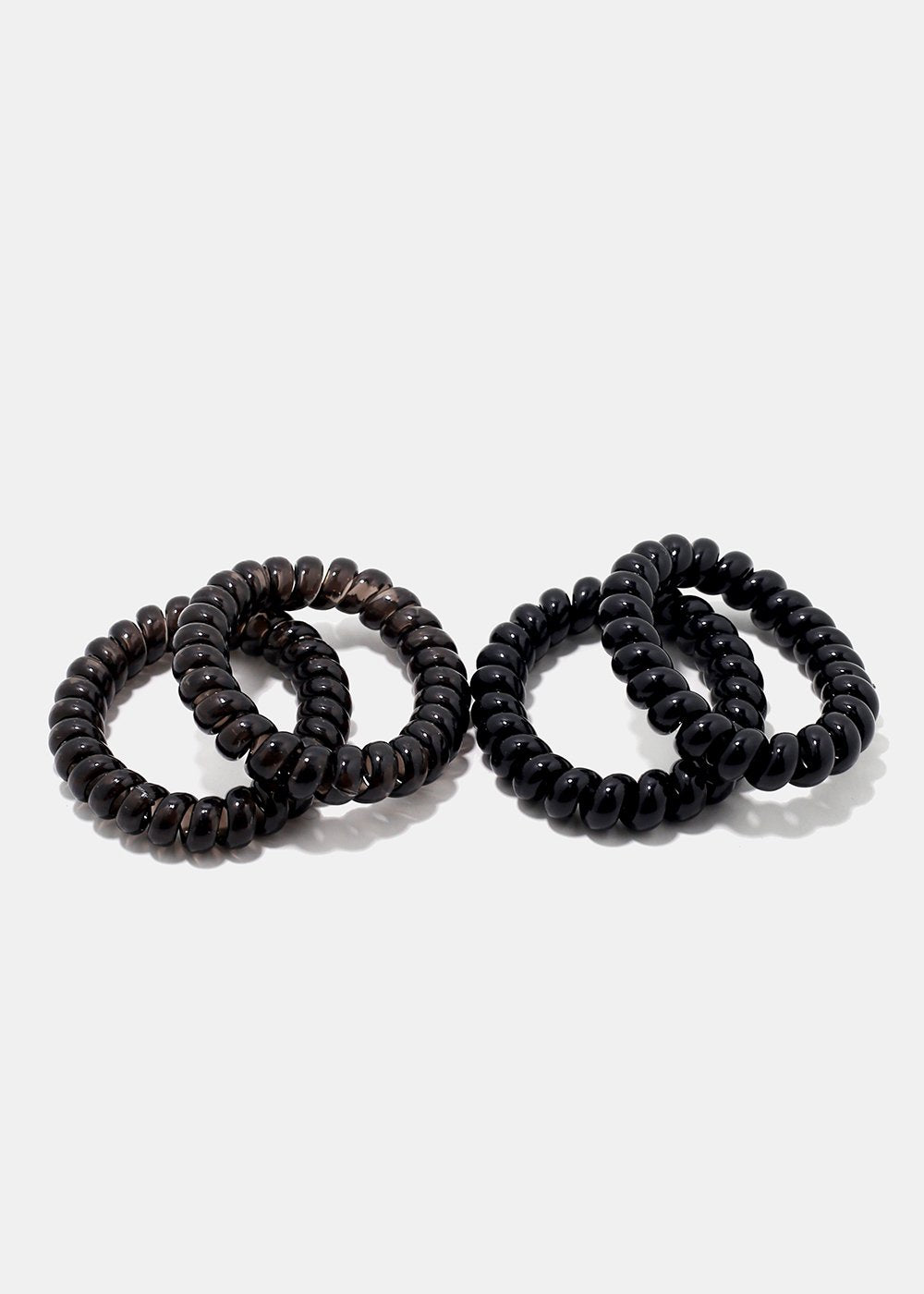 Pack of 4 matte and translucent hair ties with telephone cord design that is designed for a firm hold that is not too tight and leaves minimal to no creases in hair. A cute hair accessory essential!