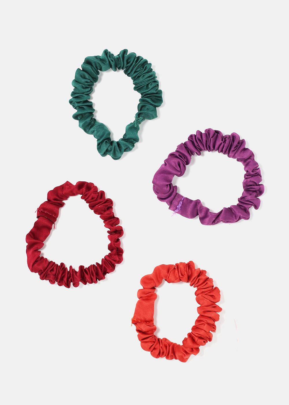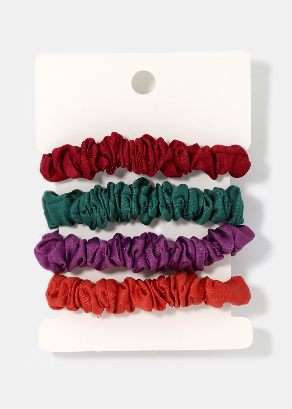 Smooth satin elastic hair ties in scrunched design. Adds a cute touch to your ponytail or bun!