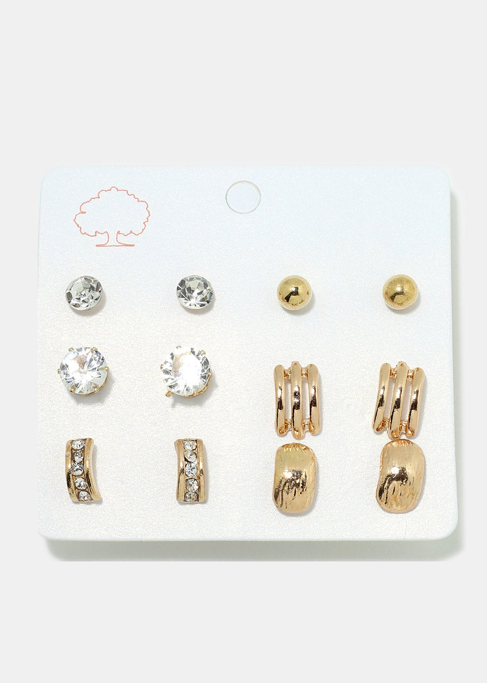 Simple set featuring 6-pair of rhinestone, plain, or curved earrings. Have a different pair for almost everyday of the week. A simple yet pretty addition to your outfit.