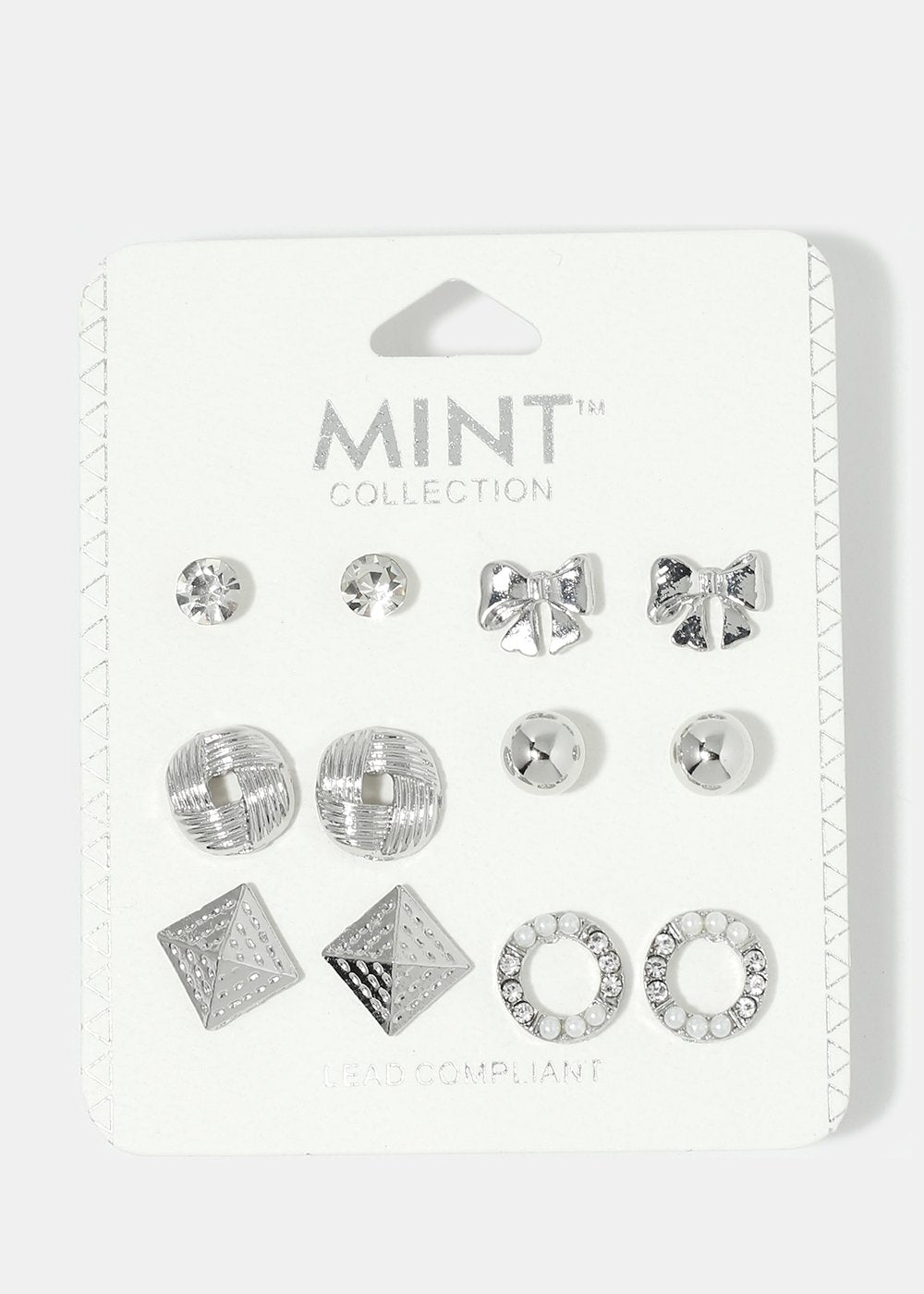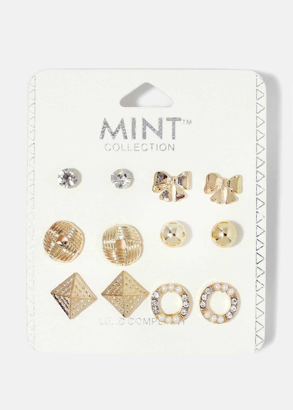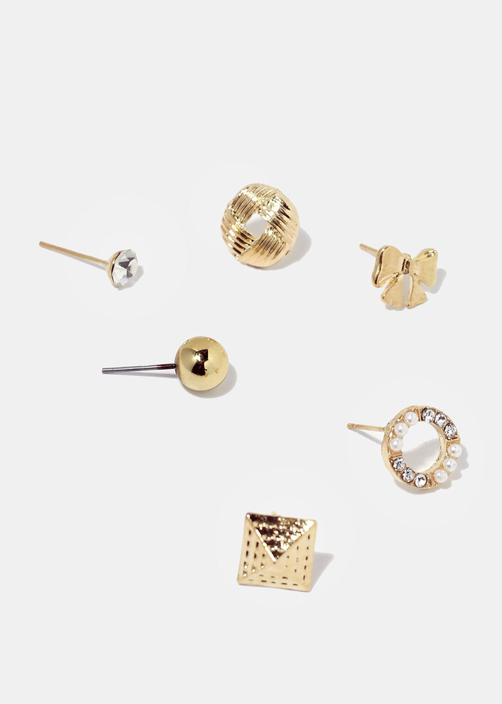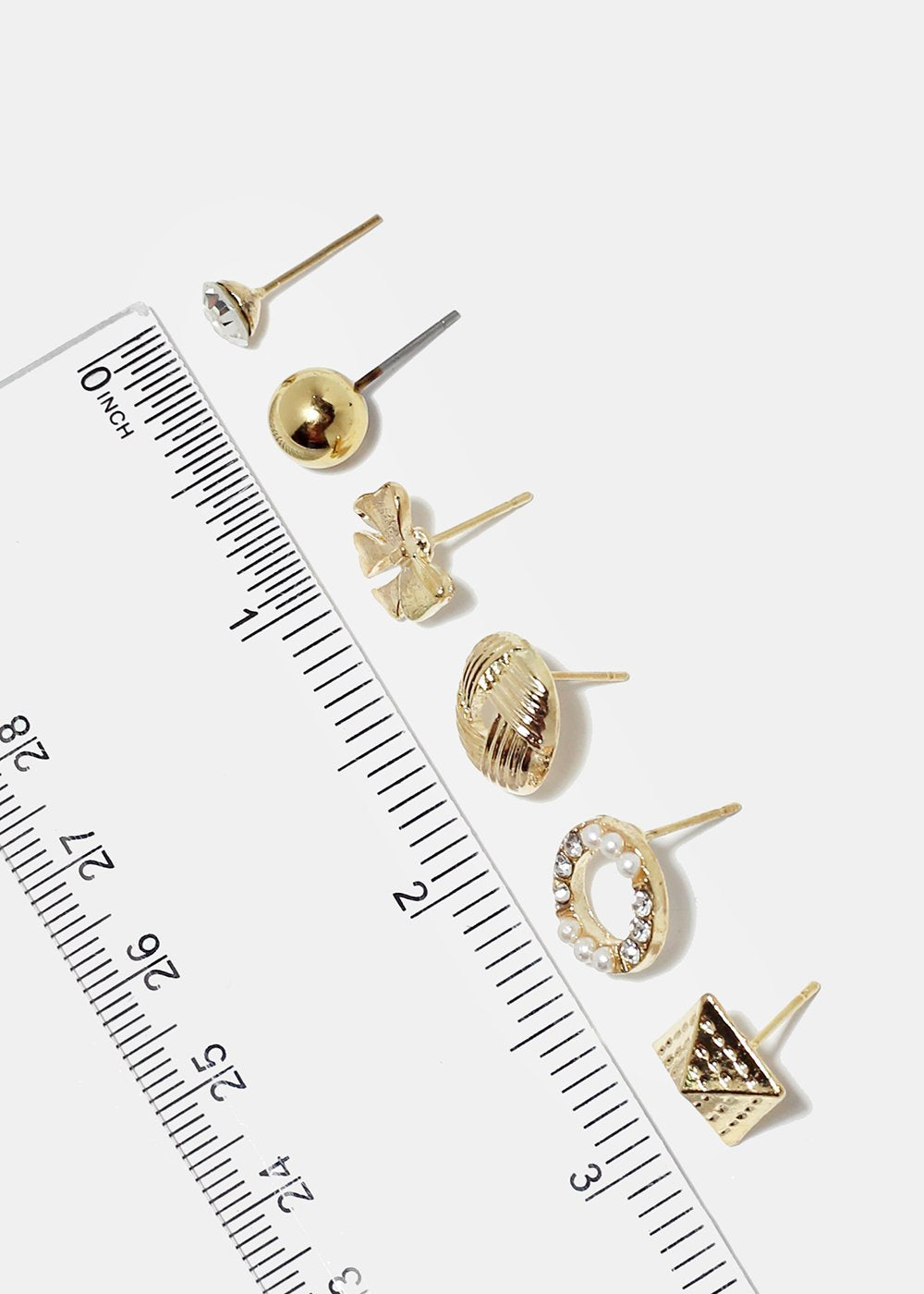 Charming 6-pair of multi designed earrings such as bows, studs, and diamond shaped. These are perfect to stock up on your earring collection and not to mention they go with any and every outfit you can think of!