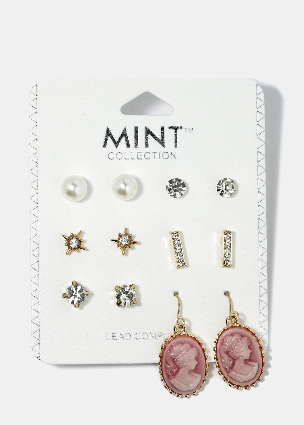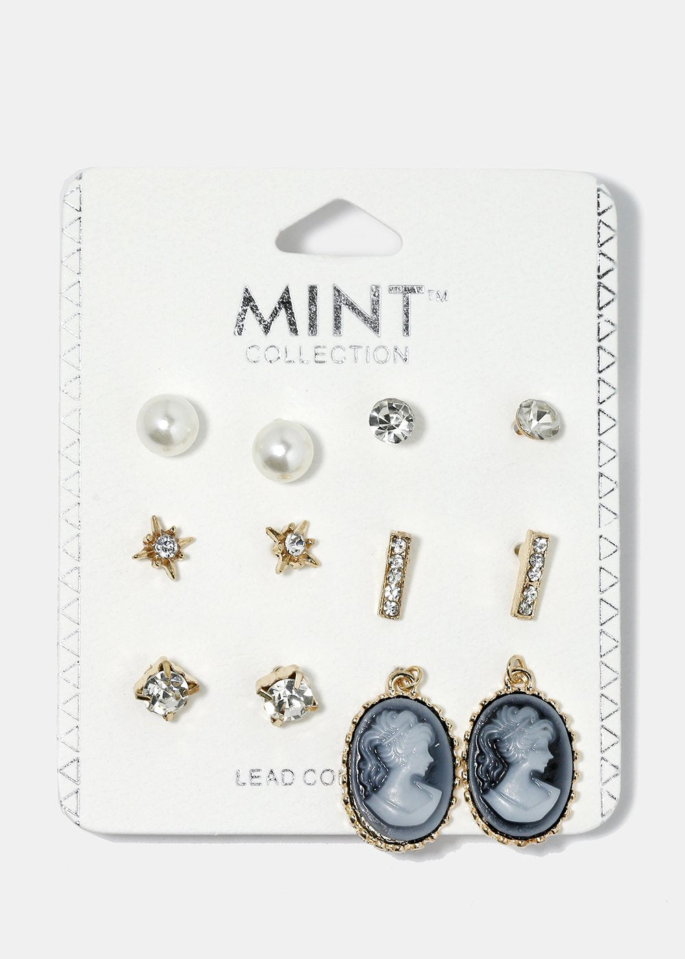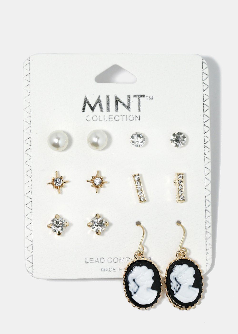 Achieve gorgeous looks in this 6-pair of multi designed earrings including rhinestones and pearls in different shapes and sizes as well as an elegant antique cameo drop earrings set. A set that has all your essentials for any type of look!