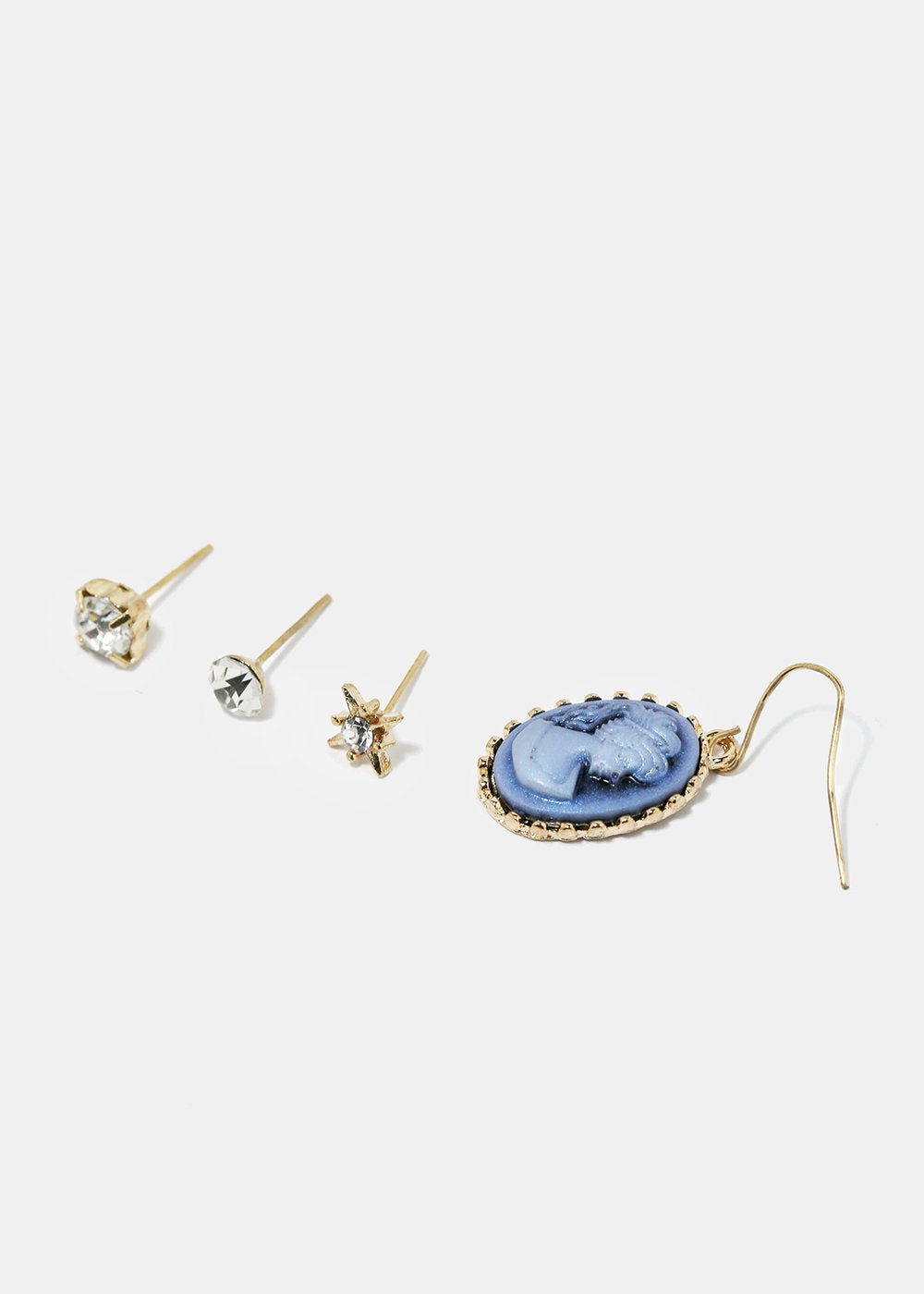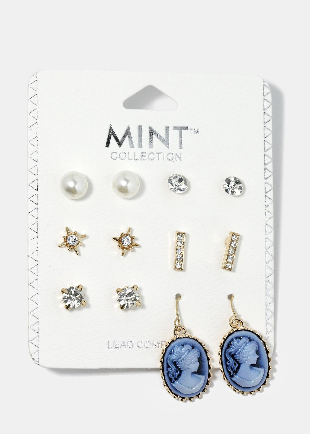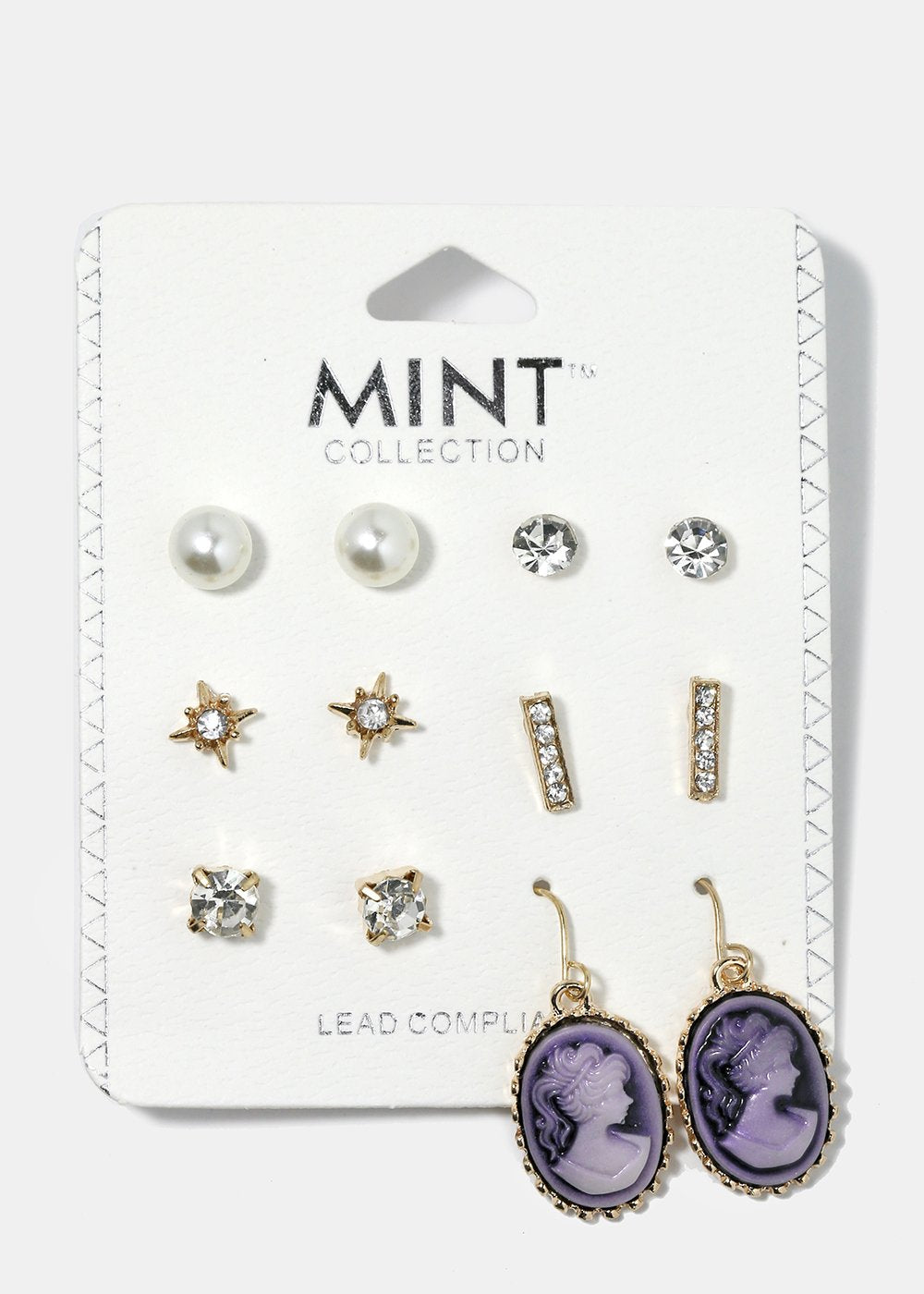 Achieve gorgeous looks in this 6-pair of multi designed earrings including rhinestones and pearls in different shapes and sizes as well as an elegant antique cameo drop earrings set. A set that has all your essentials for any type of look!