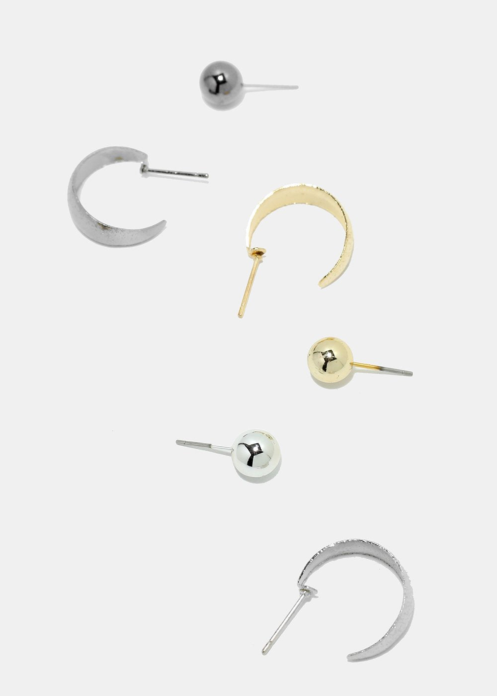 Get yourself an amazing deal with this 6-piece half hoop and ball earrings set! A set that fits any outfit from casual to glam looks! Included comes silver, gold and gunmetal colors that are easily paired with any style!