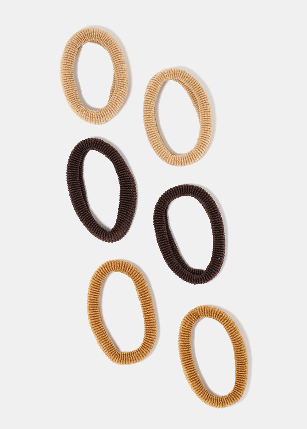 Six-piece packs of thick and soft ridged hair ties for a firm hold on medium and thick hair ties! Comes in a variety of neutral tones.