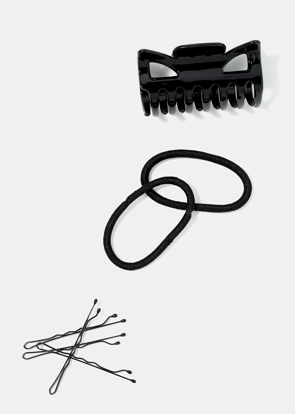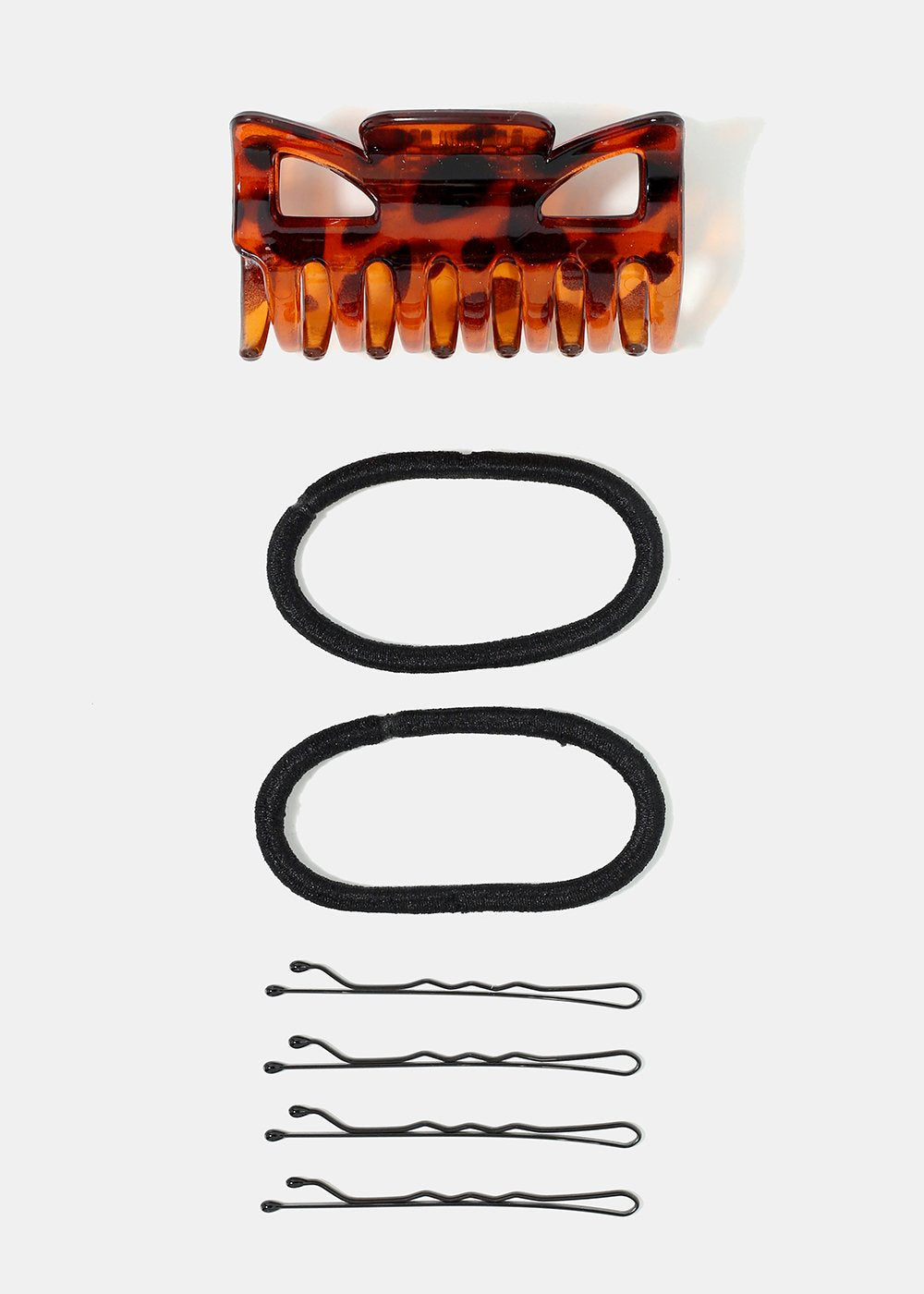 Get an amazing deal with all of your daily essentials in this 7-piece hair clip and hair tie set for only $1! Yup, you heard that right, you get a tortoise or black jaw clip,  2 elastic hair ties, and 4 black bobby pins! Everything you need in just one set!