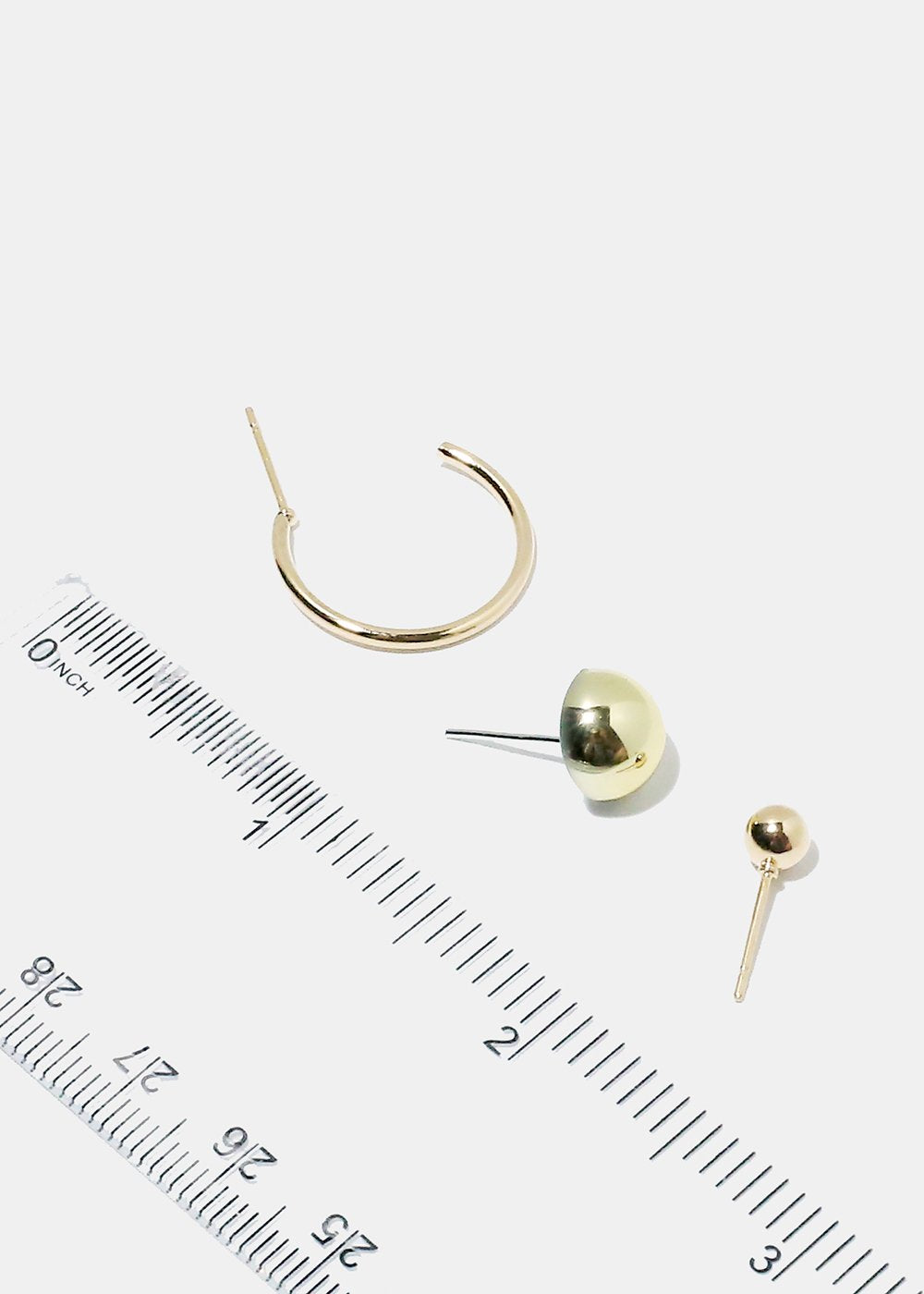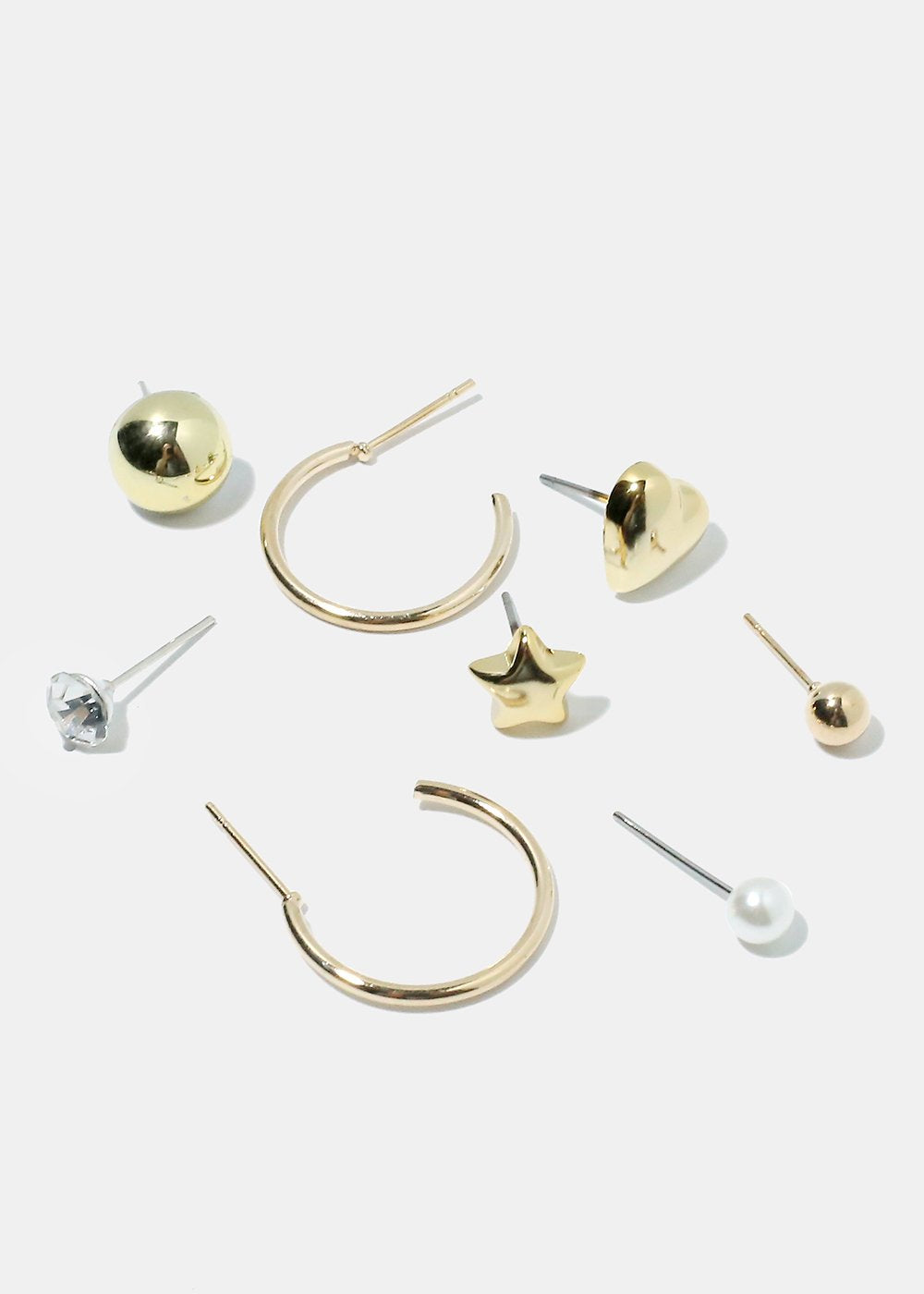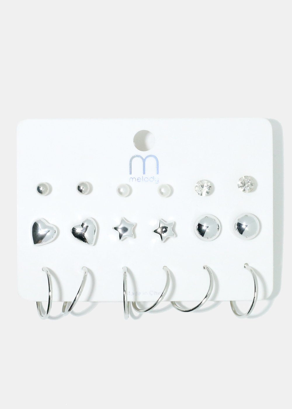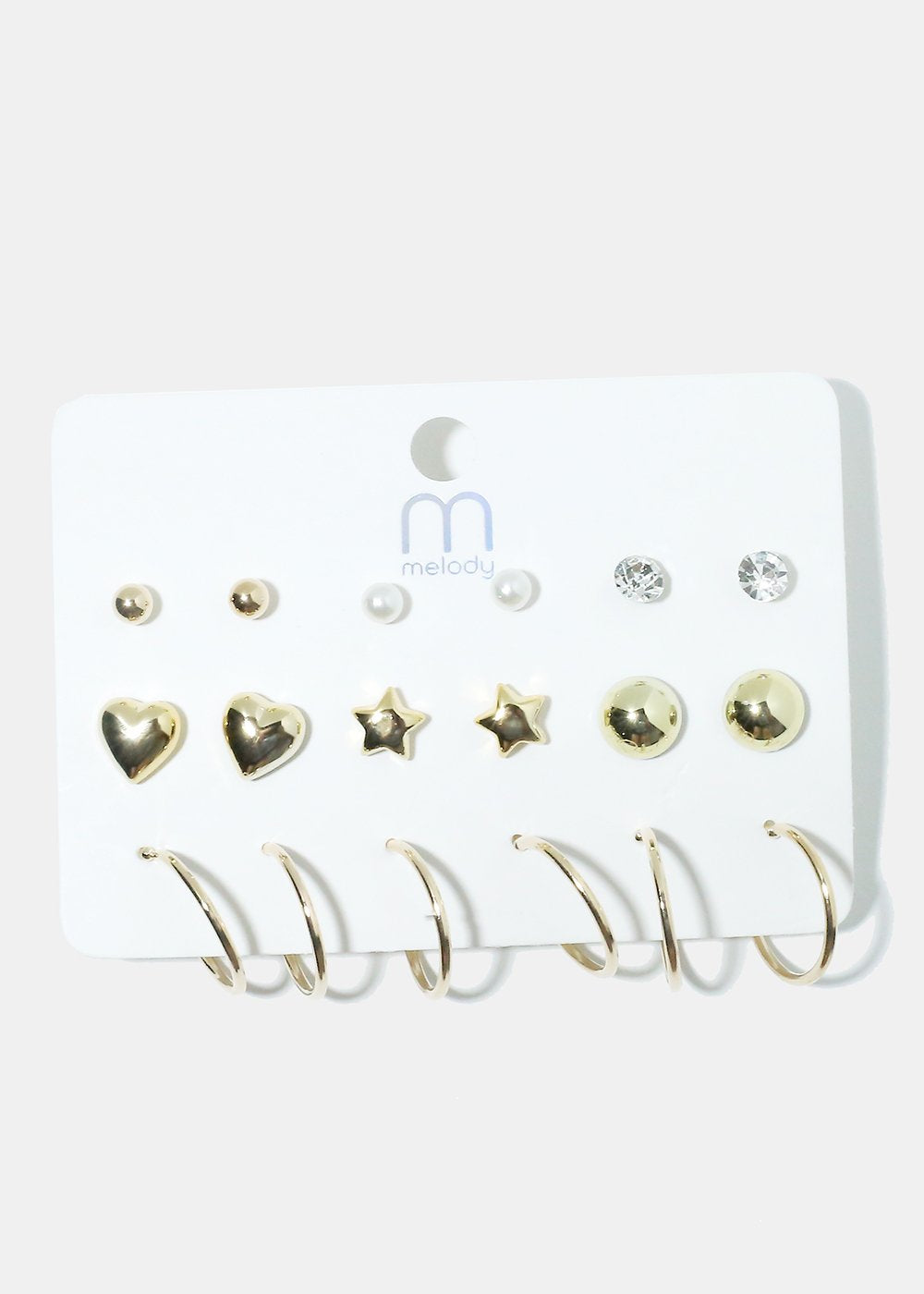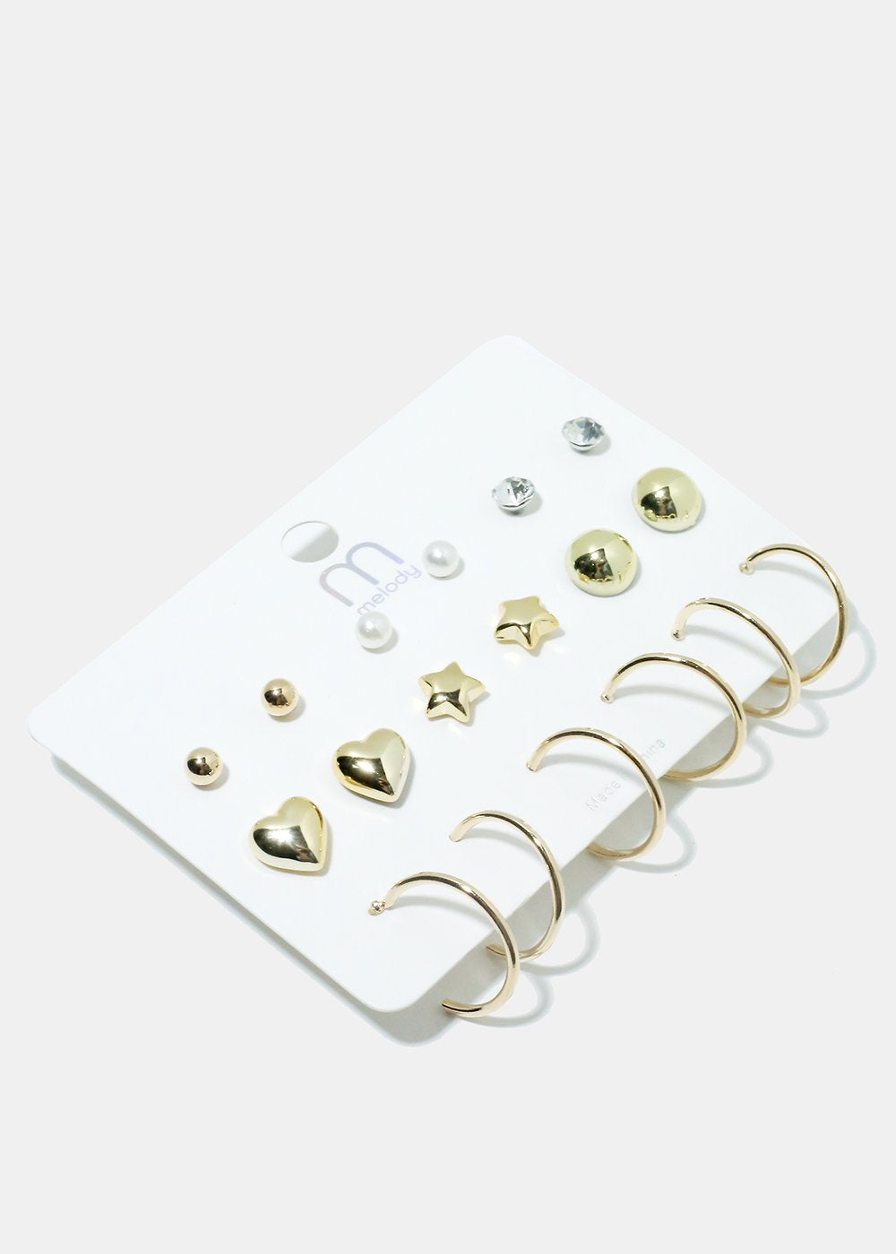 Amazing set featuring a 9 pair mix of stud and small hoops. Choose from heart, star, and ball designs that will compliment any look! Perfect for your everyday wear or a special night!