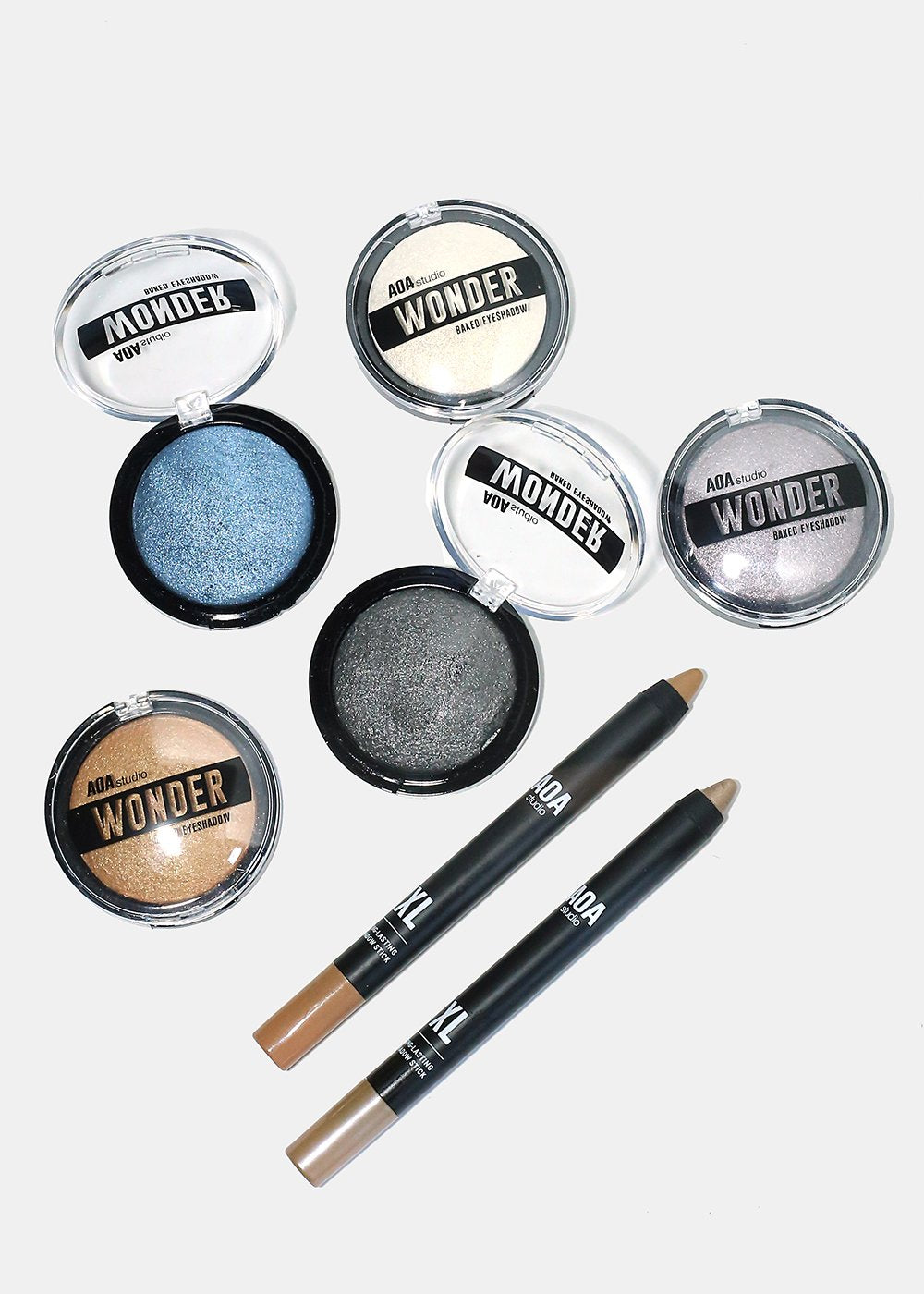 Stunning set including 8 AOA Baked Eyeshadows and 2 AOA XL essential eyeliners. These shadows can be used wet or dry depending on how intense you want your look! A gorgeous range of colors from natural to glam! Get the best of both worlds with this collection that offers pigmented and creamy shadows and easy to work with eyeliners!