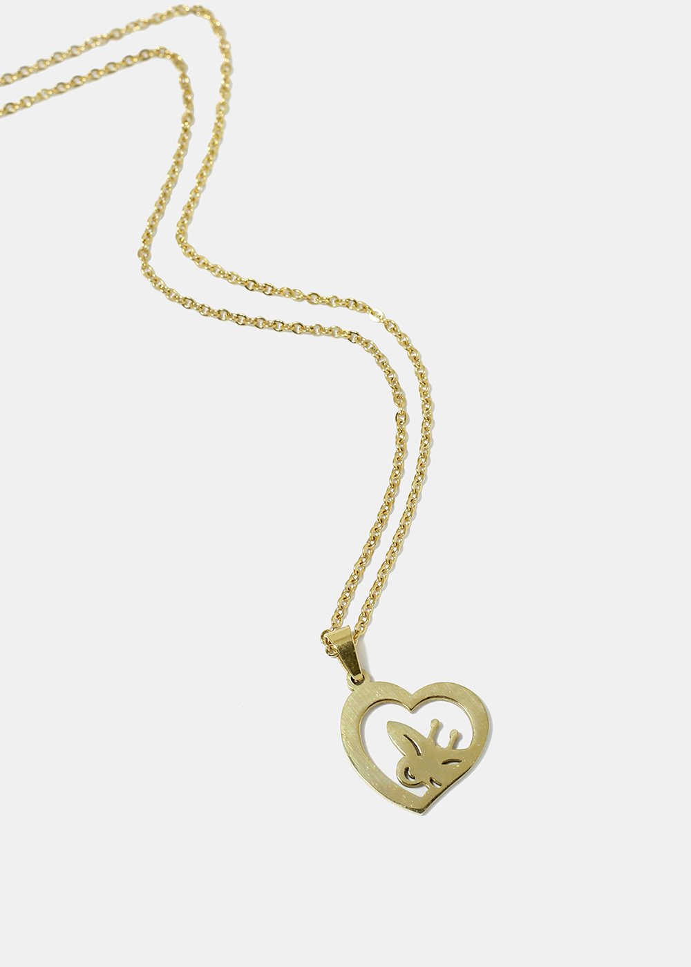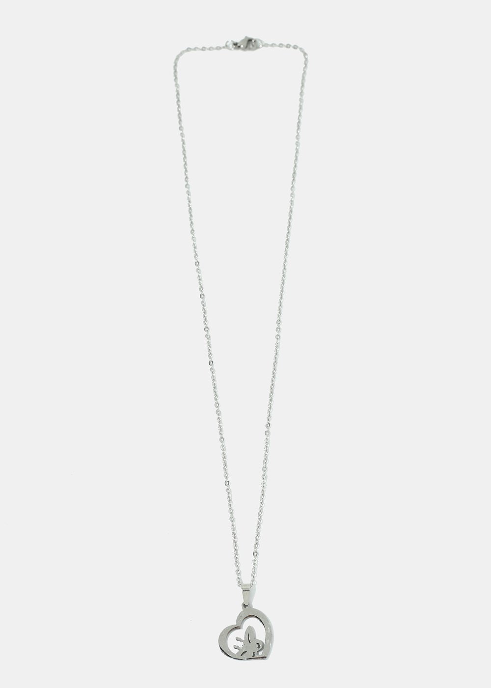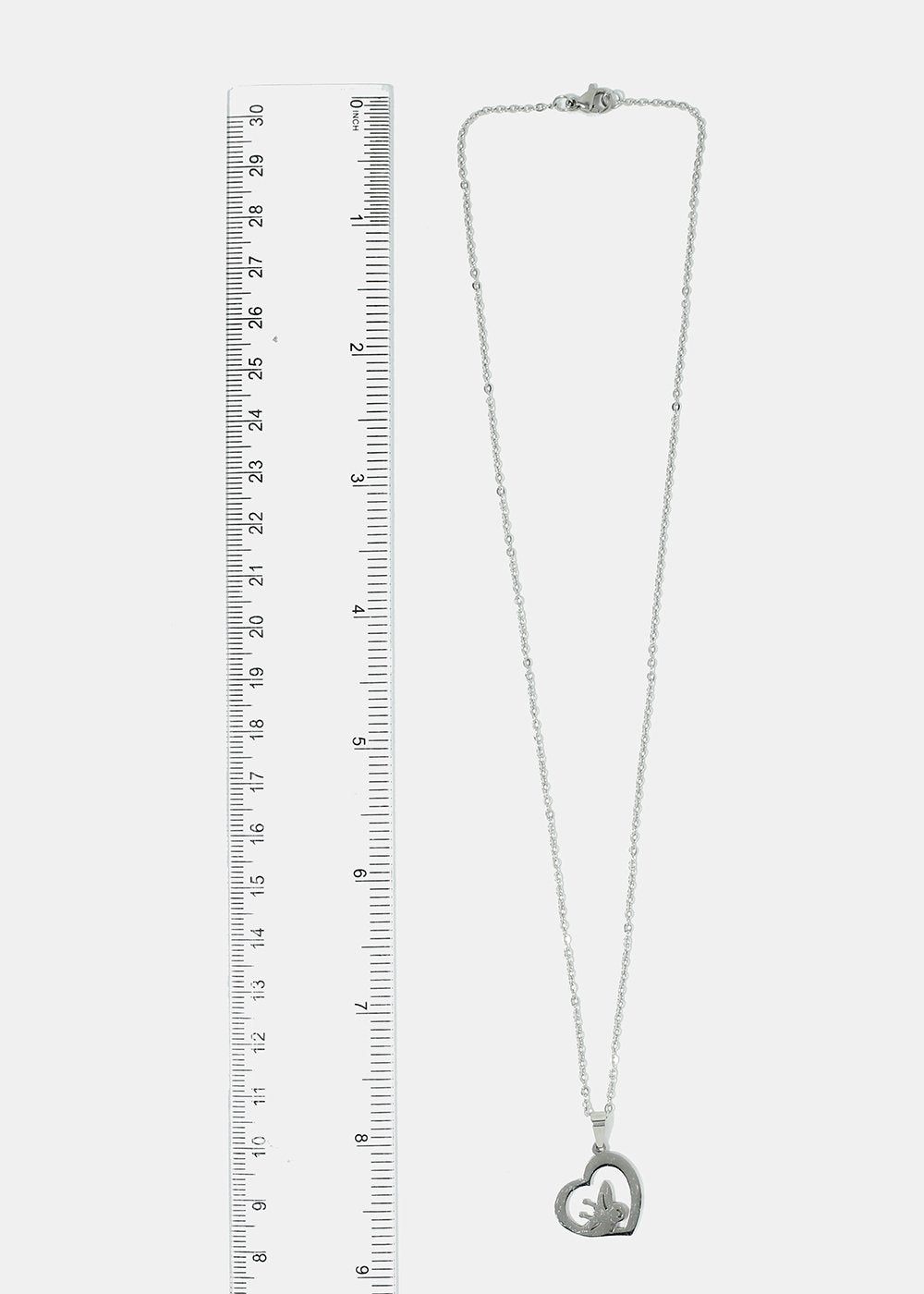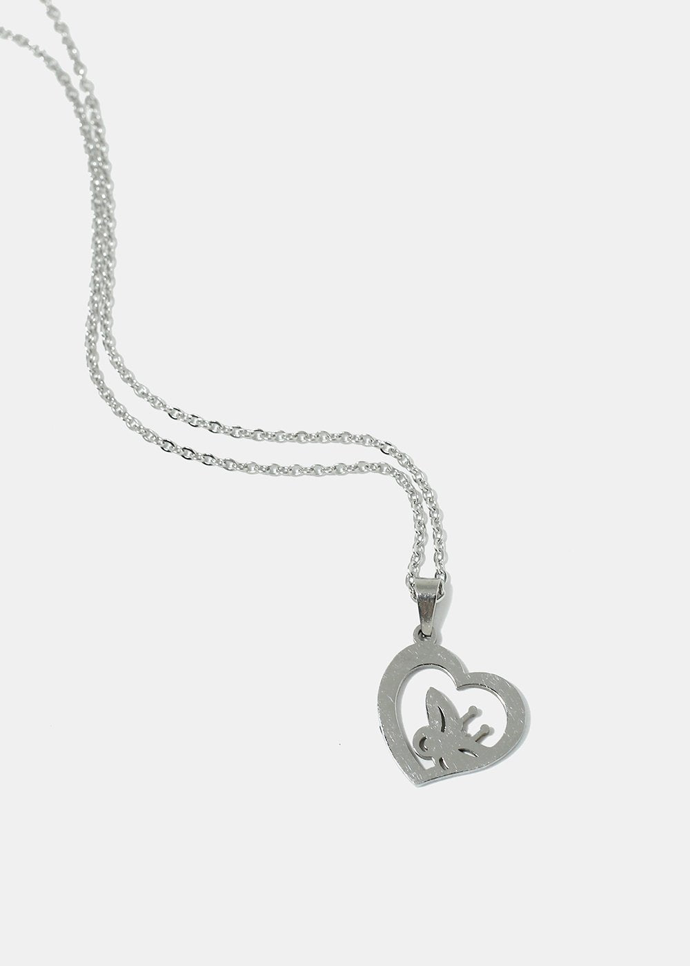 Charming small butterfly in heart pendant featured in a bright shiny chain necklace. Goes beautifully with your everyday look or even perfect for a sweet gift giving!