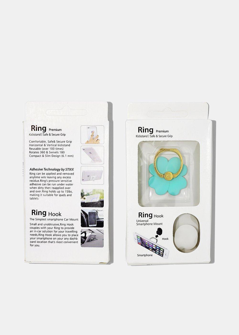 Clover-shaped cell phone ring mount perfect for using as a kickstand or to hold phone more securely in hand. Easy to mount on any cell phone with flat surface and can be cleaned and reused! Includes hook that can be used in car to hold phone by ring for hands-free use.