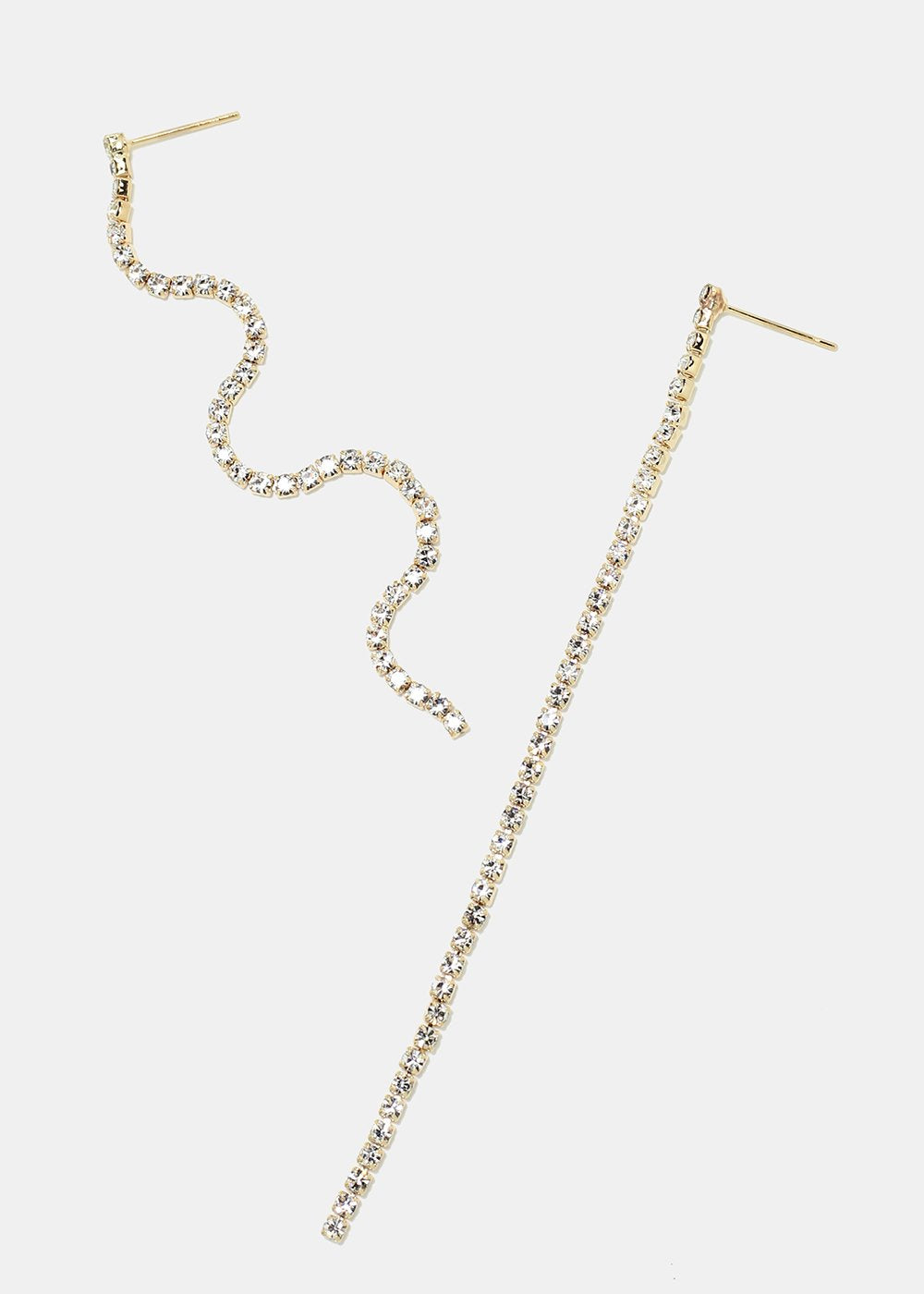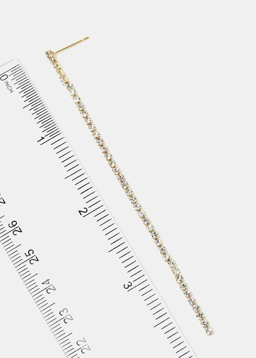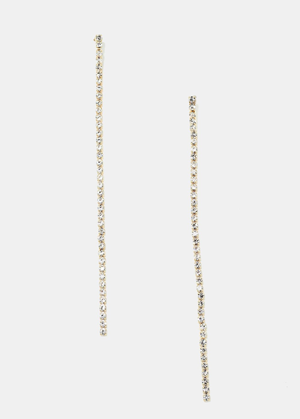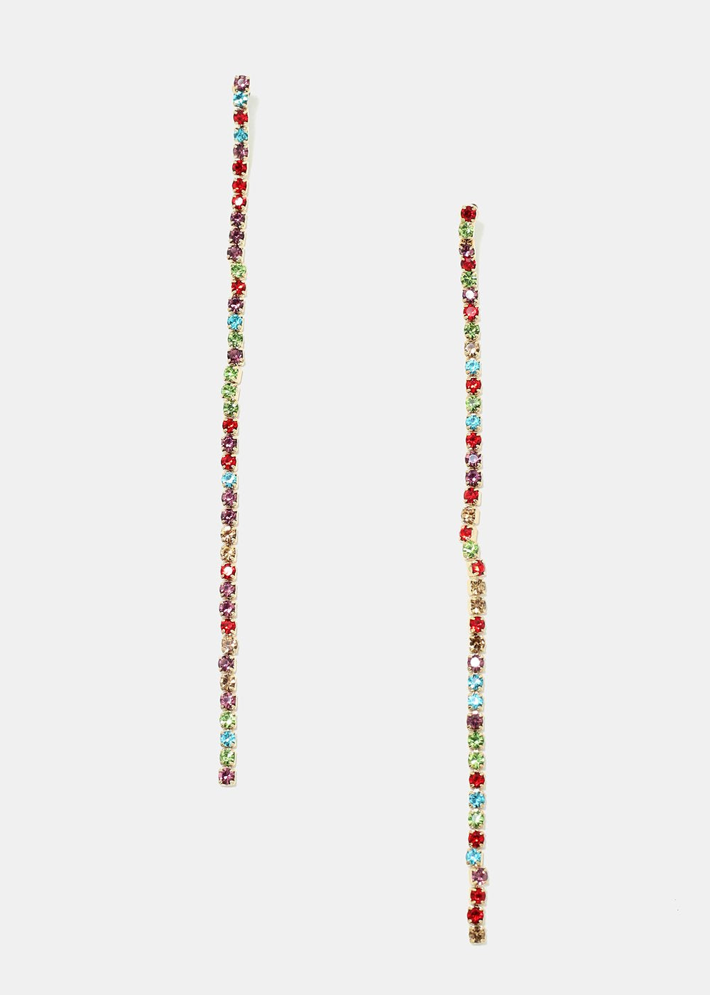 Unique pair of dangle string earrings covered in rhinestones. Choose from clear rhinestone or multi colored to add a pretty pop of color to any look!