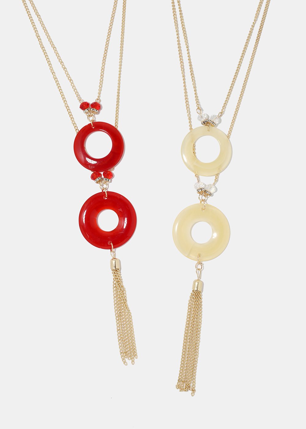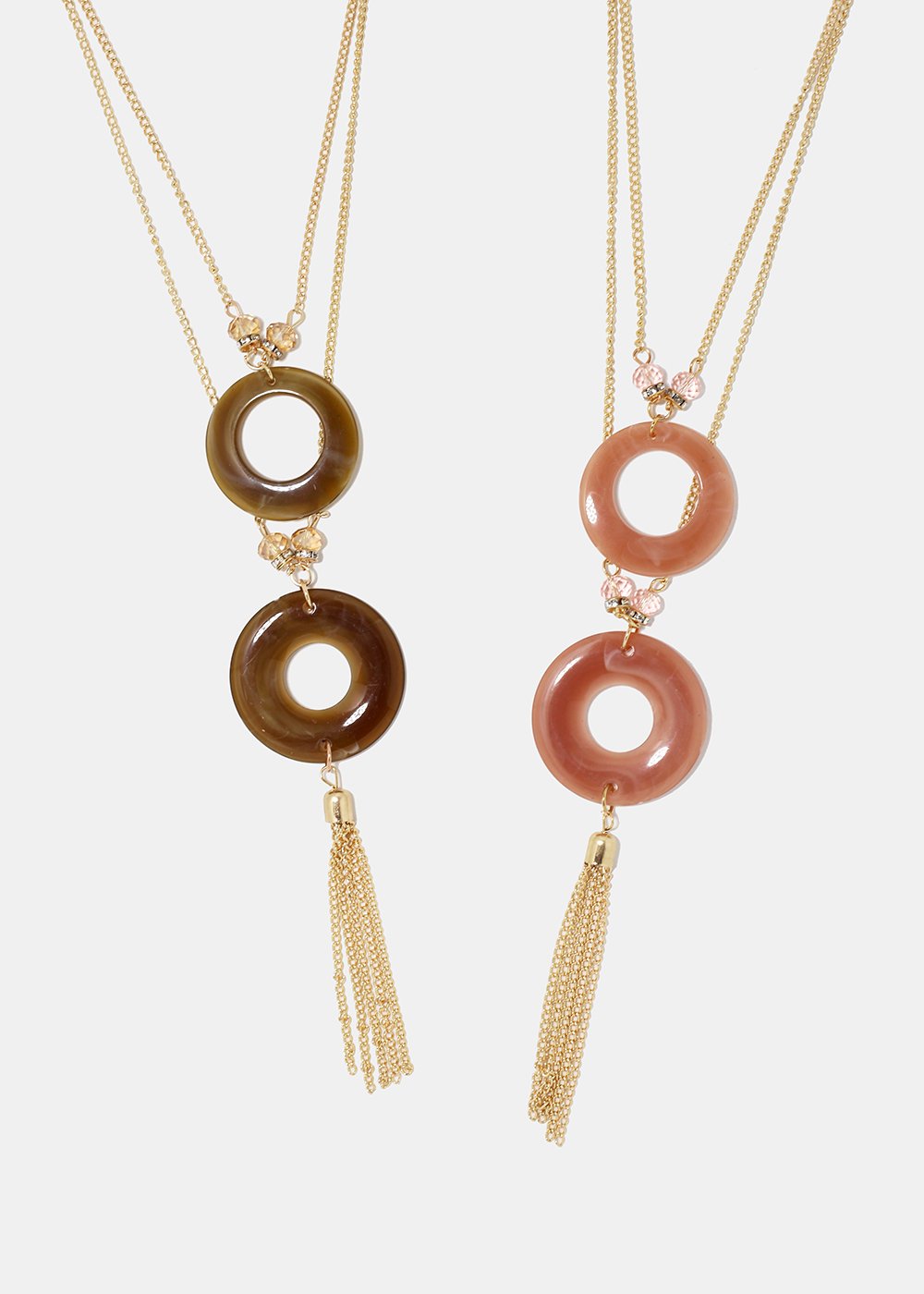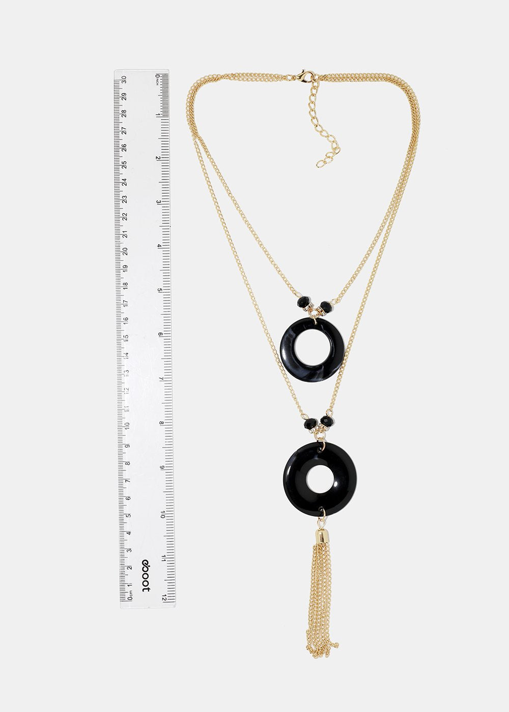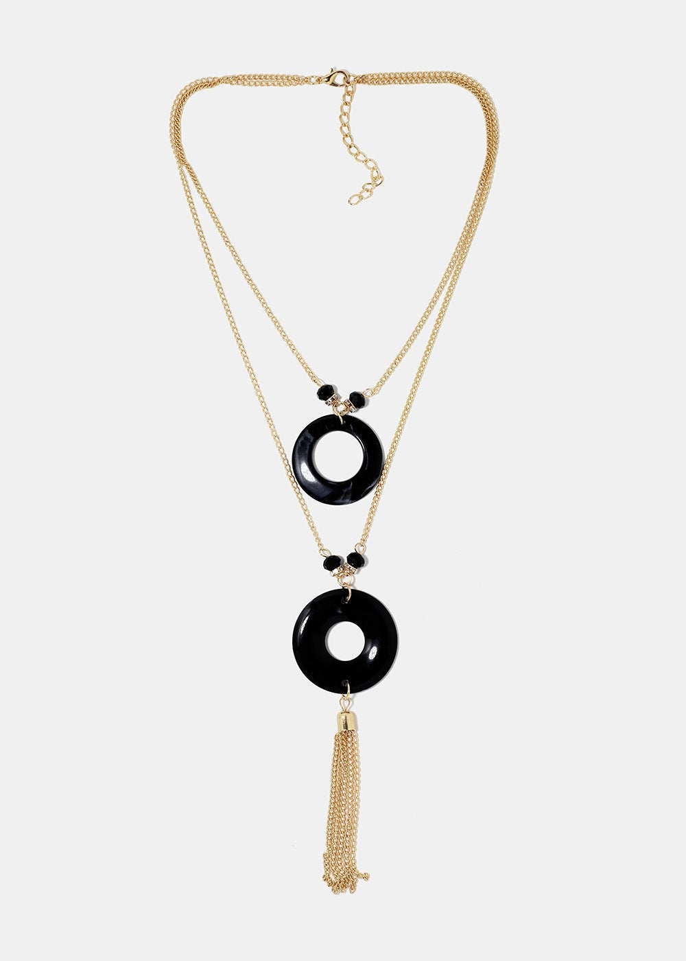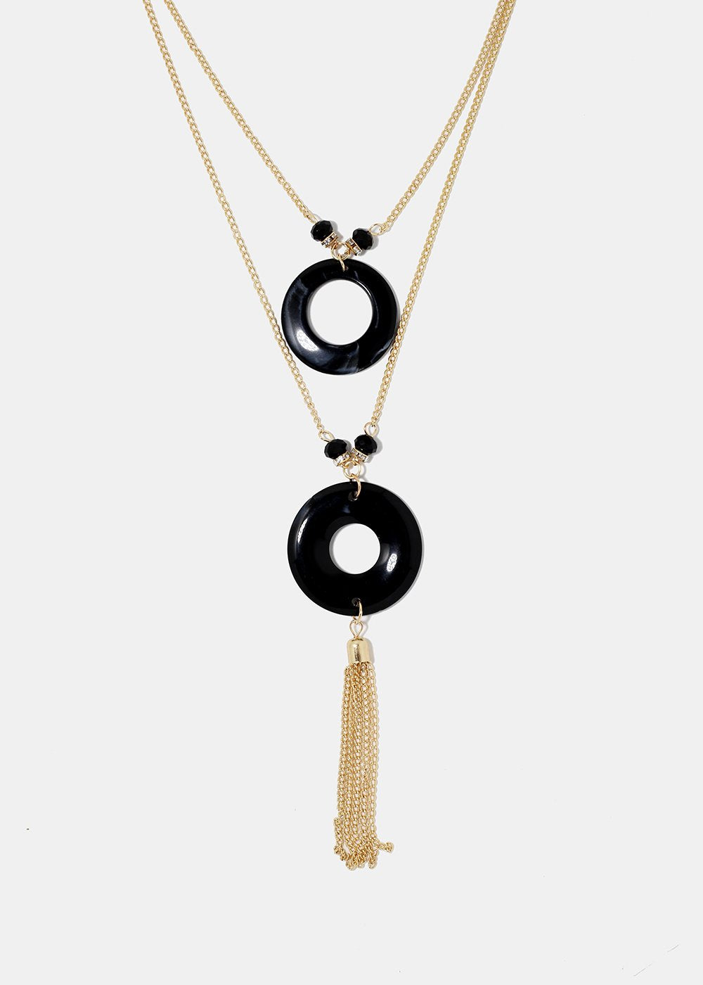 Double chain necklace featuring resin rings, chain tassel and bead and rhinestone accents. A modern and stylish finish to both day and night attire!
