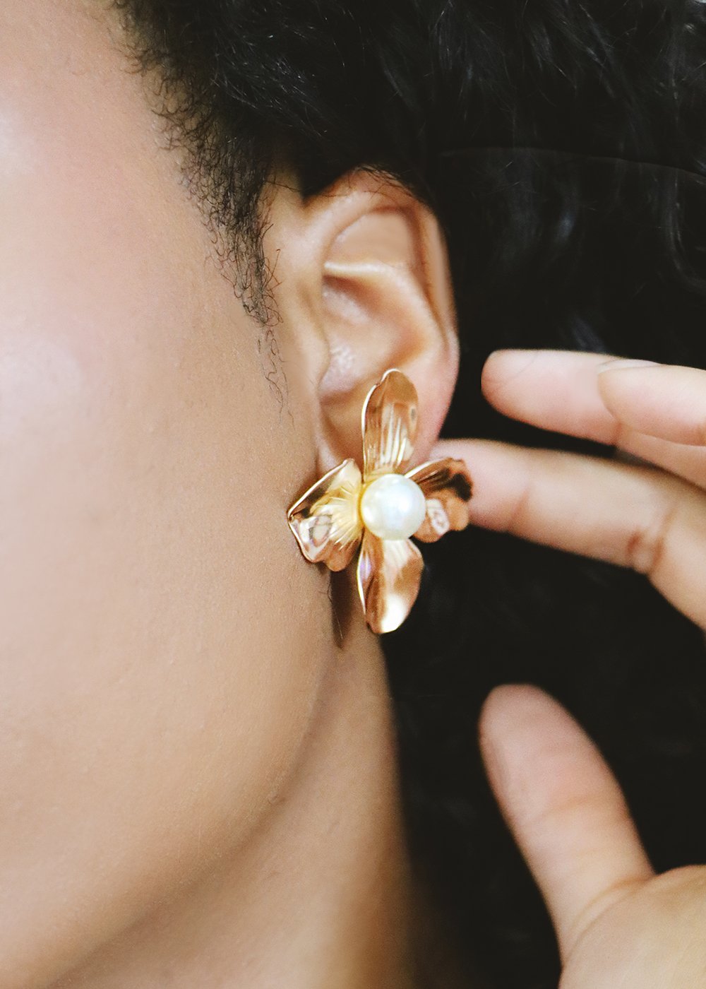 Trendy flower and pearl earrings in gold metal. A unique pair that adds a classy elegant touch to any look! An essential addition to your jewlry box!