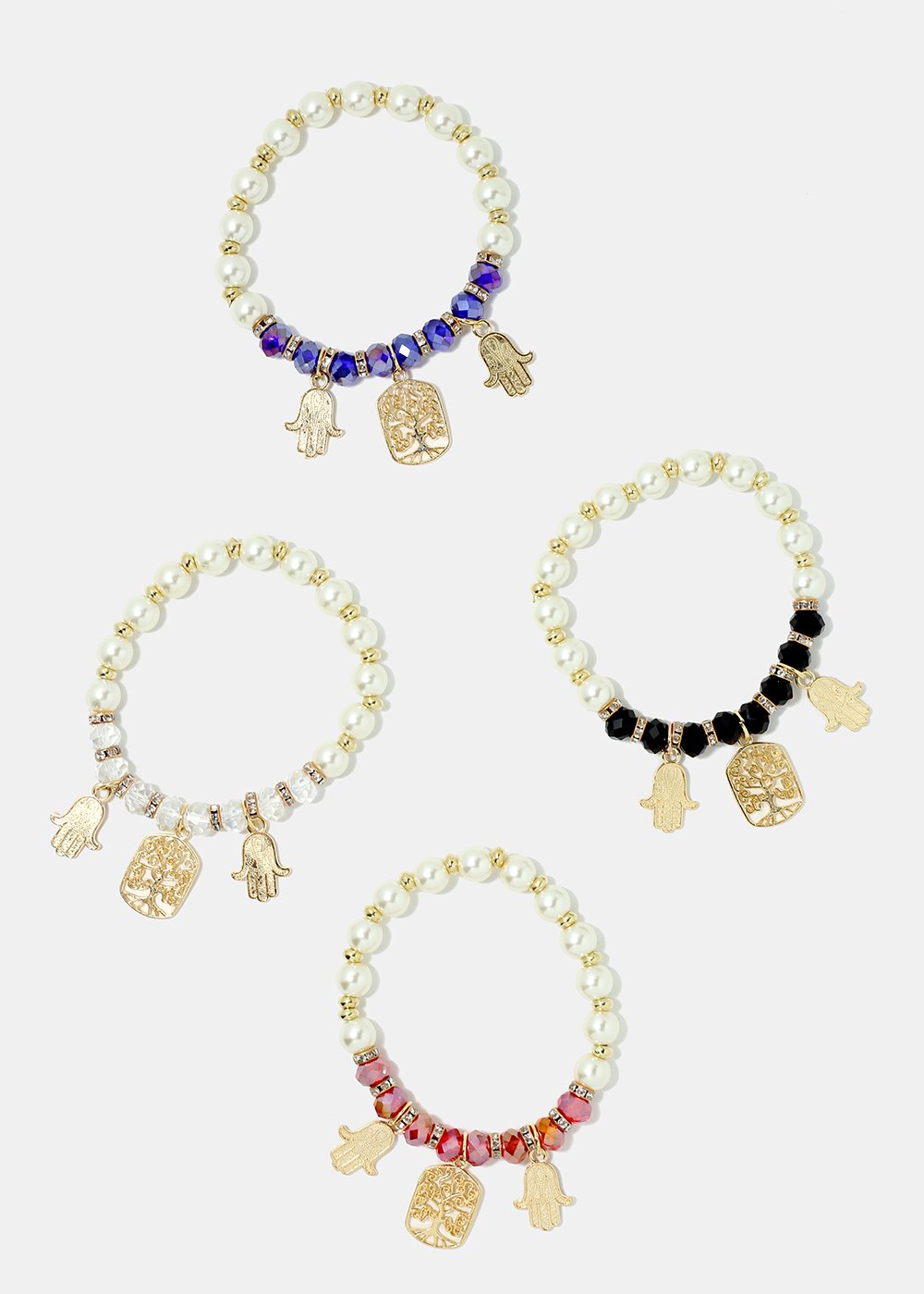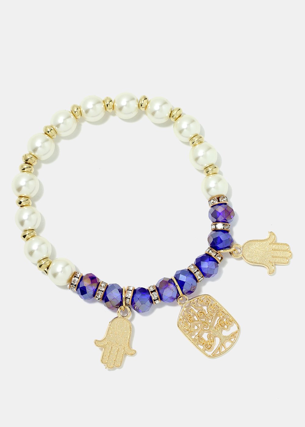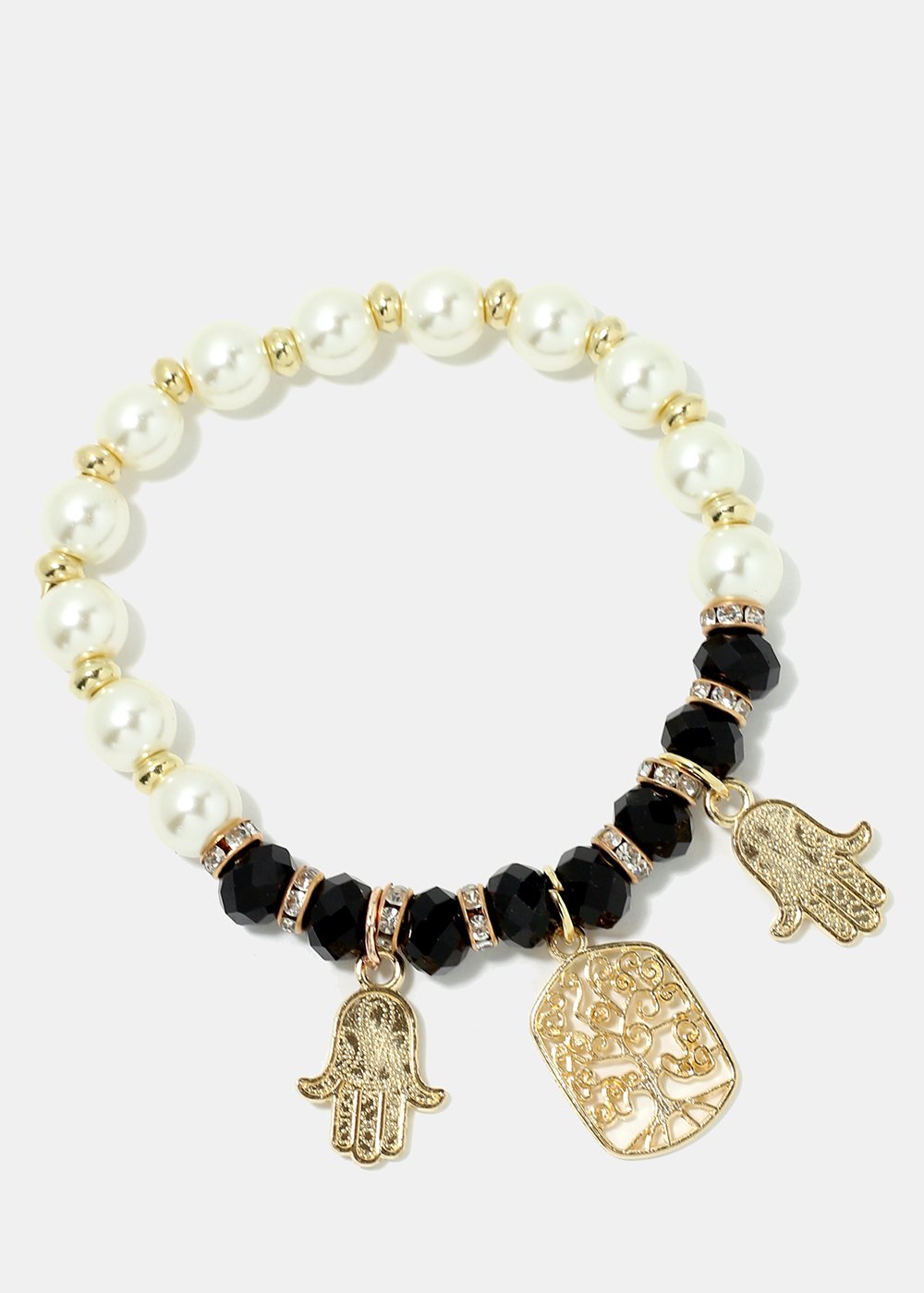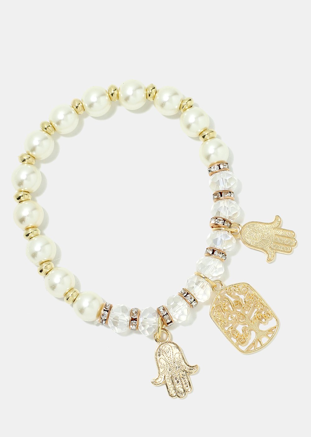 Gorgeous pearl beads and hamsa hand dangle charms. A touch of rhinestones to add a subtle but pretty amount of shine to your outfit!