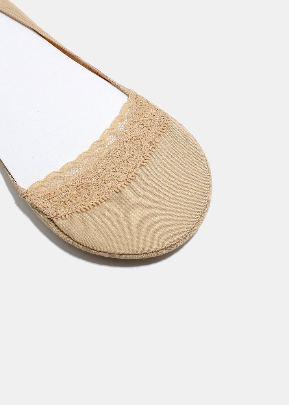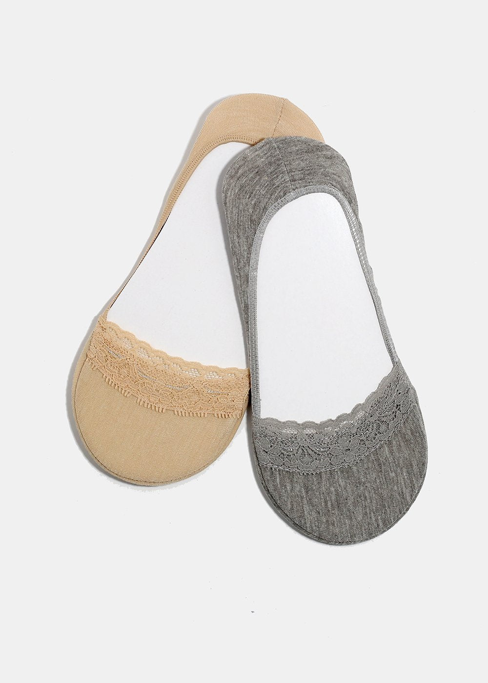 Thin no-show socks with lace trim detail in solid neutral colors. Perfect for low-cut flats and sneakers! Fits women's shoe sizes 5-10.