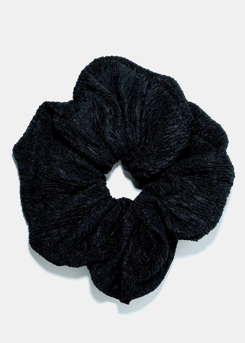 A large textured black scrunchie to give you a beautiful fit every single time! Adds a nice finishing touch to your hair-do! Looks super cute on ponytails or a high bun!