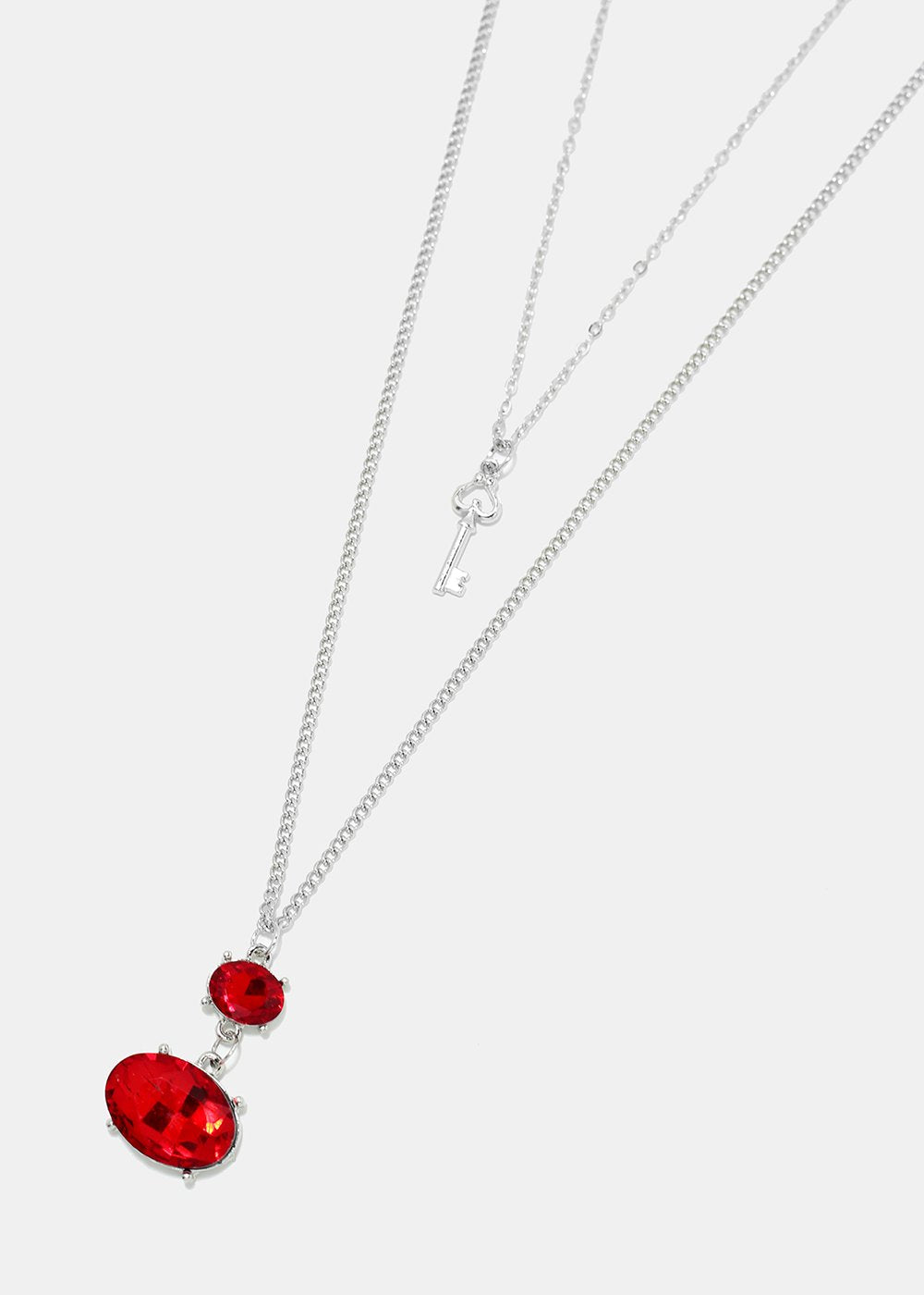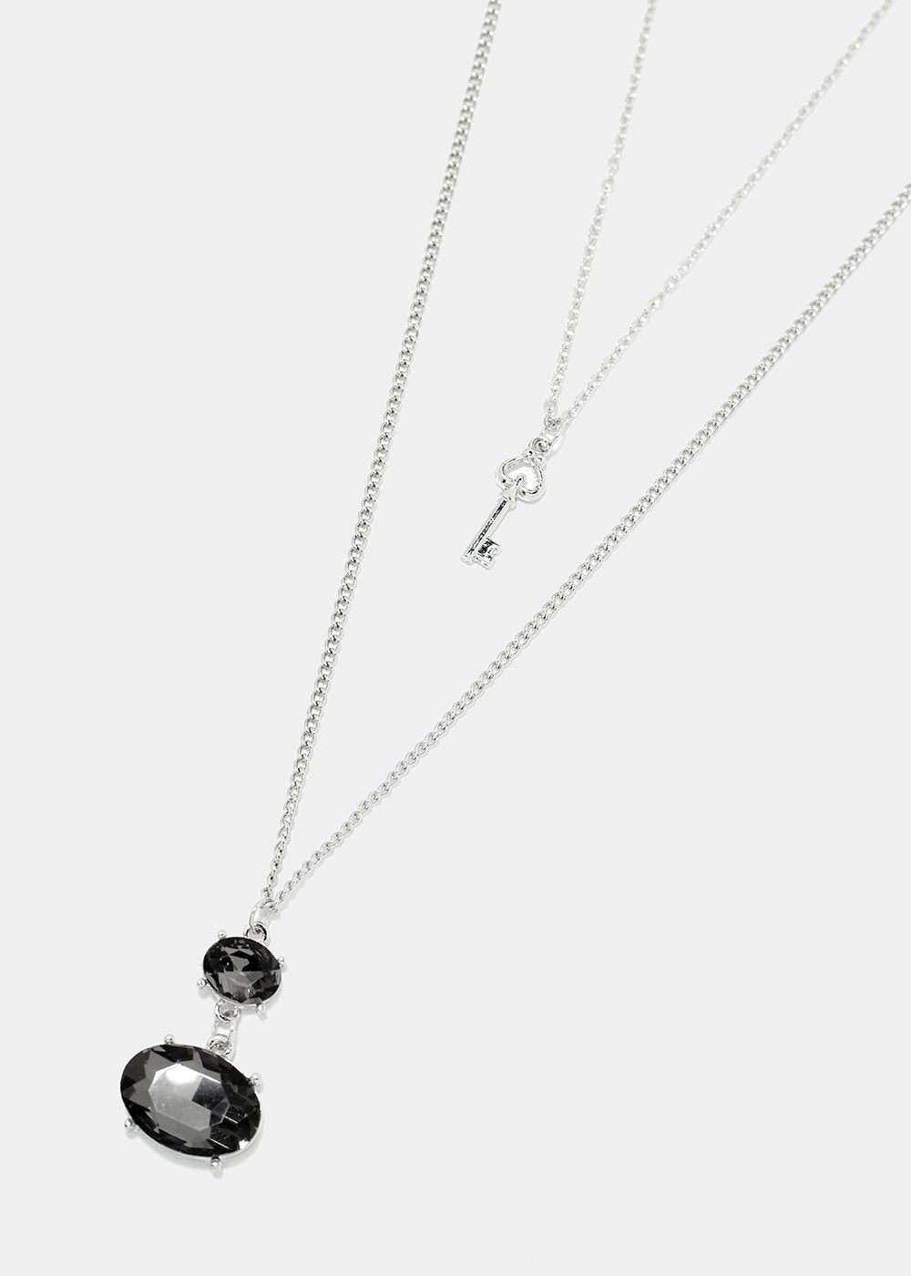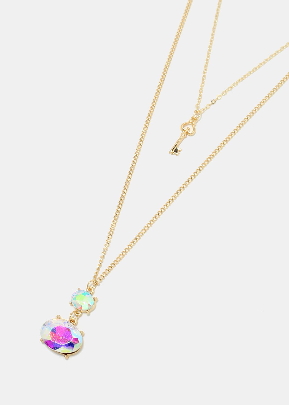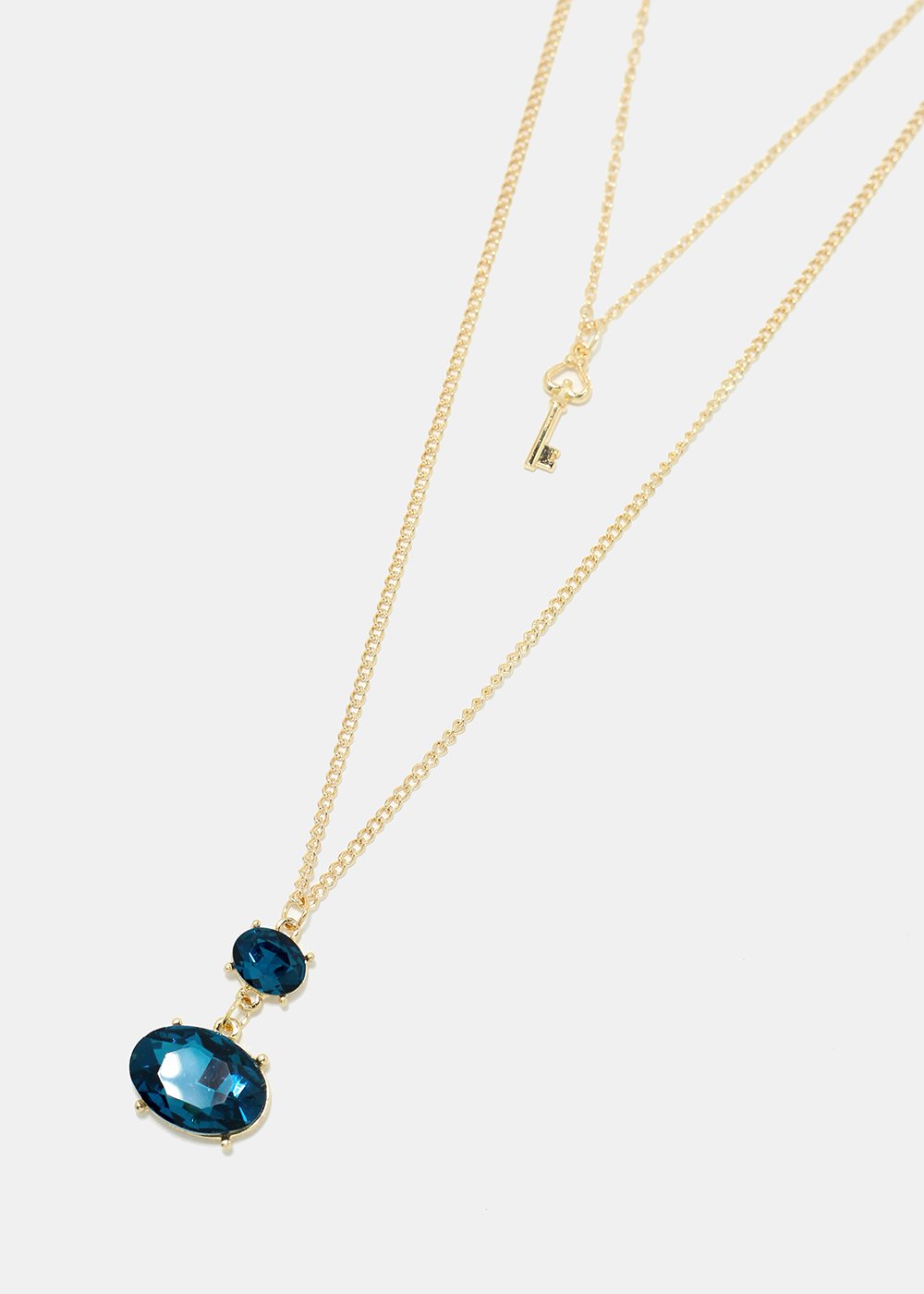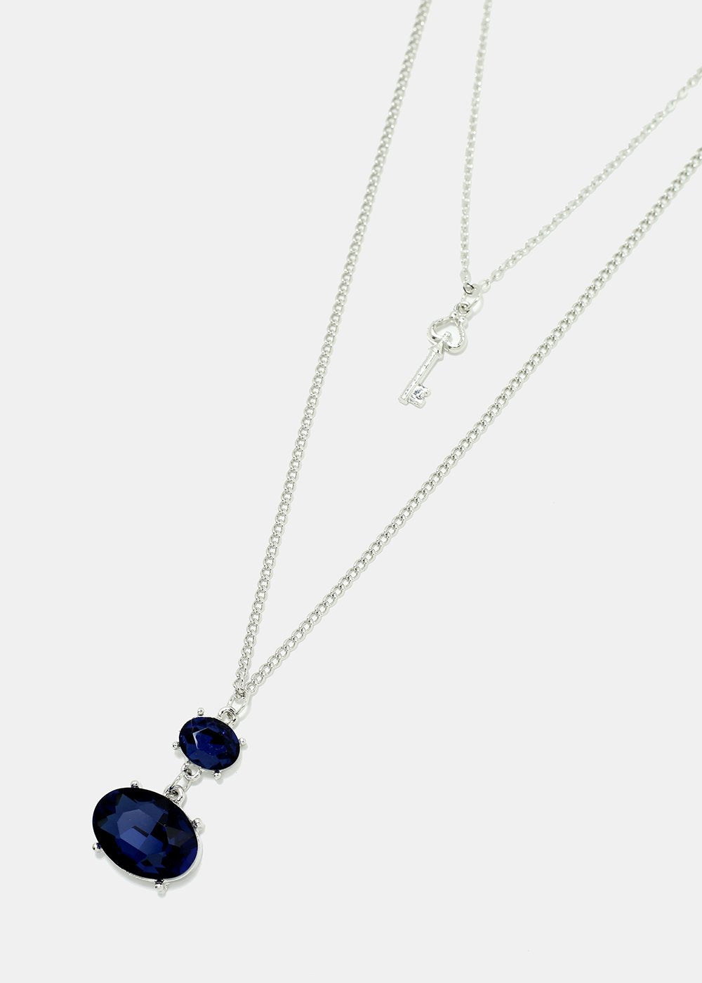 Layered chain necklace featuring a shiny colorful gemstone & key pendant. A nice piece to go with just about any look from a causal fit to a special occasion.