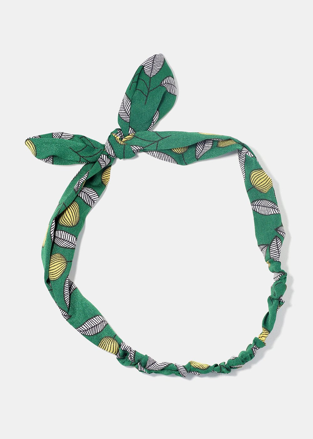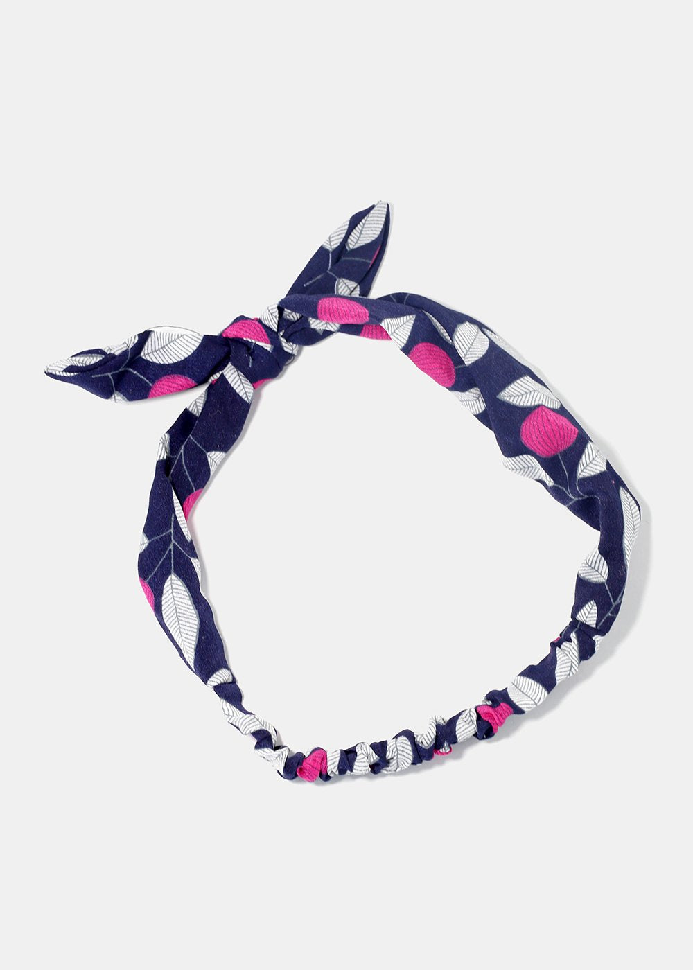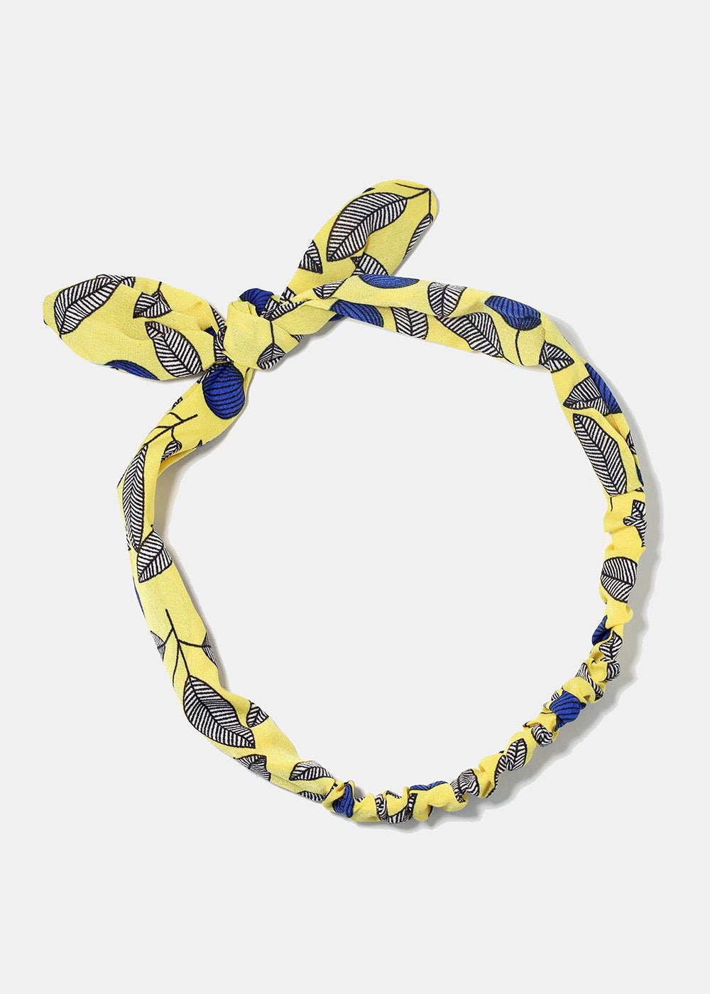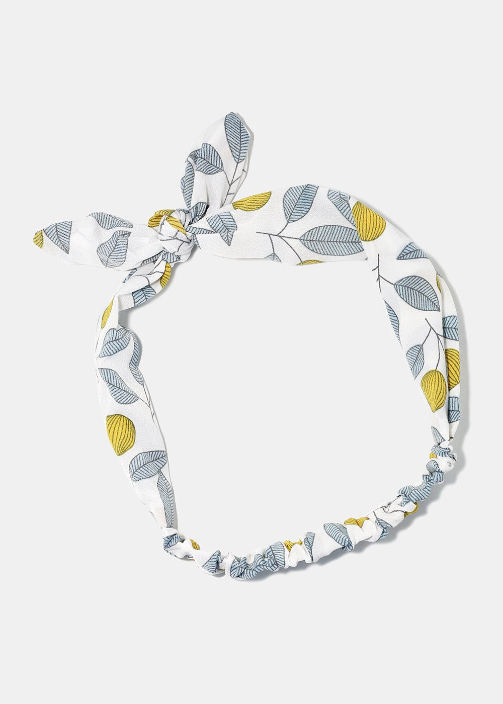 Scrunched elastic headband featuring bunny-ear bow and multi-color leaf print. An adorable addition to your casual attire!