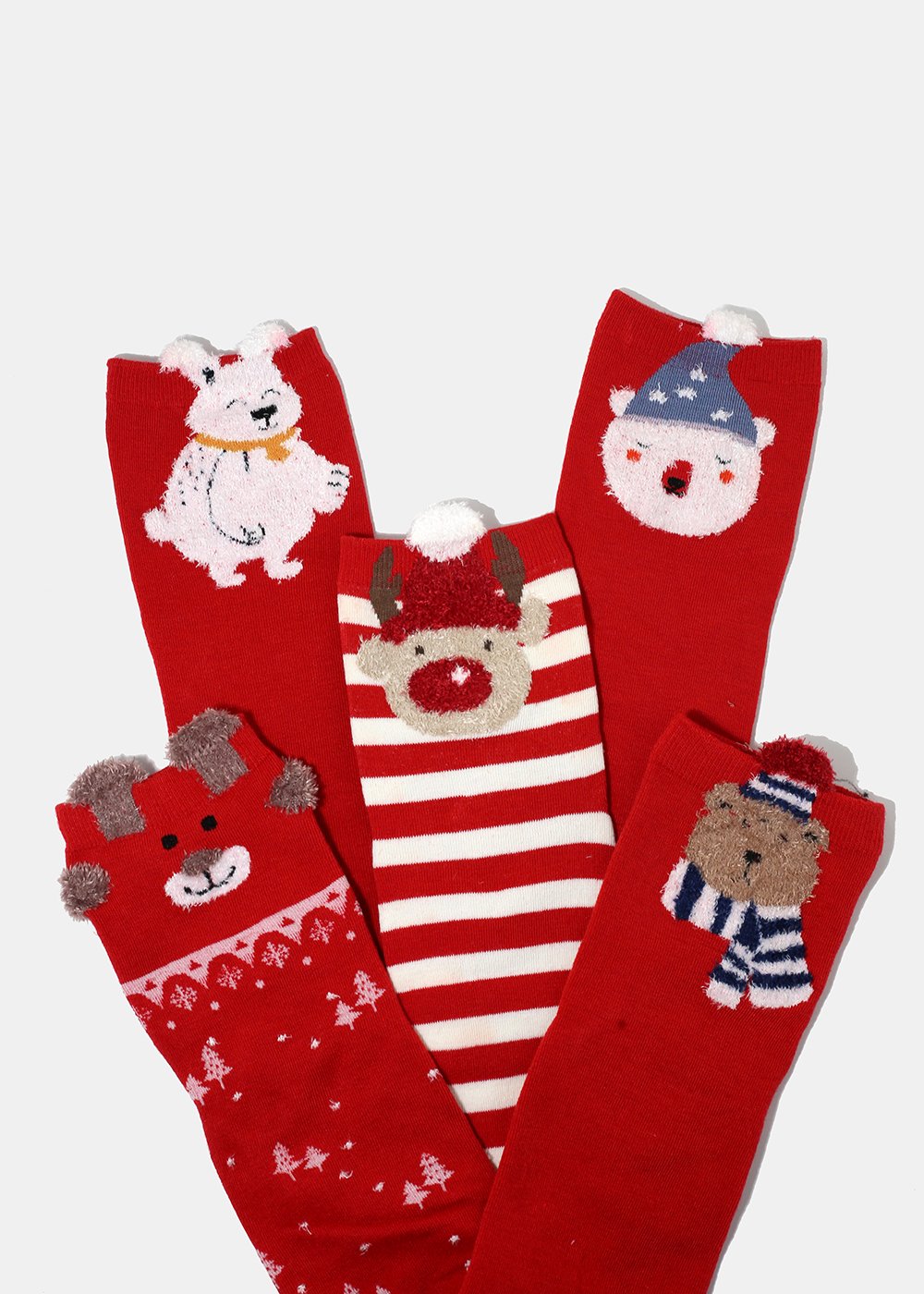 Get in the holiday spirit with these adorable crew socks featuring striped, solid and snowflake patterns and adorable characters with fuzzy details at top. A cute and fun addition to your sock collection! Fits women's shoe sizes 5-10.