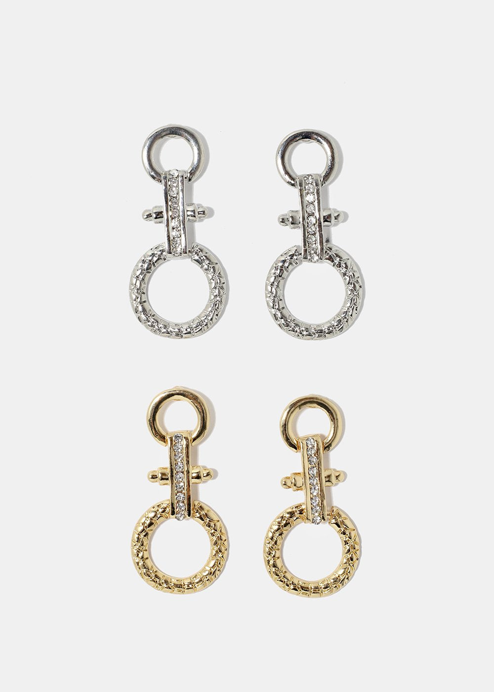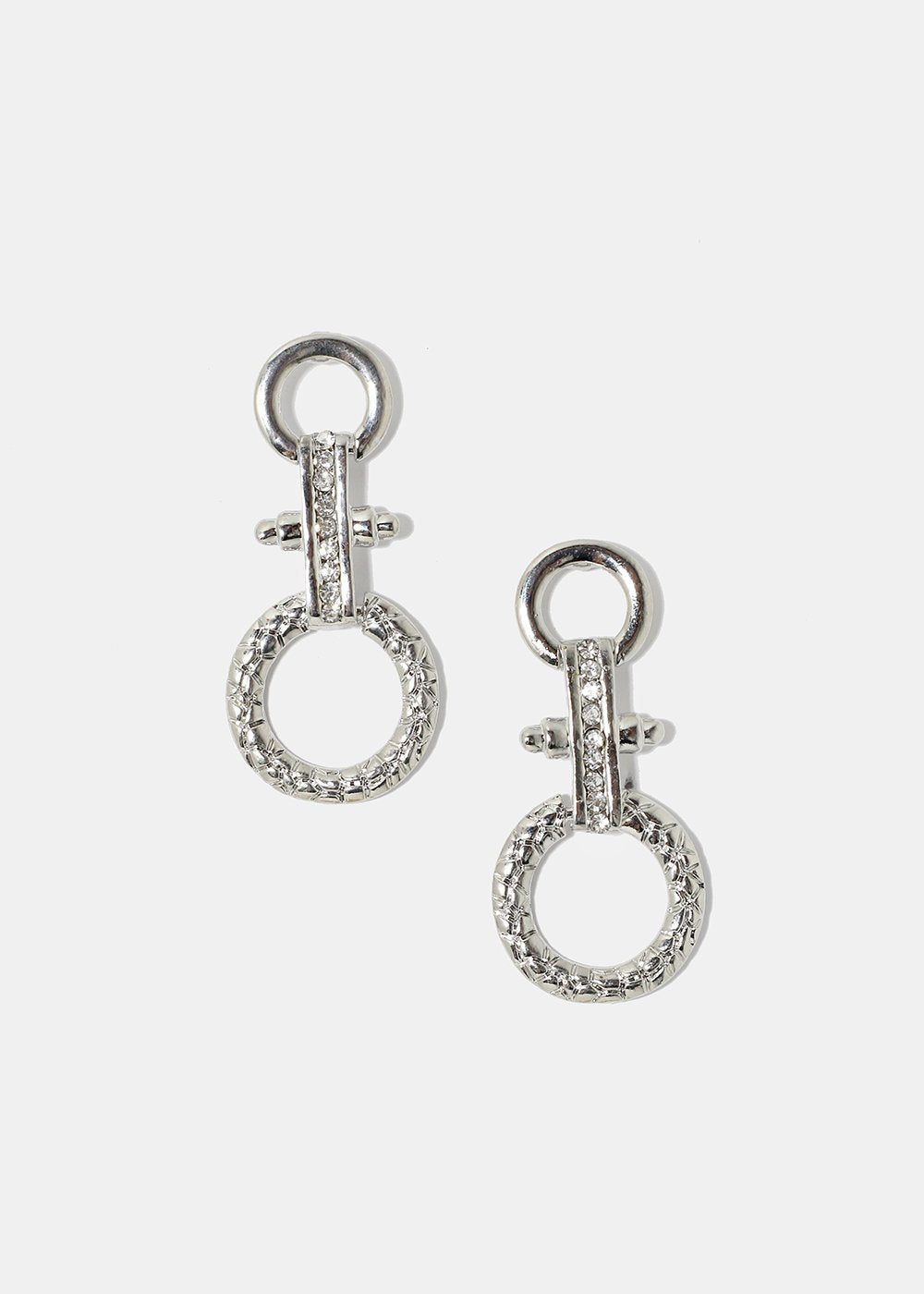 Unique dangle earrings featuring textured metal rings and rhinestone accents hanging from circle posts. A unique finish to both day and night attire!