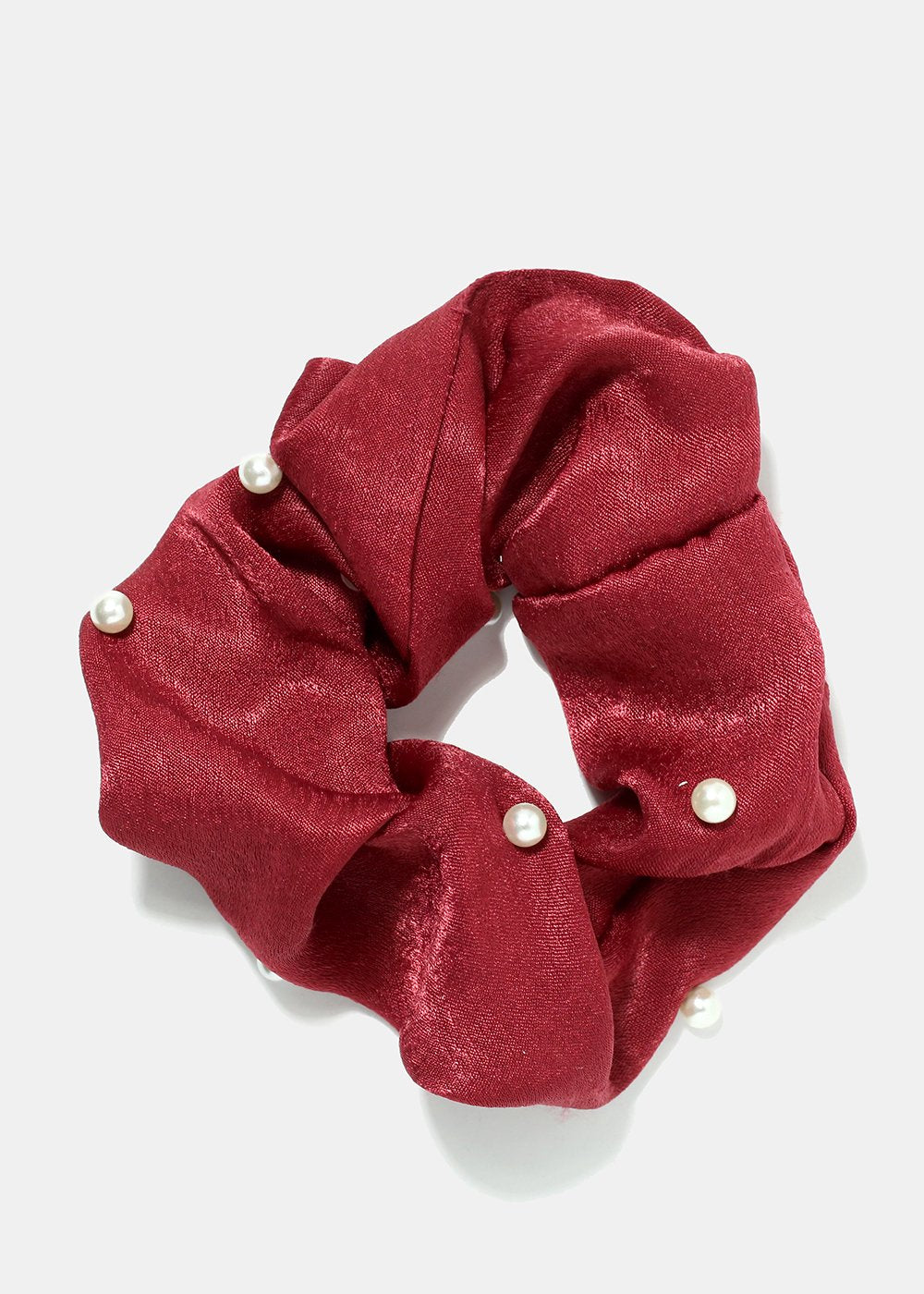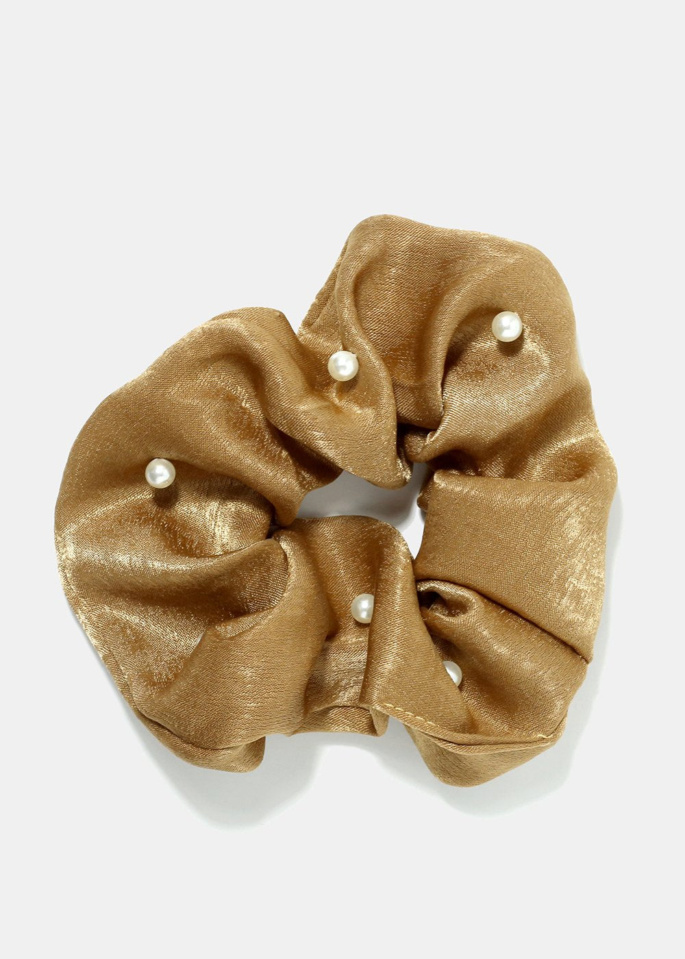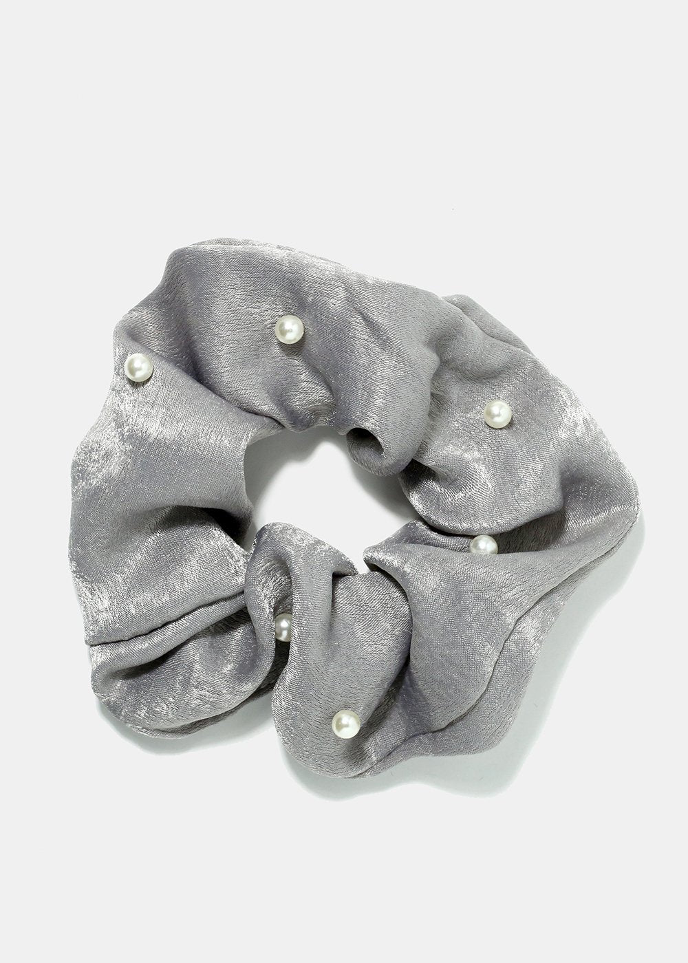 Soft scrunchies featuring shiny fabric and white pearl accents. Offers a chic touch to a casual hairstyle!