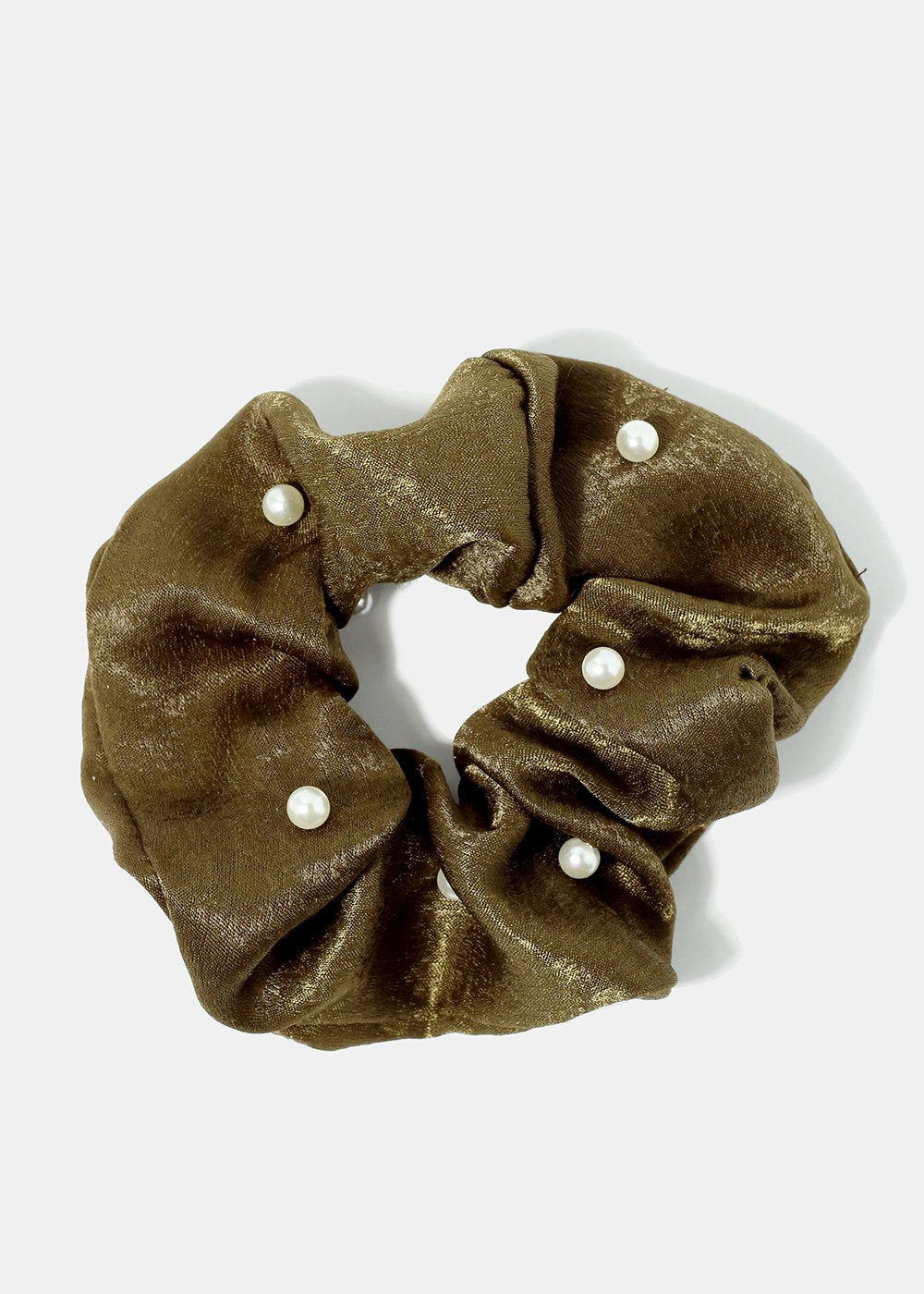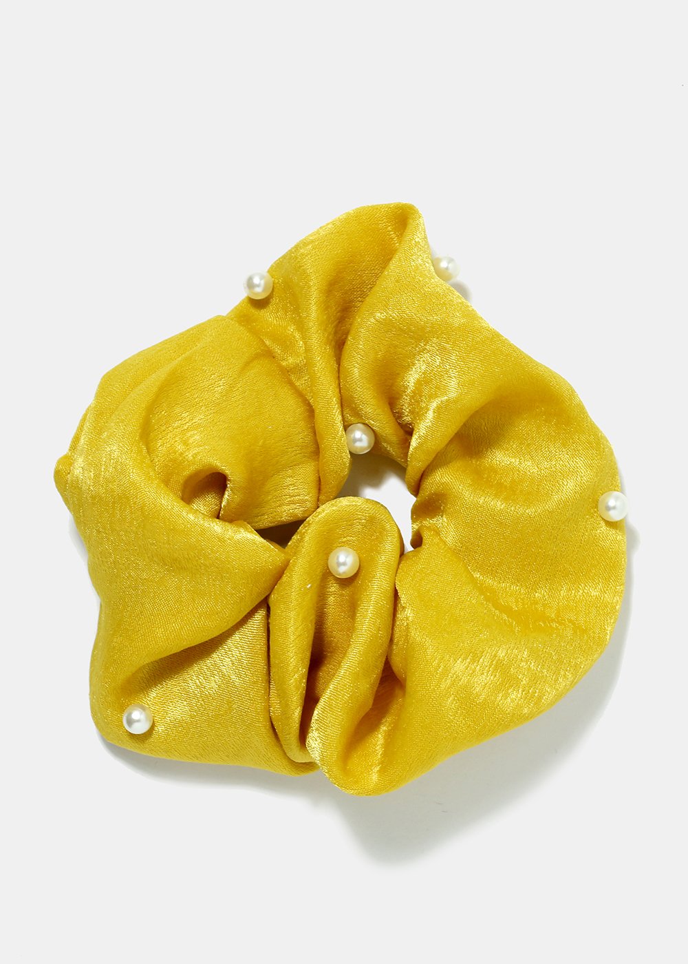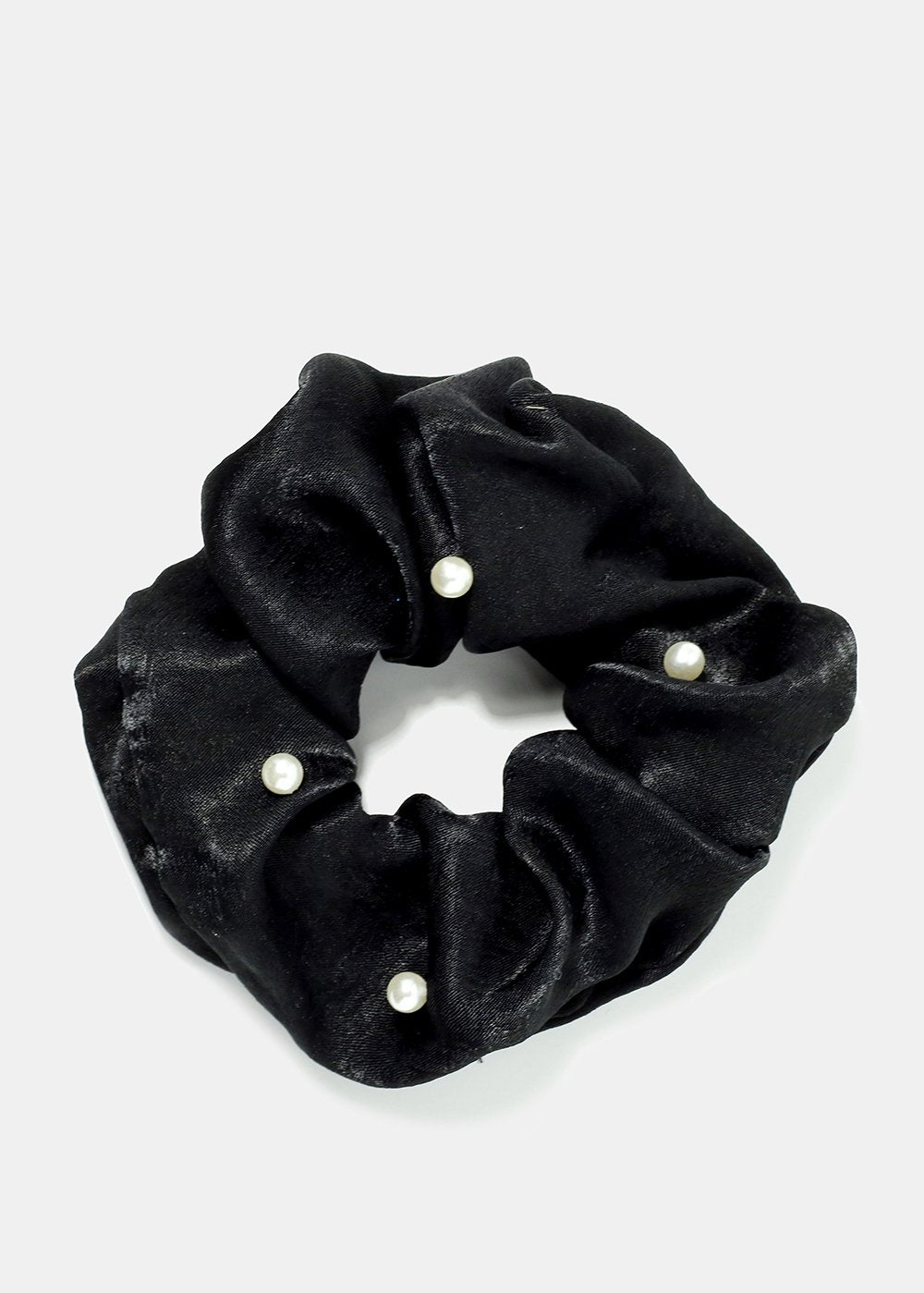 Soft scrunchies featuring shiny fabric and white pearl accents. Offers a chic touch to a casual hairstyle!