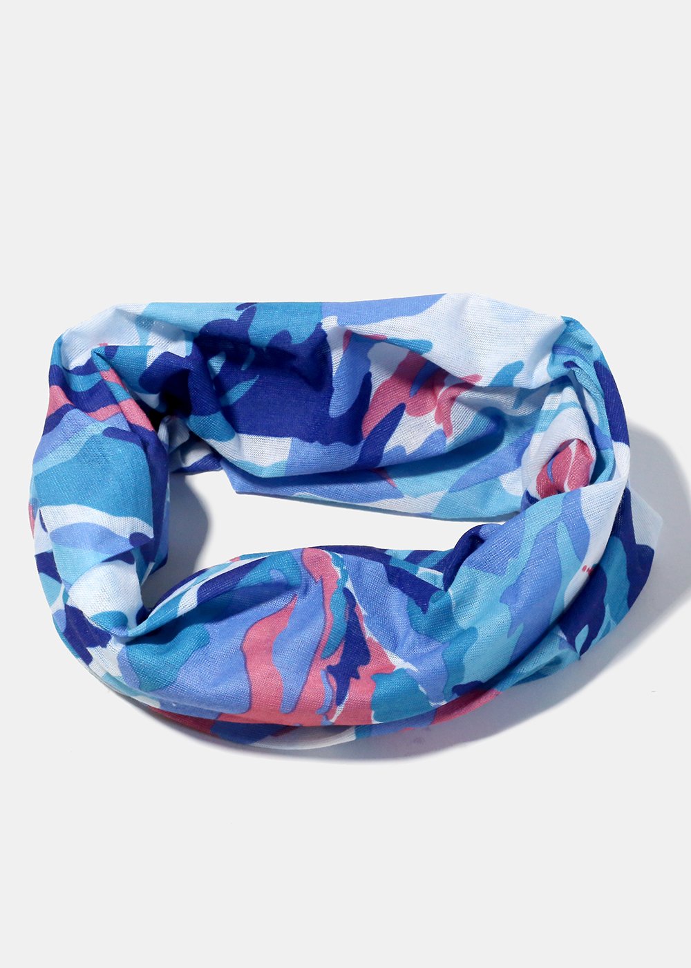 Soft and stretchy multi-use blue retro print face covering scarf. Perfect to cover your mouth, use as a scarf, or just about any other way you could image! Comfortable and soft for an all day wear!