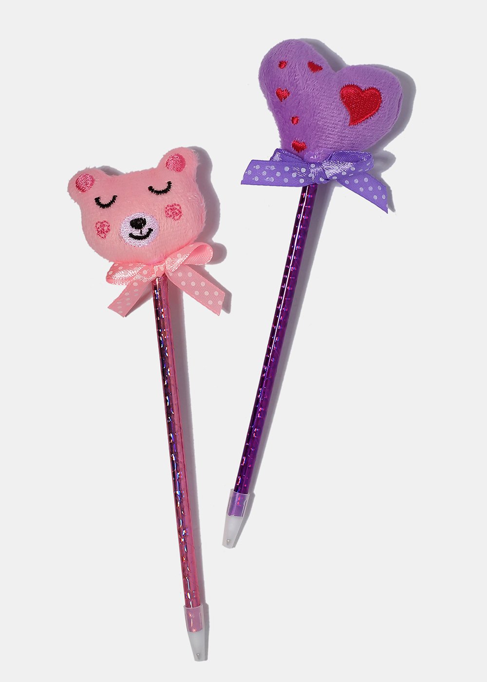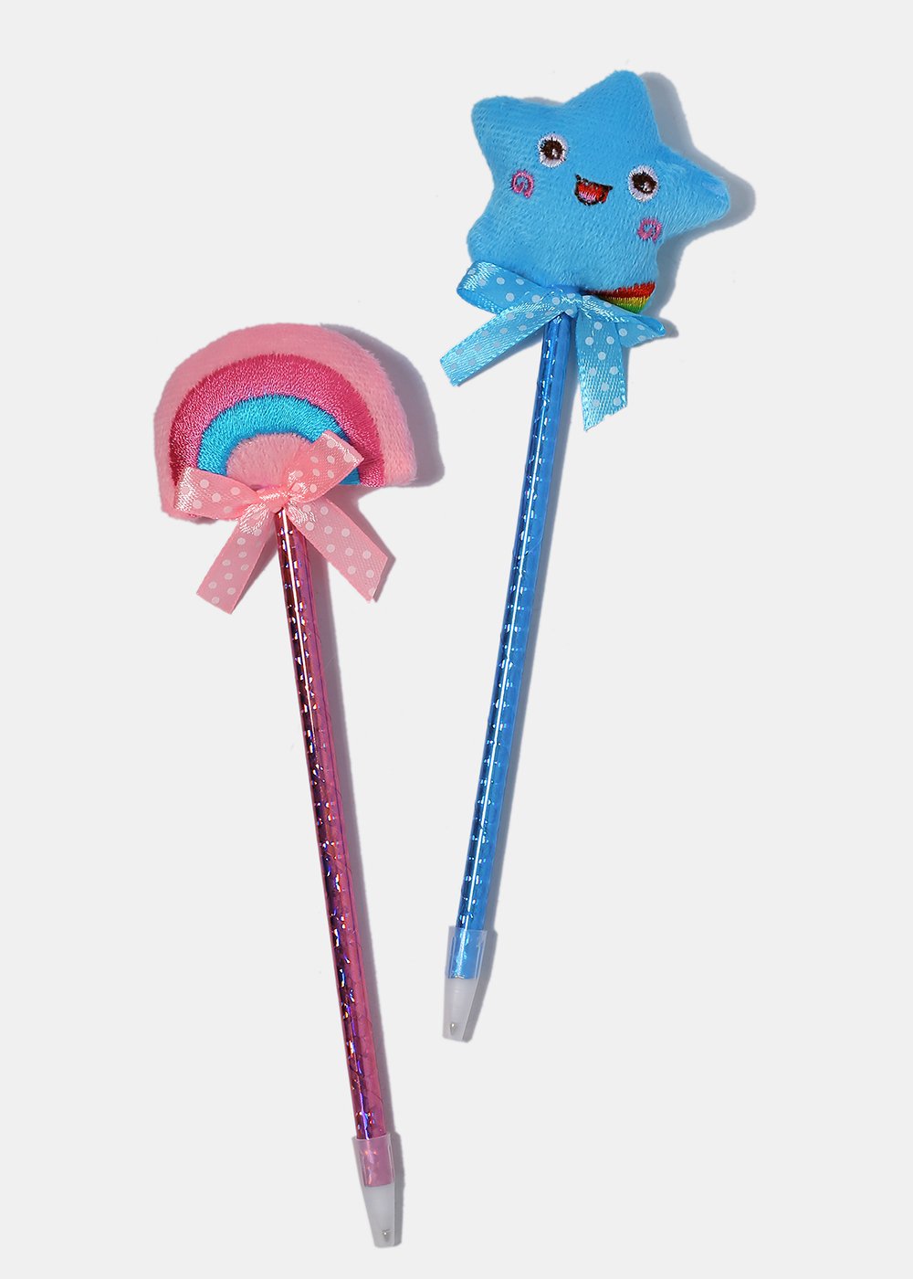 Add an impossibly cute touch to your pen collection with these ribbon wrapped pens featuring soft plush rainbow, star, bear and heart toppers. A whimsical and fun addition to desk or school supplies!
