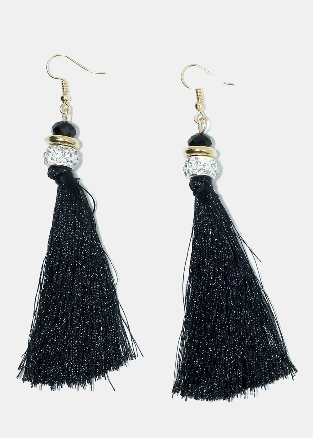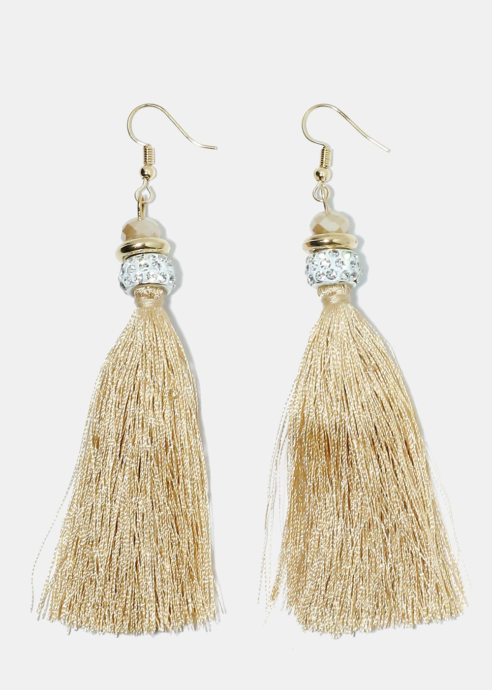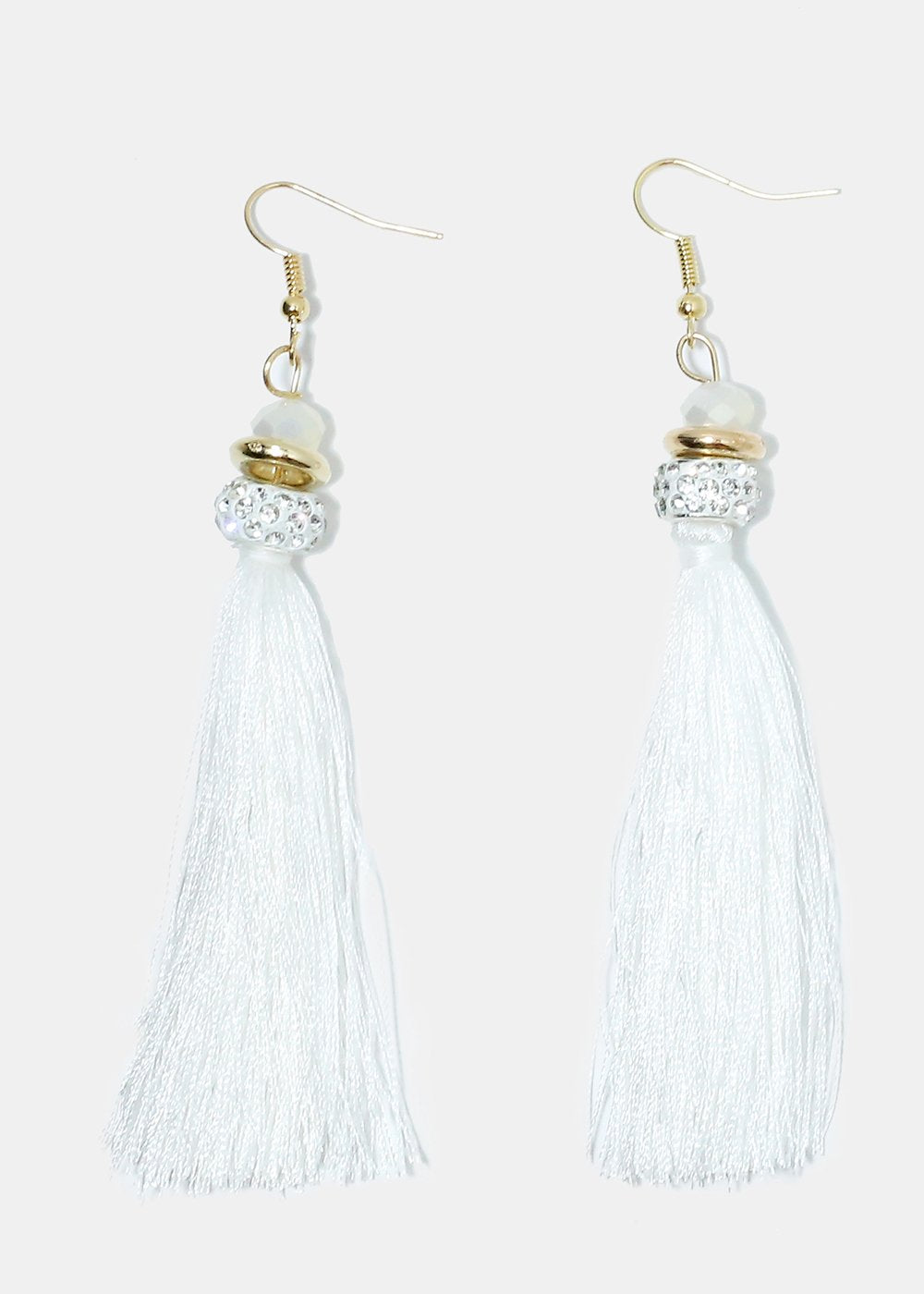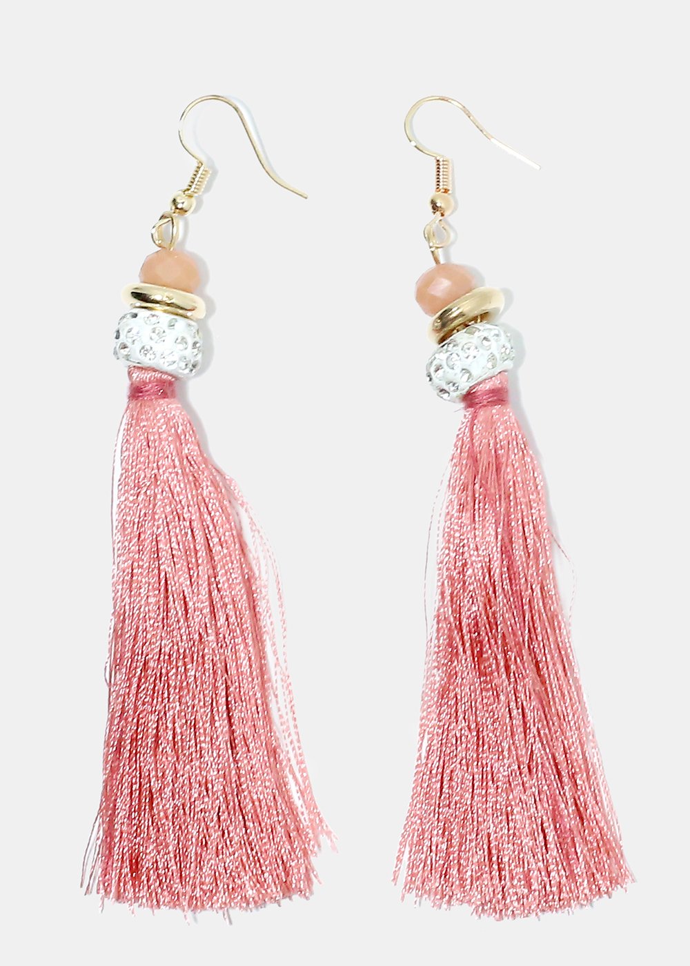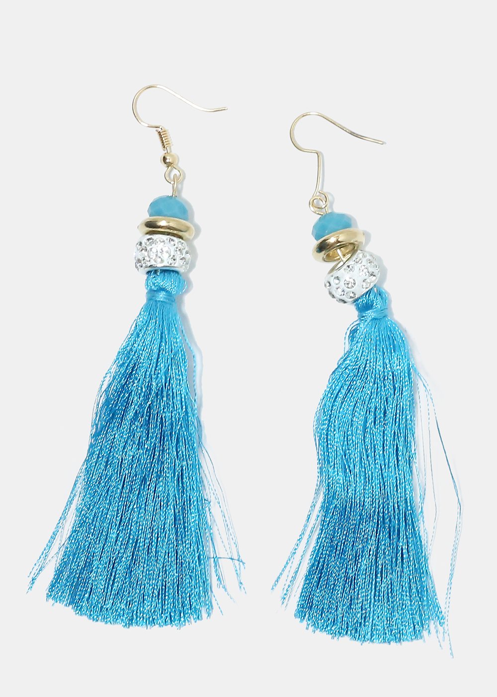 Colorful rhinestone bead & tassel earrings in multiple bright and vibrant colors. The perfect pair for this summer! Make a basic outfit into a beautiful ensemble.