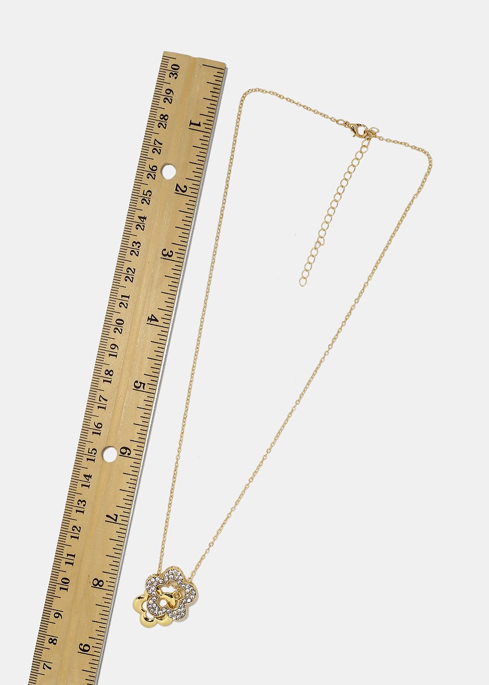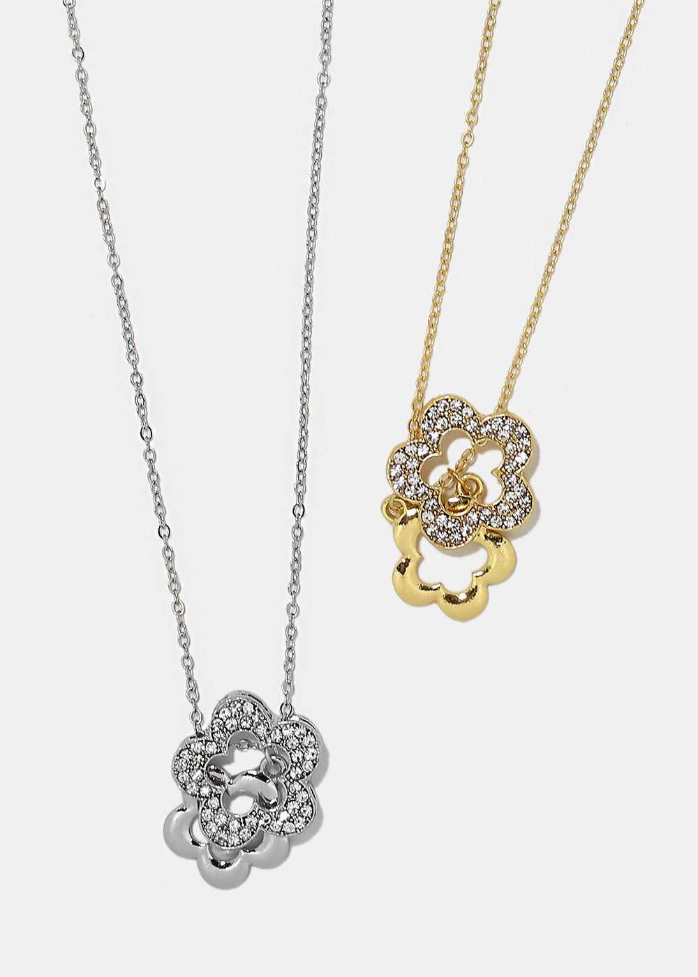 Delicate chain necklace featuring double flower pendant with rhinestone pavé detail. A sweet addition to your look for a little touch of sparkle!