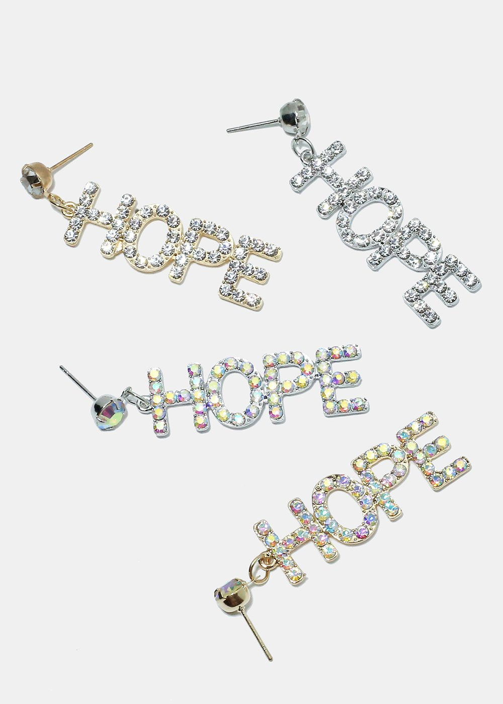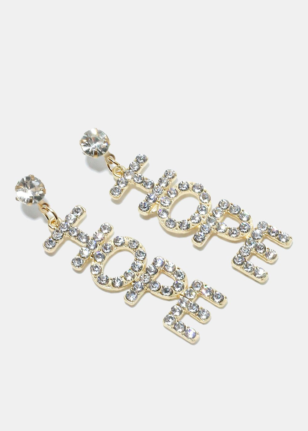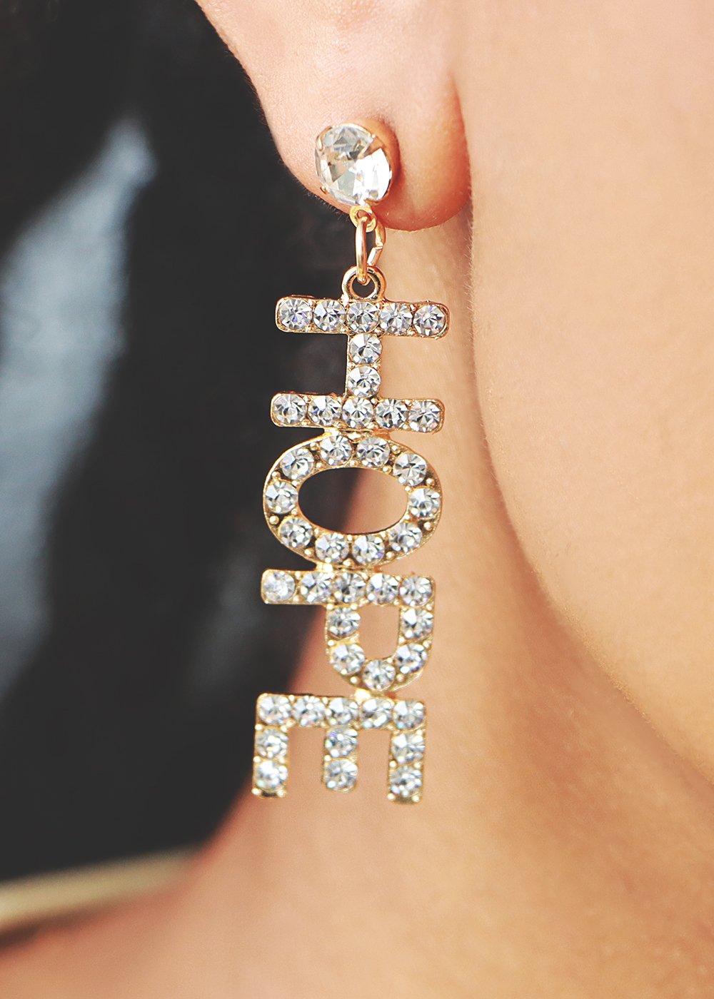 Make a fashion statement with these rhinestone studded "HOPE" earrings! A unique yet stylish touch to your look! Perfect for your glam looks.