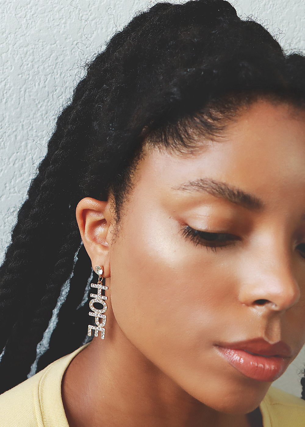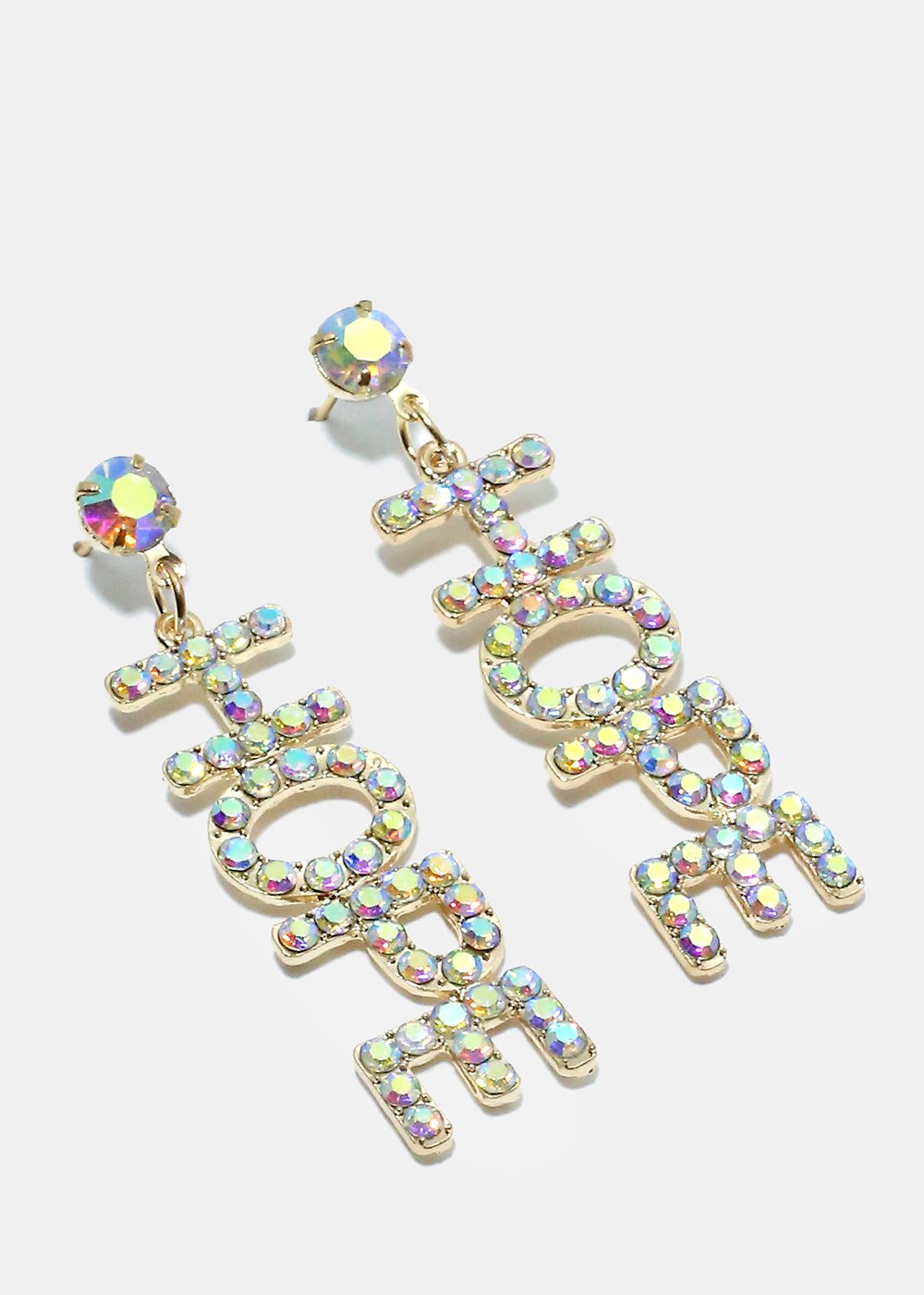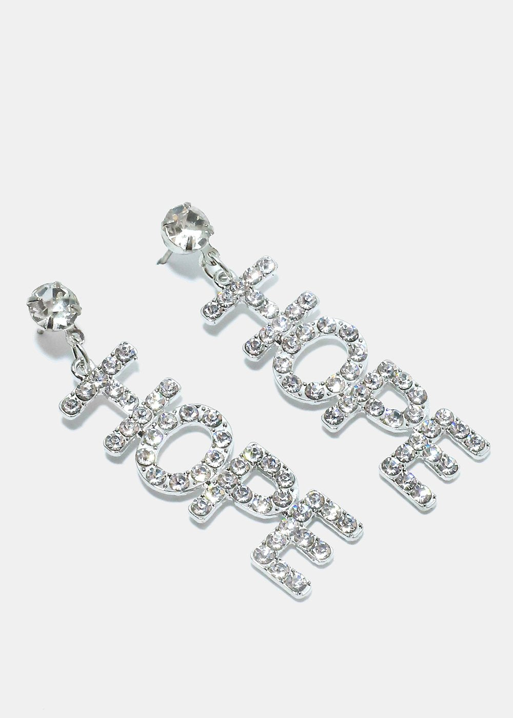 Make a fashion statement with these rhinestone studded "HOPE" earrings! A unique yet stylish touch to your look! Perfect for your glam looks.